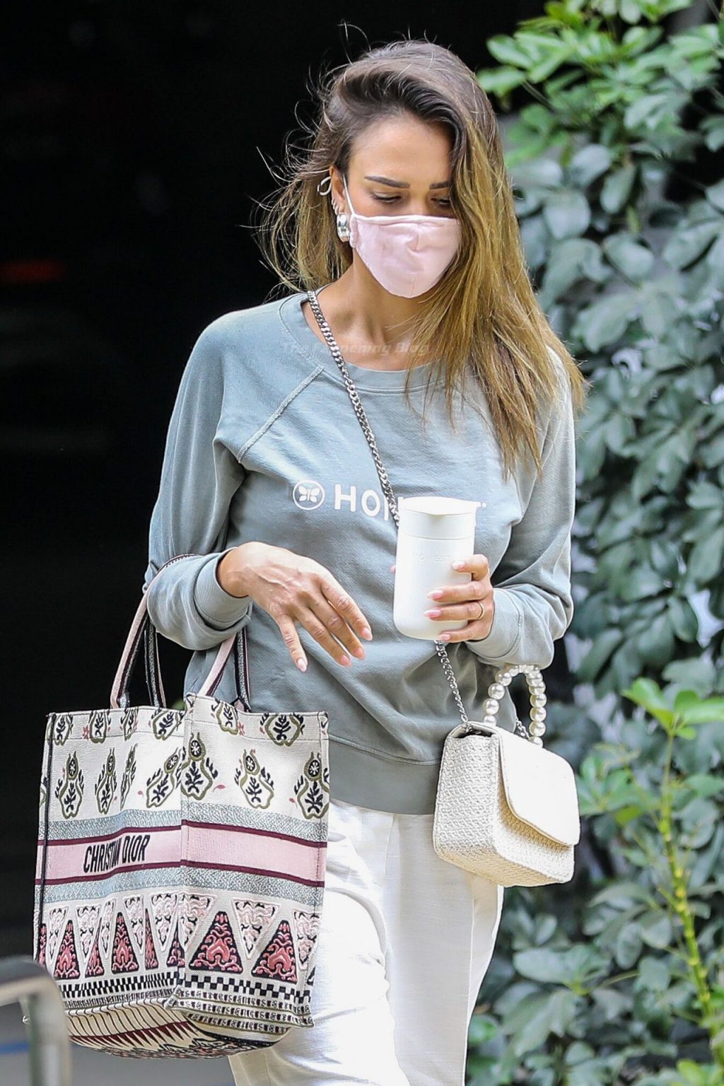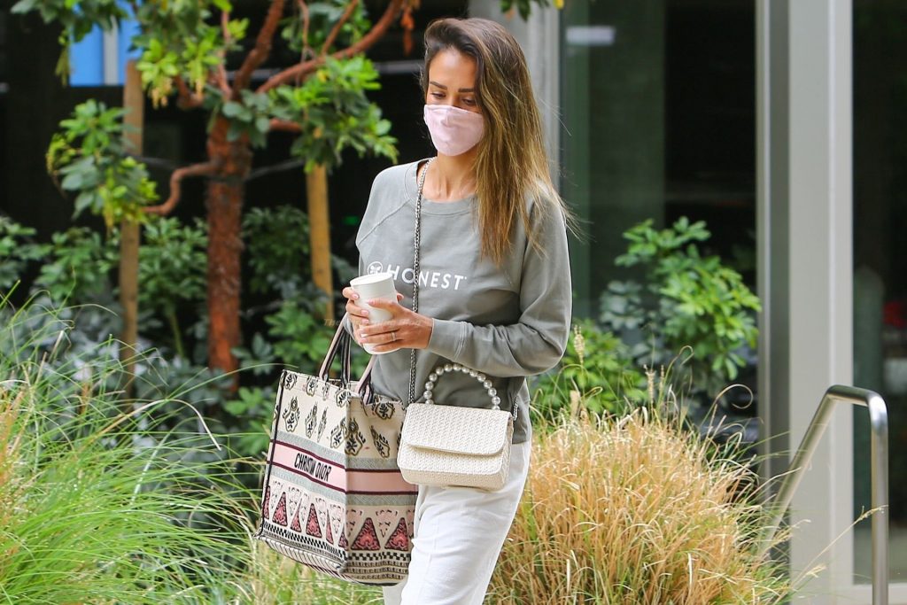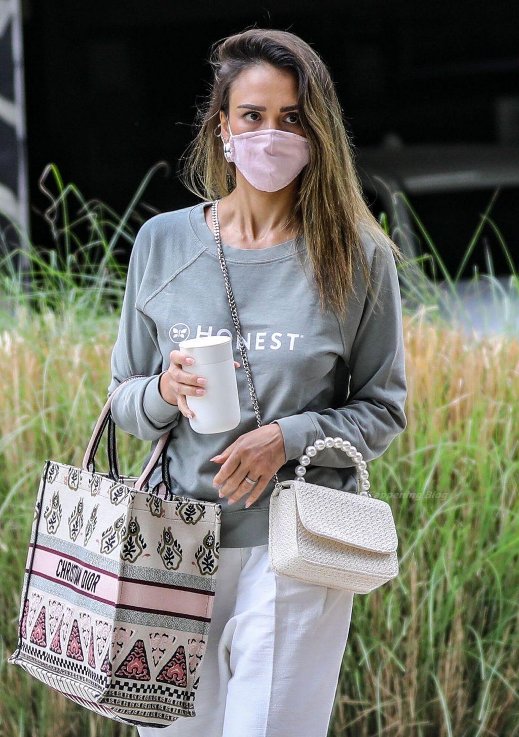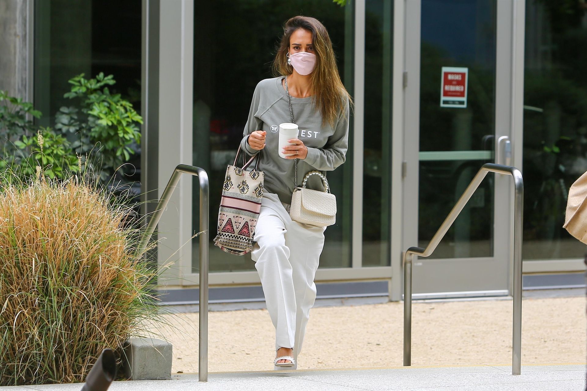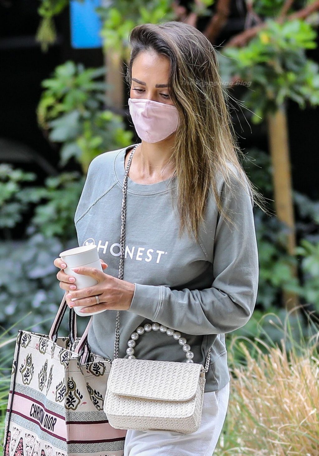 L’attrice Jessica Alba arriva al suo ufficio indossando una felpa Honest un giorno dopo che il titolo della società è sceso sotto il prezzo IPO di 16$ – Playa Vista, 12/05/2021.
