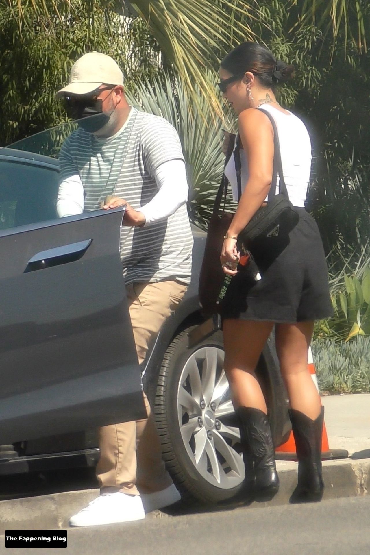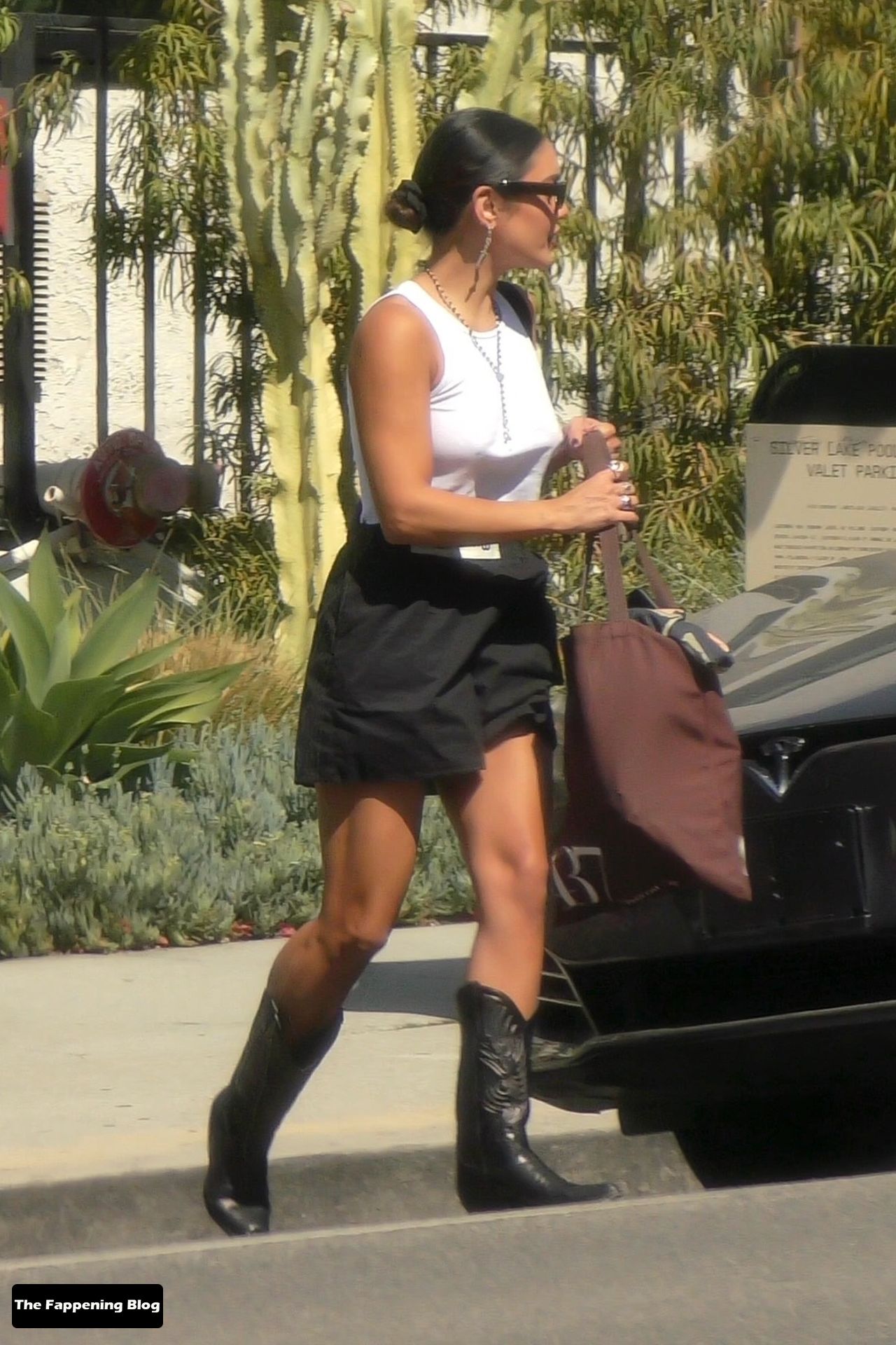La star bruna del Fappening ha raccolto i capelli in uno chignon, indossava una canottiera bianca e pantaloncini neri Miu Miu abbinati ai suoi stivali da cowgirl in pelle.