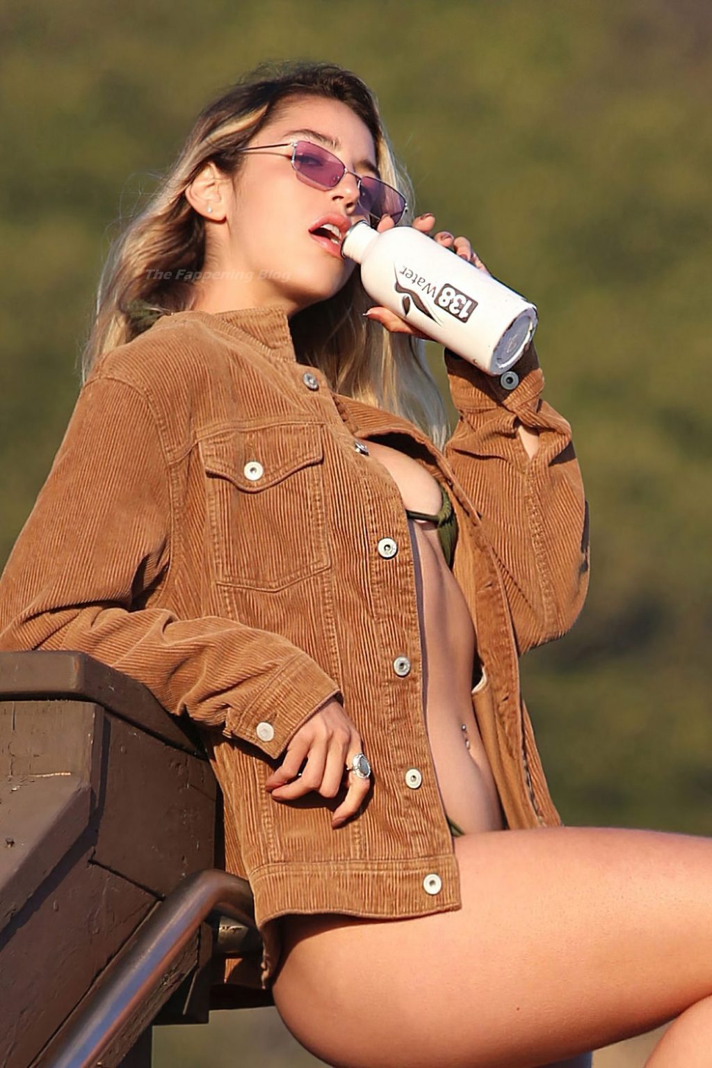 Ecco il sole! La modella colombiana Bridgette Audrey si sente dorata mentre posa per il marchio 138 a Malibu, 26/02/2021. La modella mette in mostra le sue curve con un sexy bikini oliva.