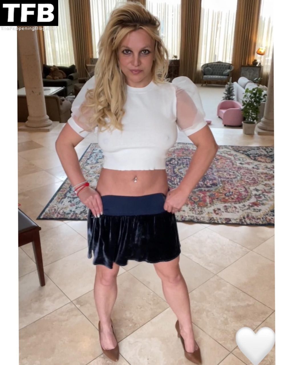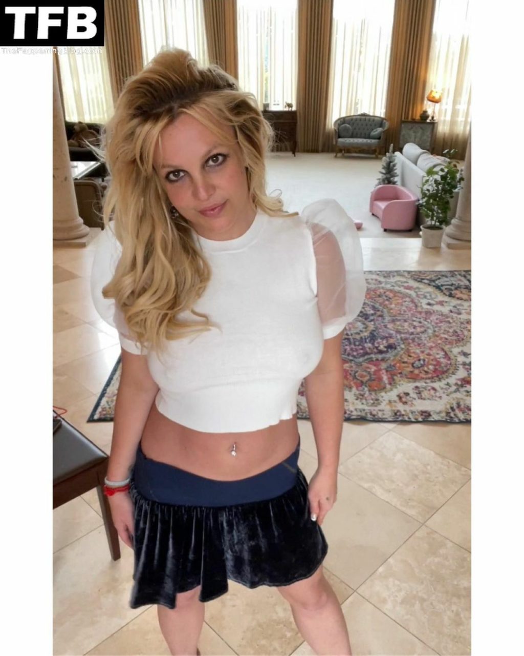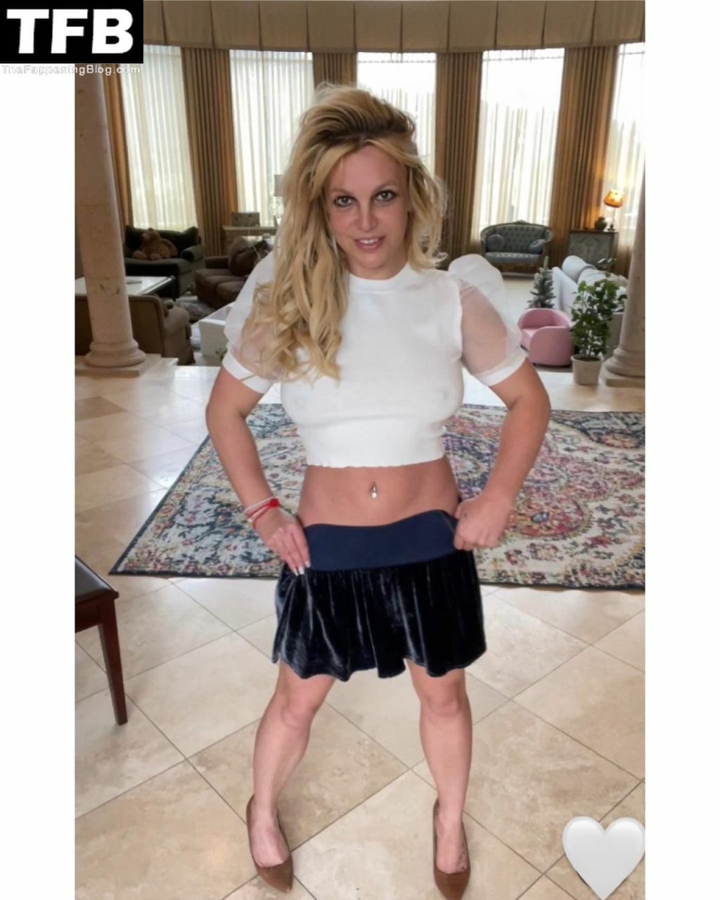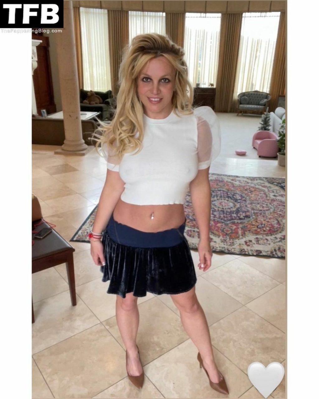 Singer Britney Spears posa senza reggiseno con una maglietta bianca e una gonna blu per i suoi follower nel suo account Instagram ripristinato, 18/03/2022.