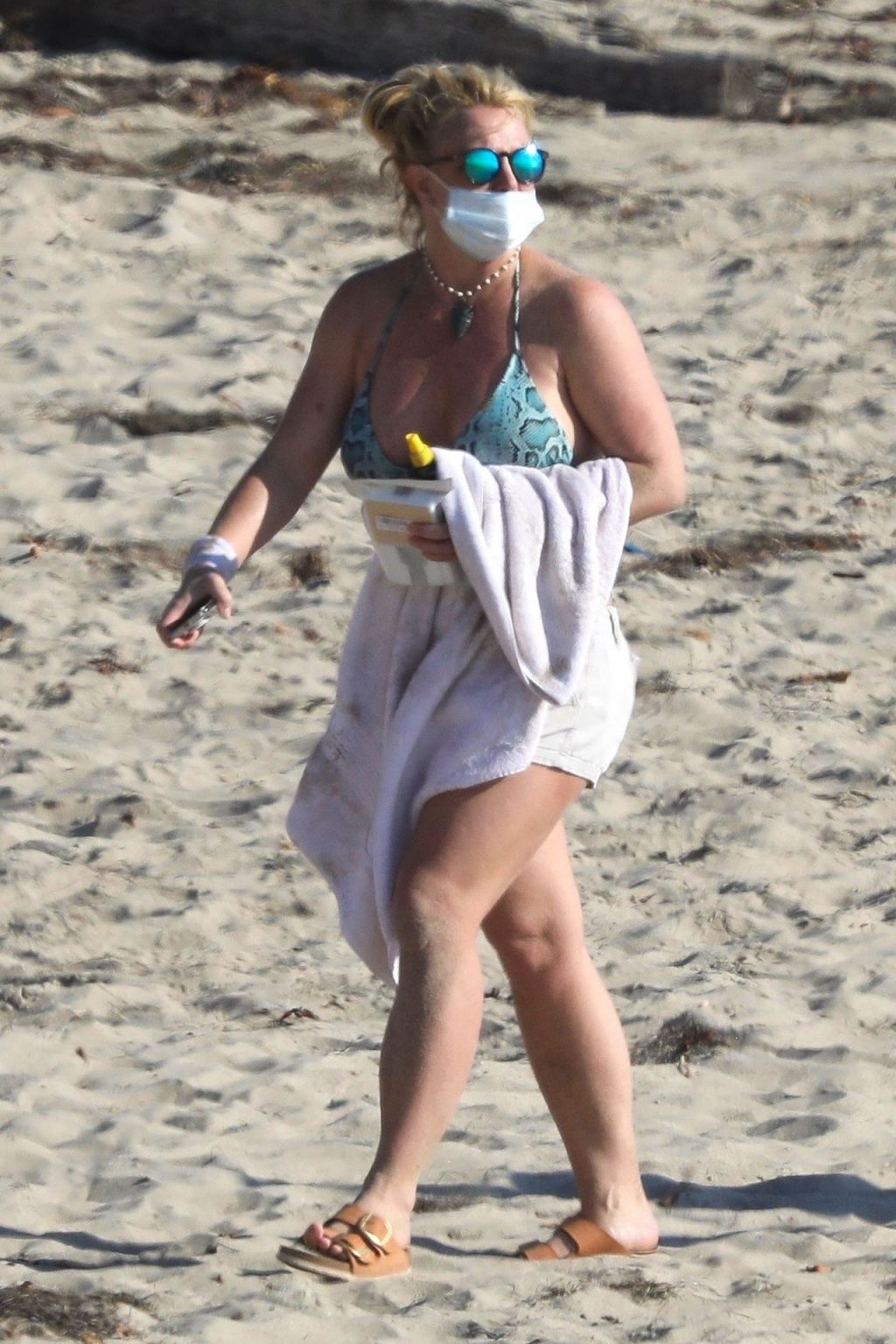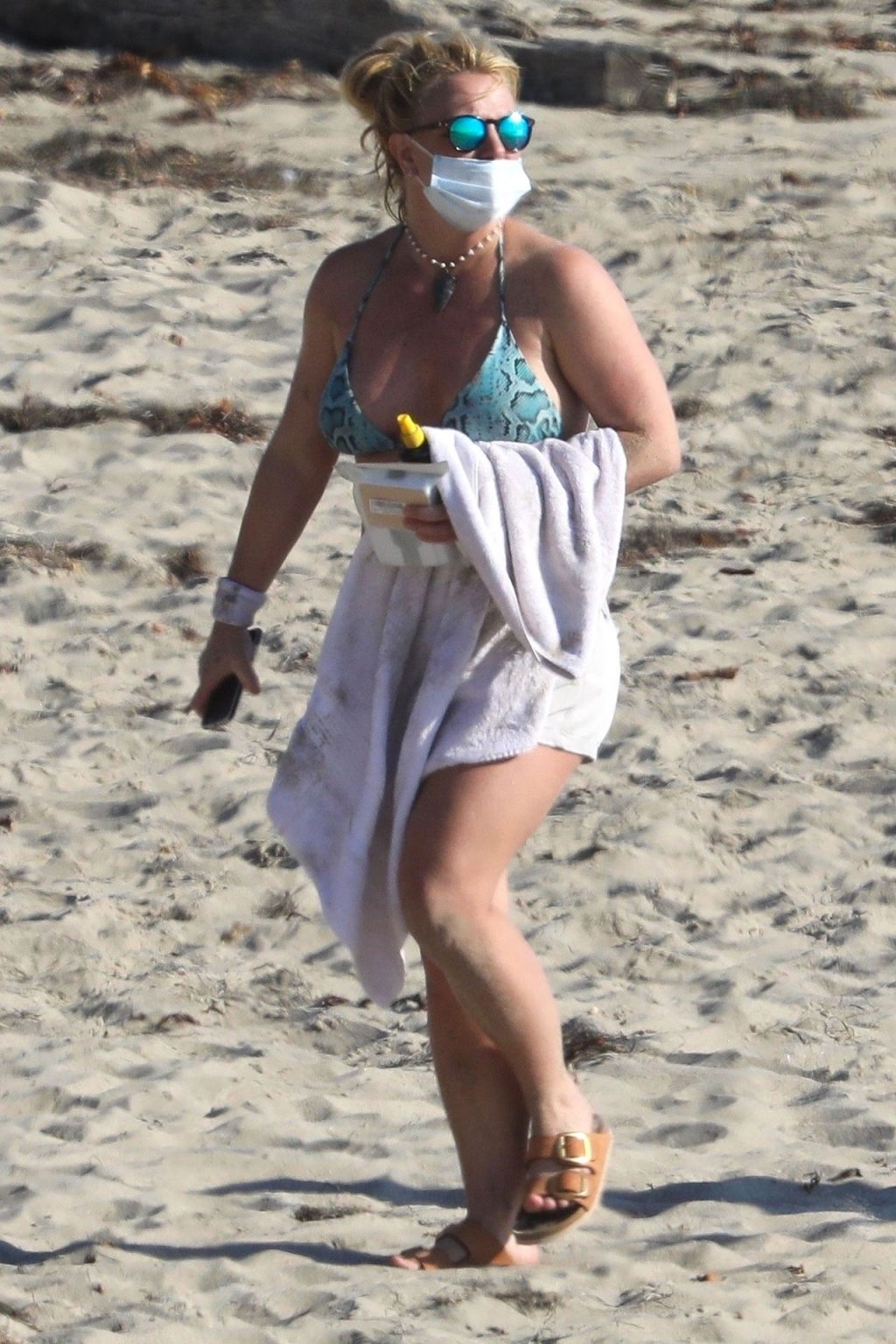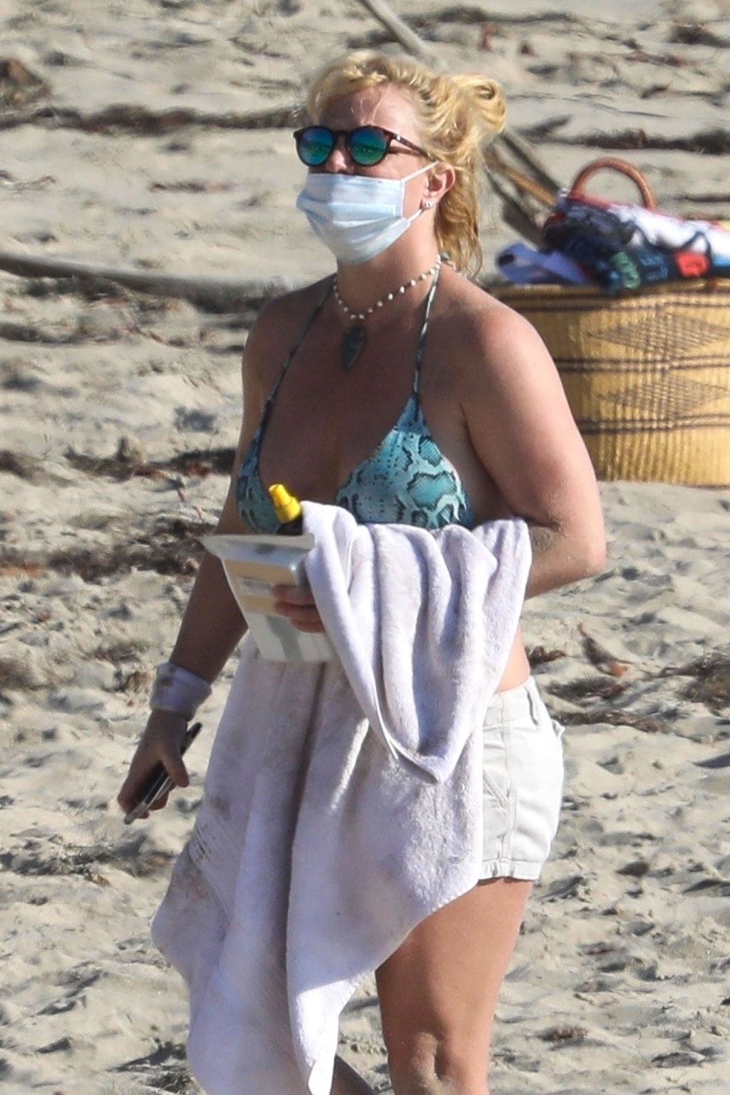 La cantautrice americana Britney Spears indossa la sua mascherina protettiva mentre prende il sole sulla spiaggia di Malibu, mostrando il suo corpo da spiaggia e indossando un bikini a due pezzi con stampa animalier sotto il sole cocente, 15/10/2020.