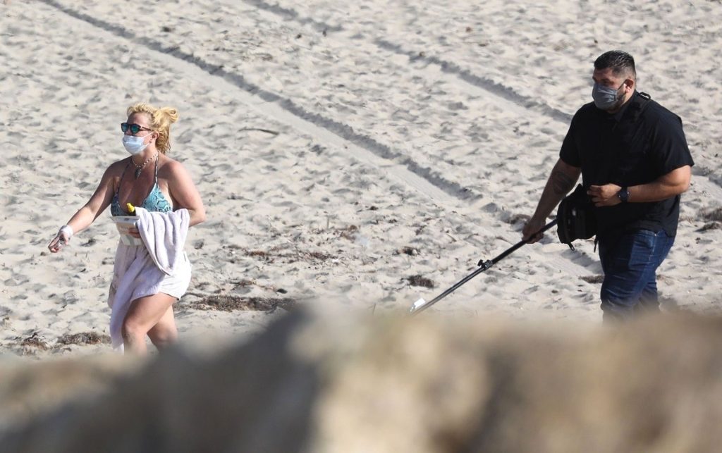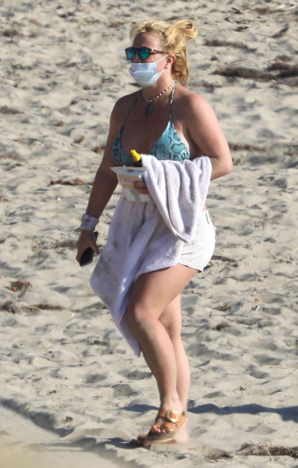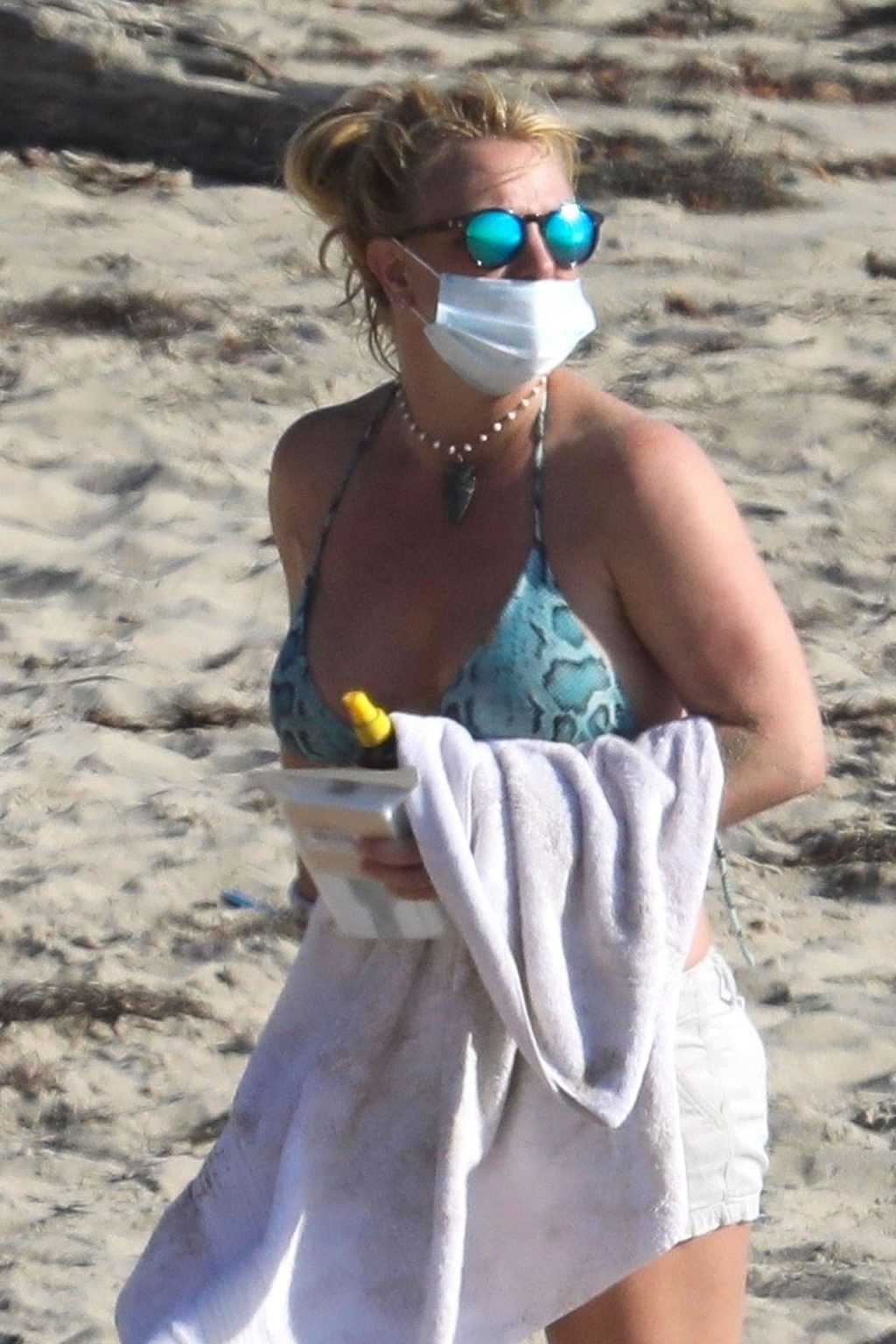 La cantautrice americana Britney Spears indossa la sua mascherina protettiva mentre prende il sole sulla spiaggia di Malibu, mostrando il suo corpo da spiaggia e indossando un bikini a due pezzi con stampa animalier sotto il sole cocente, 15/10/2020.