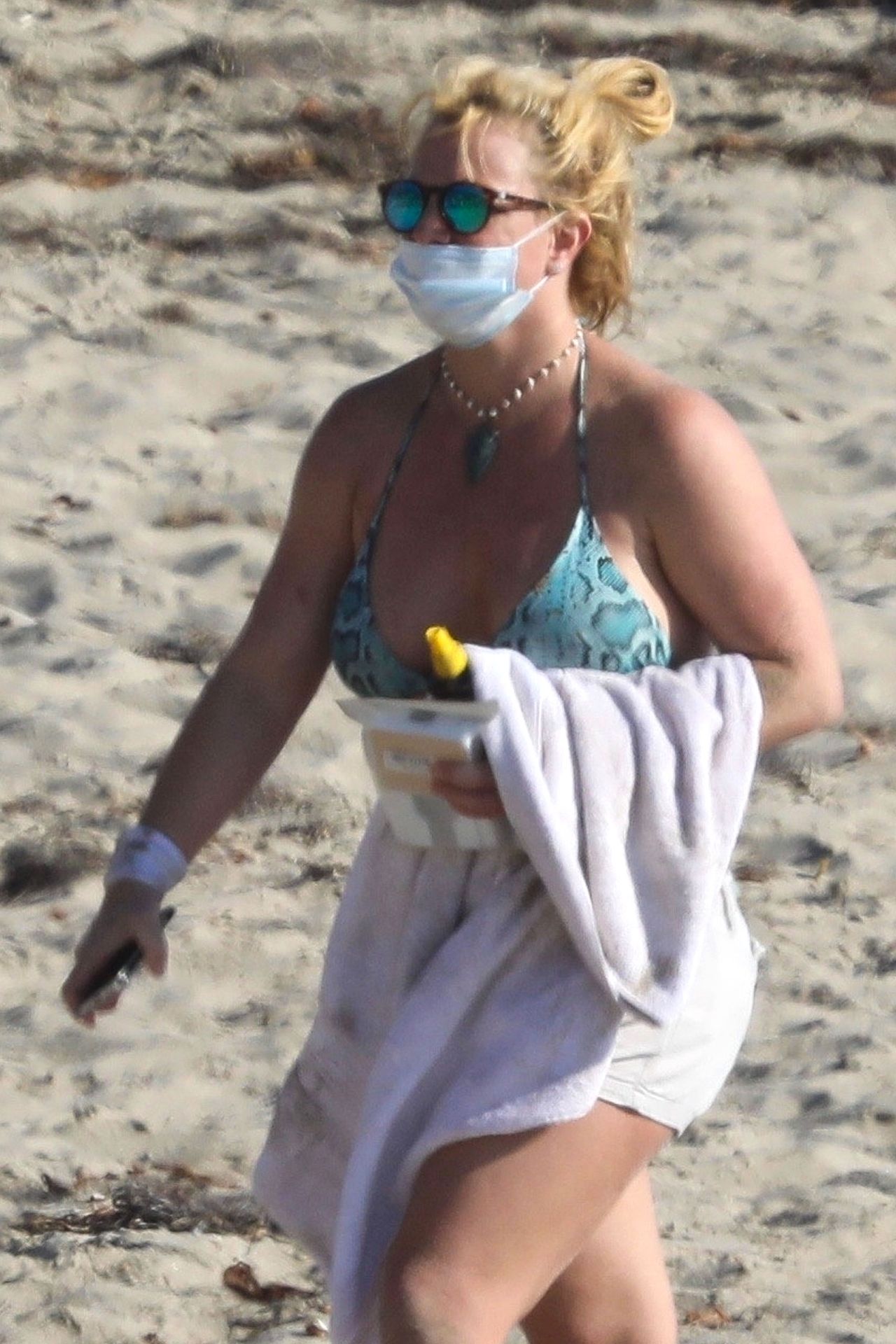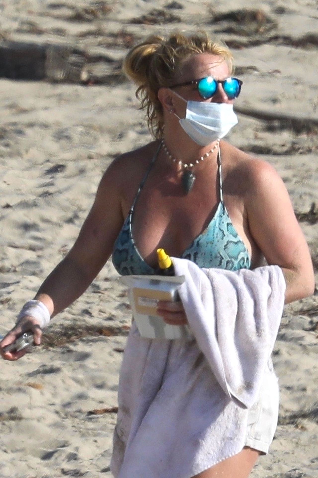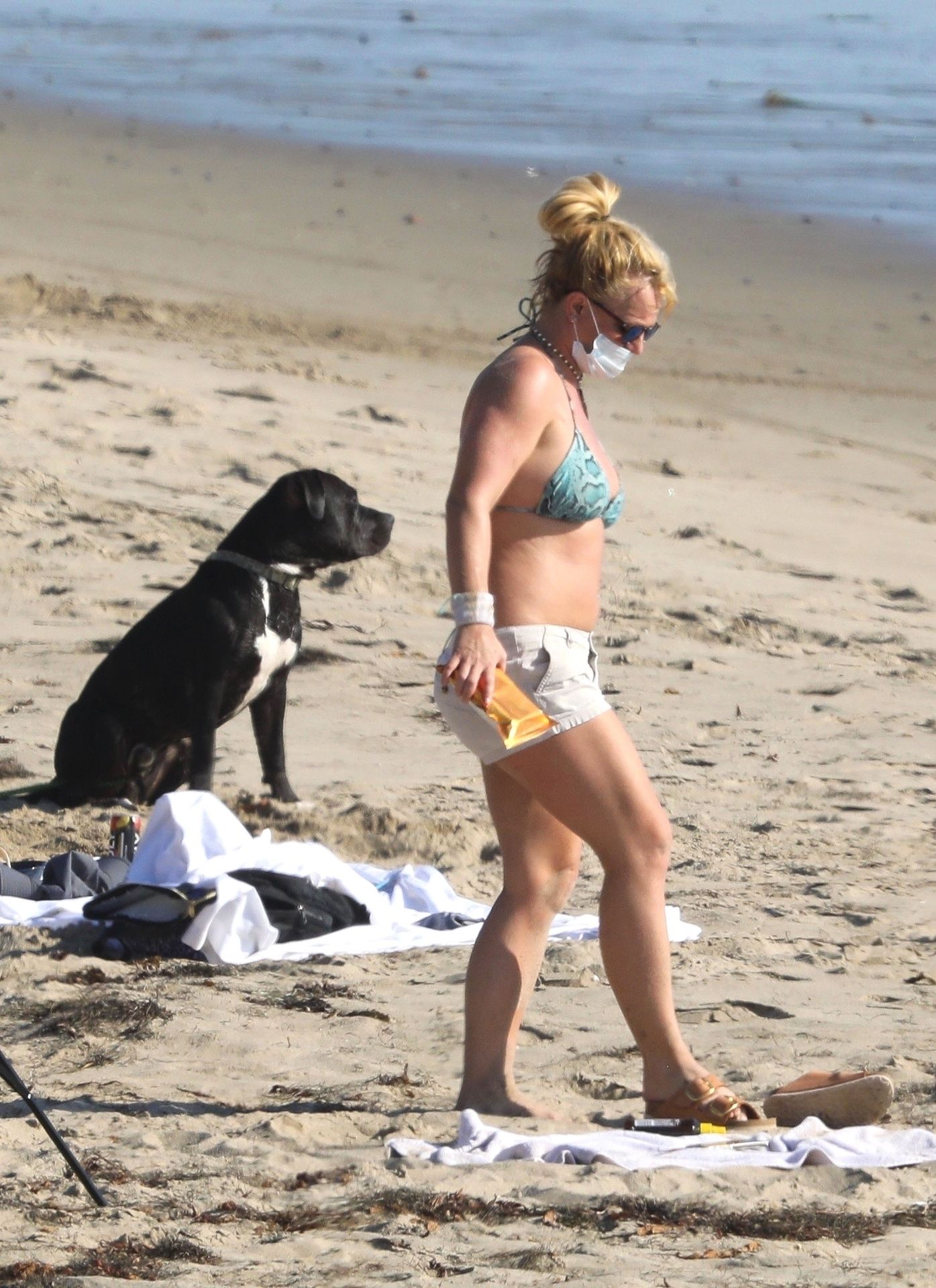 La cantautrice americana Britney Spears indossa la sua mascherina protettiva mentre prende il sole sulla spiaggia di Malibu, mostrando il suo corpo da spiaggia e indossando un bikini a due pezzi con stampa animalier sotto il sole cocente, 15/10/2020.