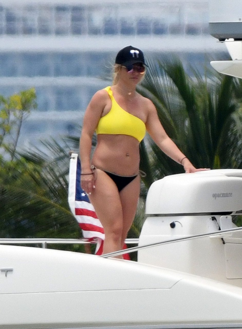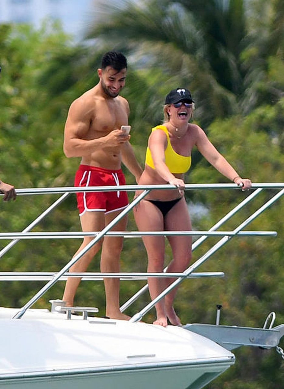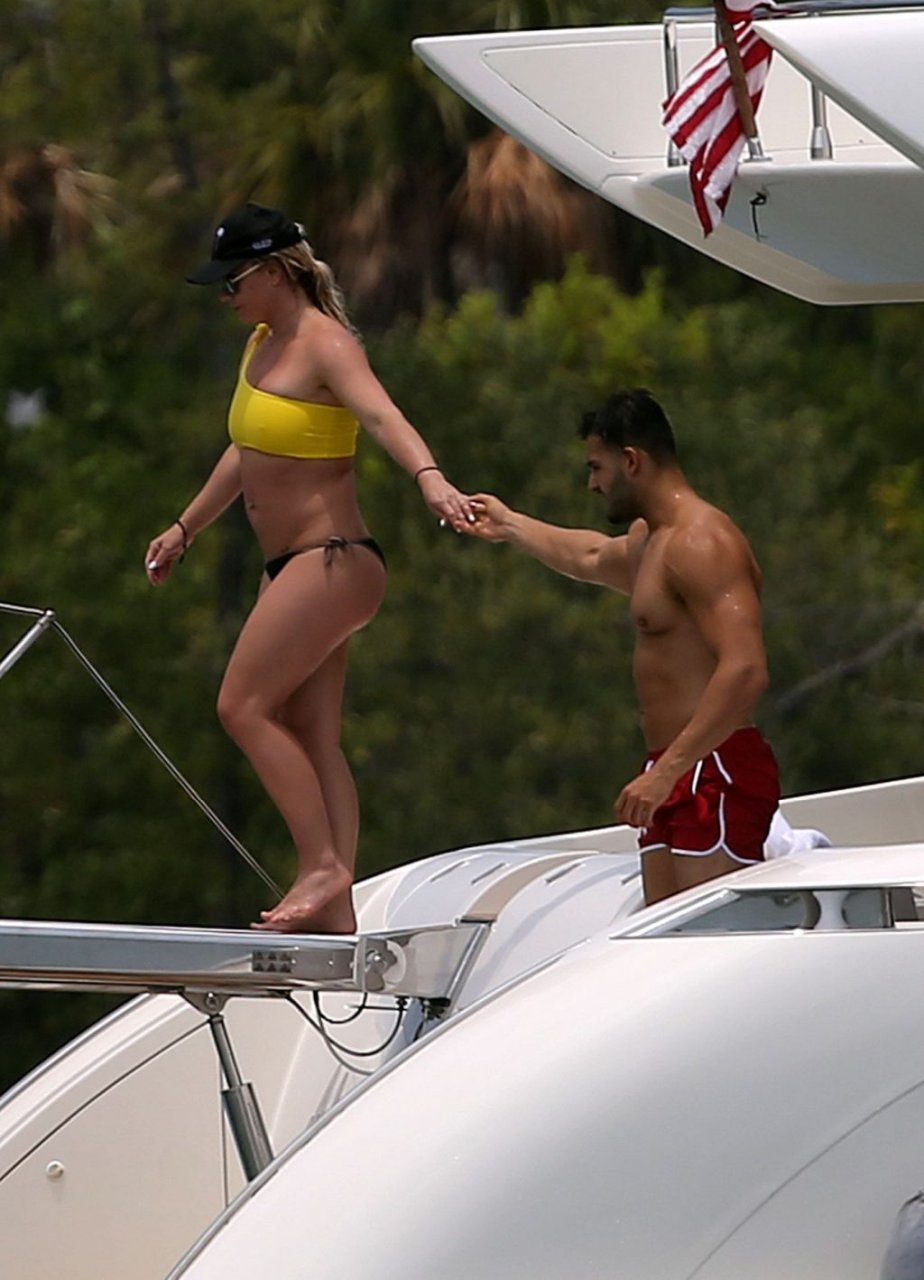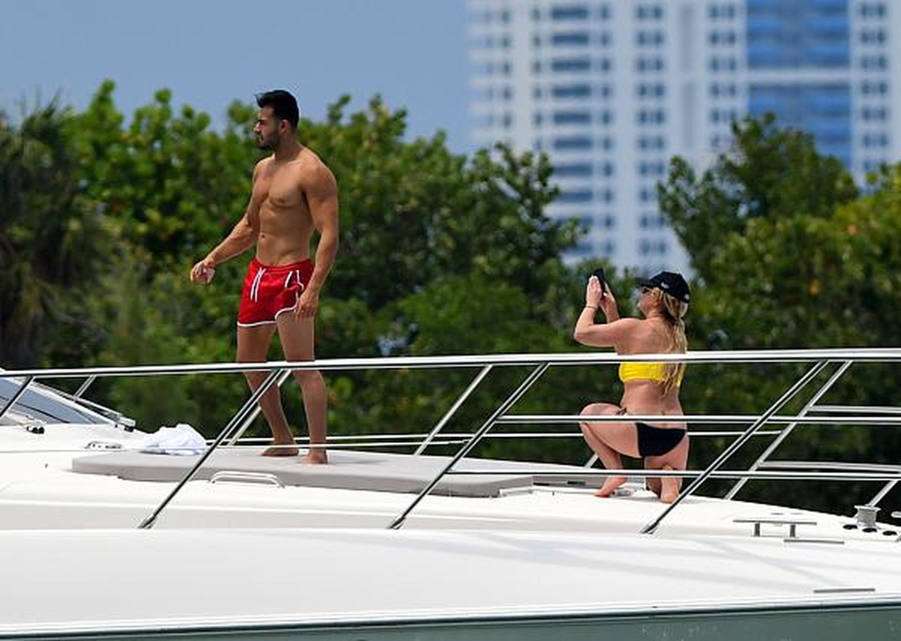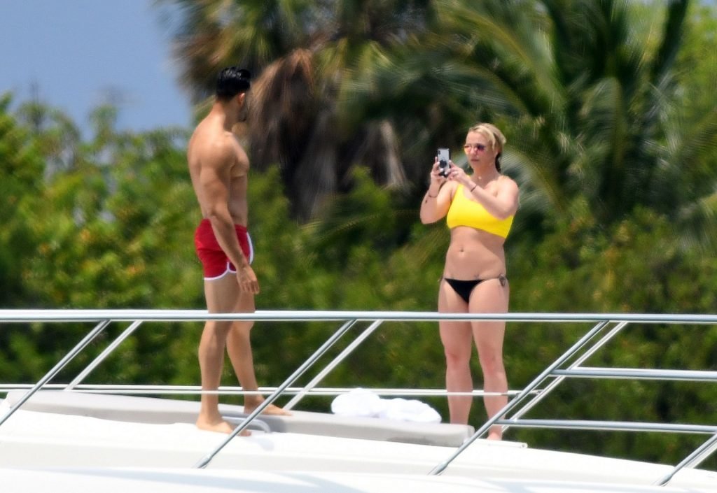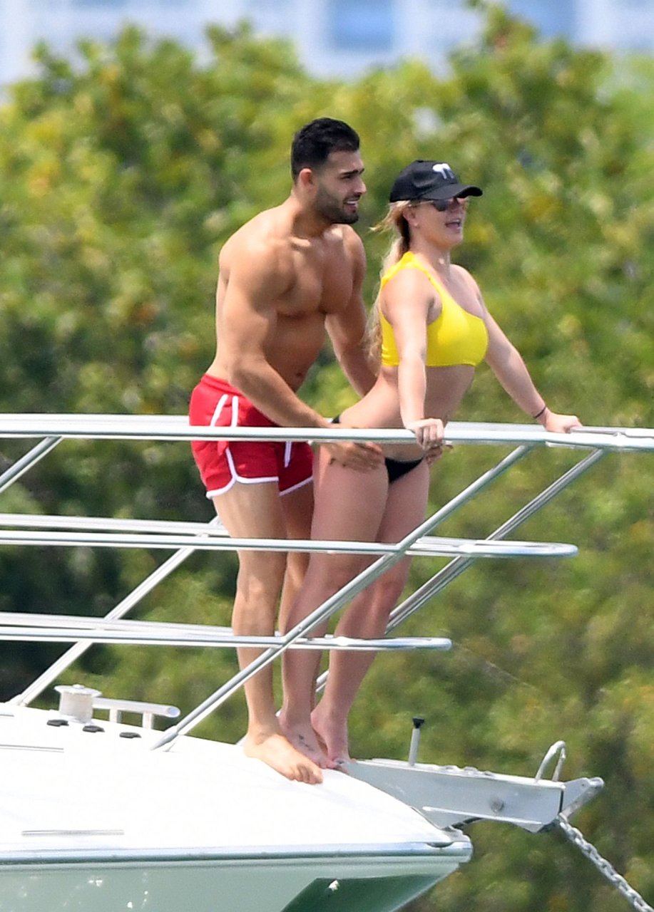 Britney Spears indossa un bikini giallo mentre trascorre un pomeriggio ricco di azione su uno yacht con il fidanzato Sam Asghari a Miami, 08/06/2019.