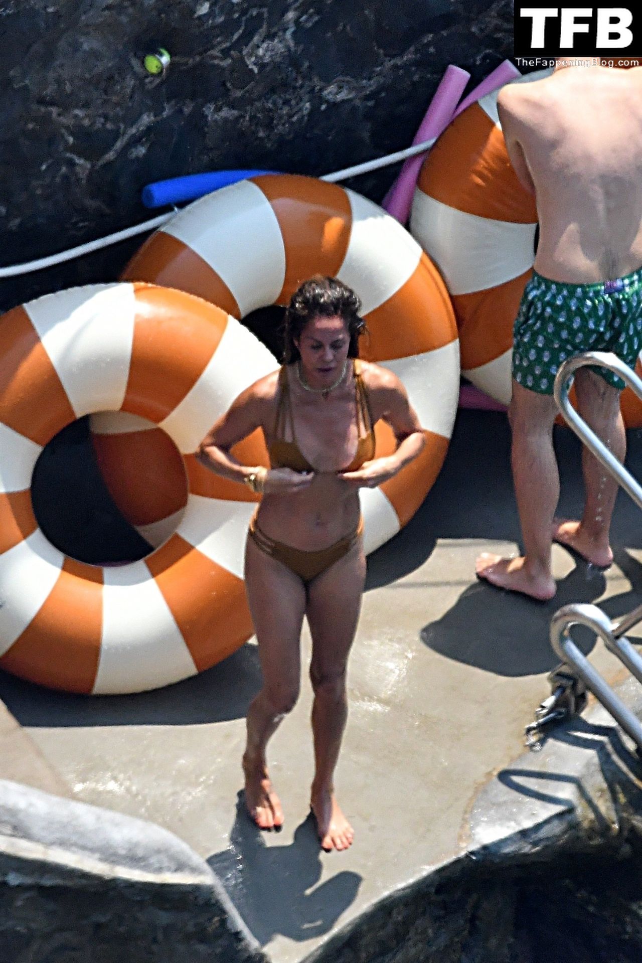 La guru del fitness di 50 anni ha mostrato il suo corpo mozzafiato con un due pezzi color rame e in un’altra occasione con un costume intero stampato mentre si rinfrescava con un tuffo nel mare.