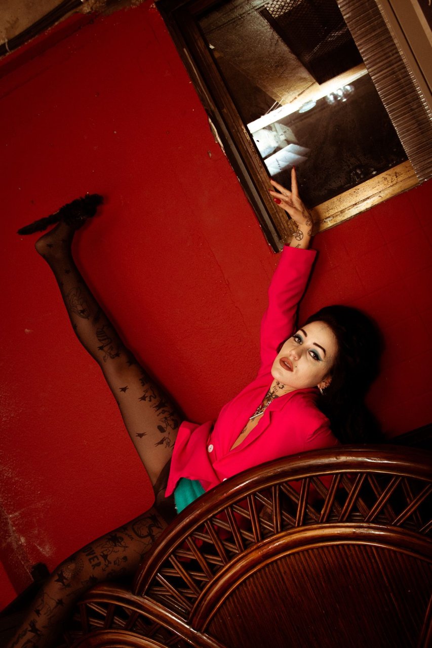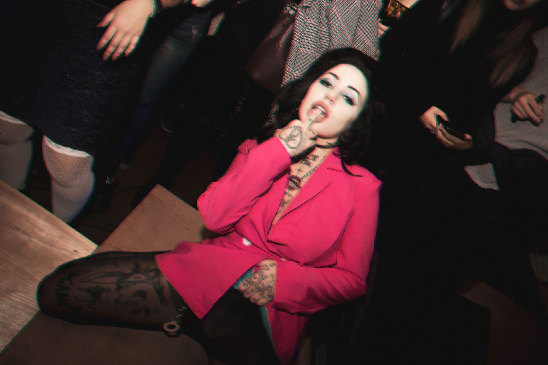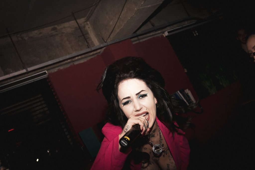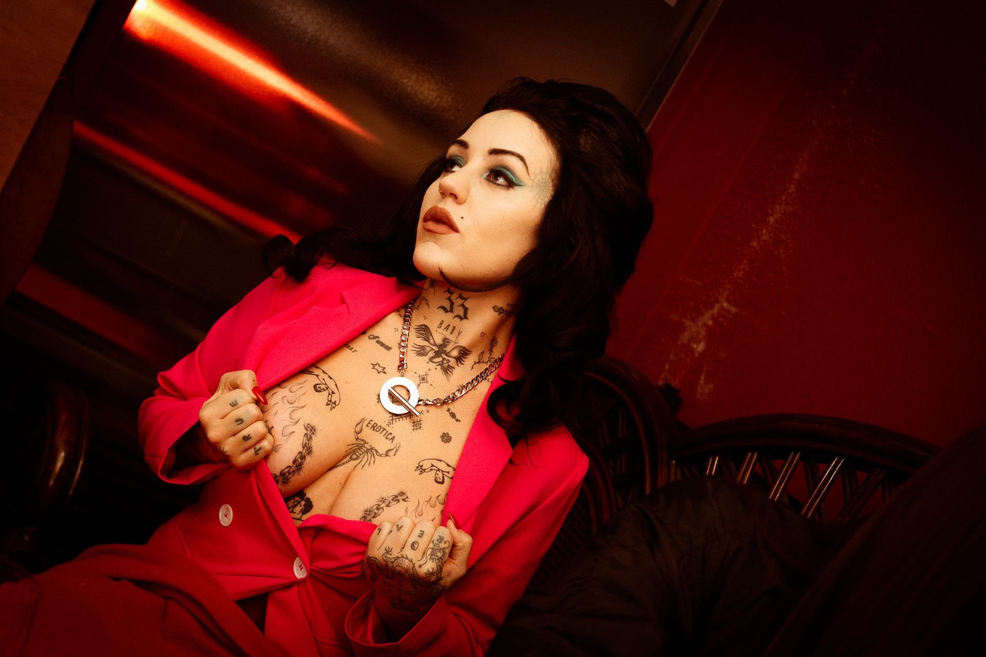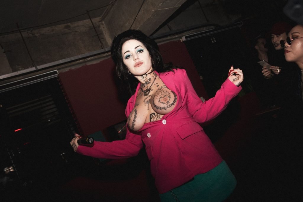Un artista di successo e di alto profilo, senza dubbio, a giudicare dal luogo - un seminterrato - e dalle legioni di fan presenti. Per quanto riguarda il seno, non riesco a dire come siano; i tatuaggi fanno davvero un buon lavoro nel nasconderli.