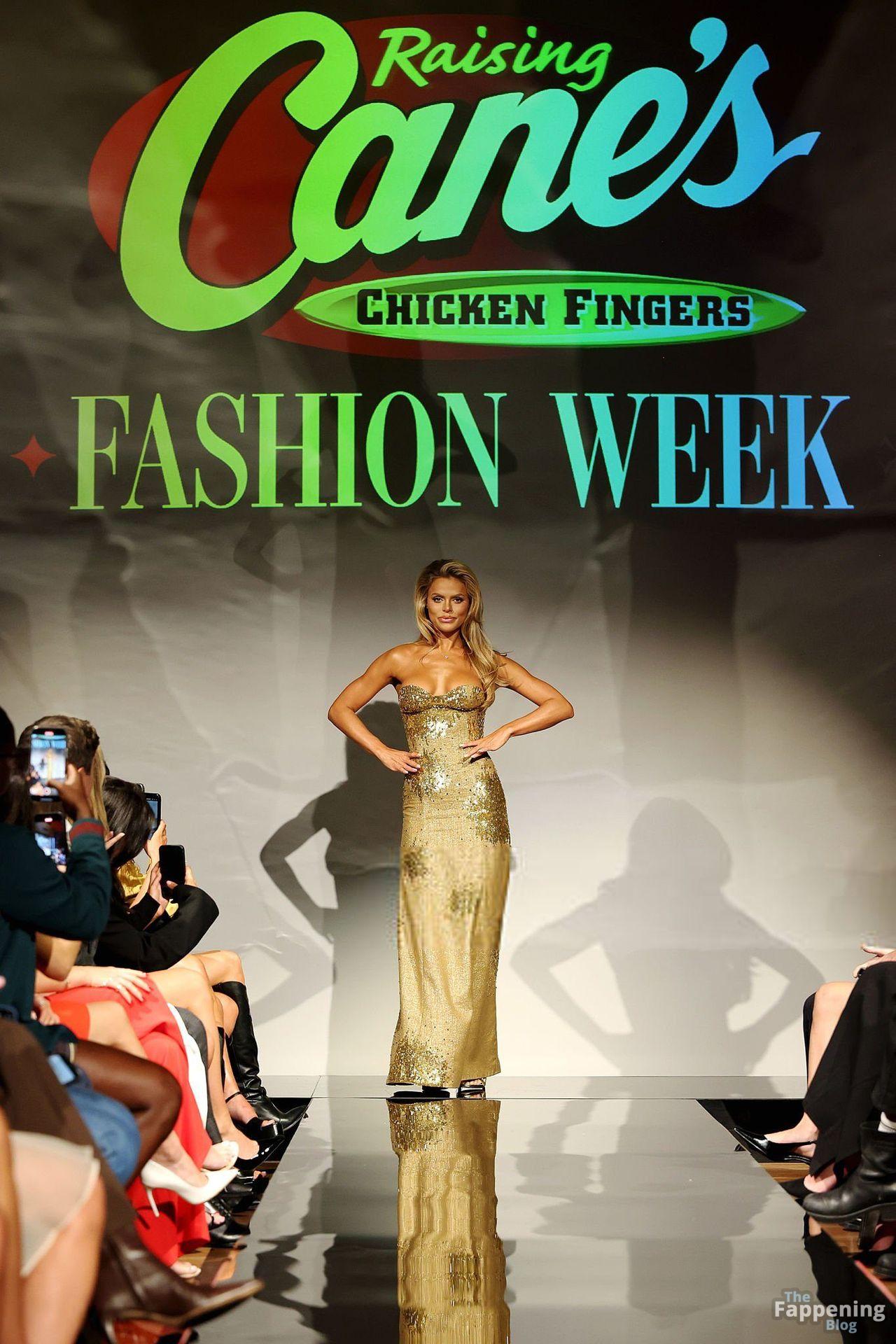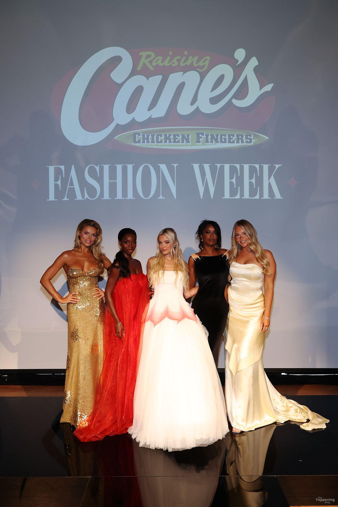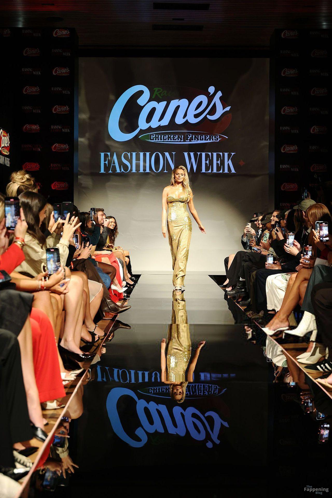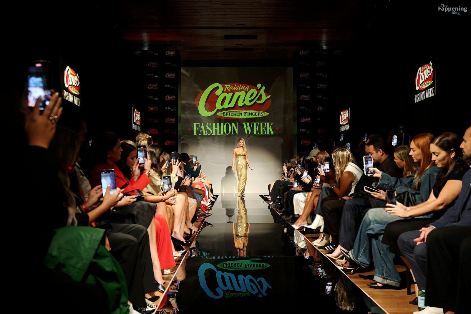 Brooks Nader mostrava un décolleté importante in un abito dorato senza spalline alla sfilata di moda Raisin’ Cane’s al The Standard High Line di New York.