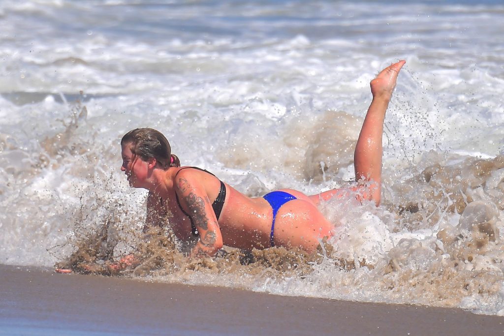 la prossima volta dovrebbe indossare dei top bikini larghi così potremmo vedere le sue tette cadenti e lattiginose.