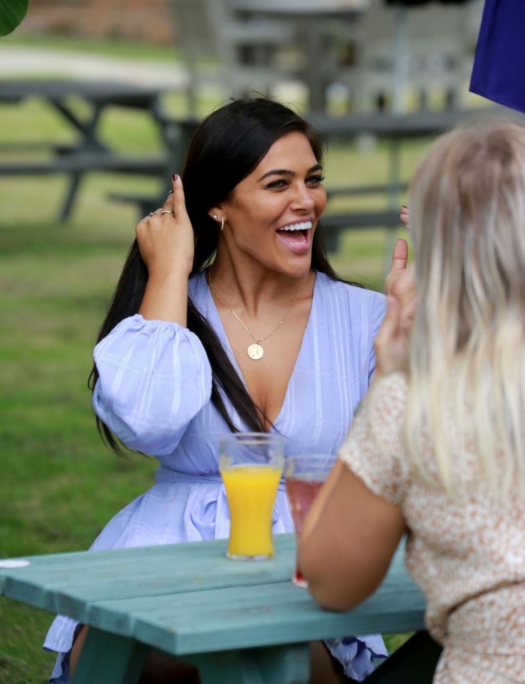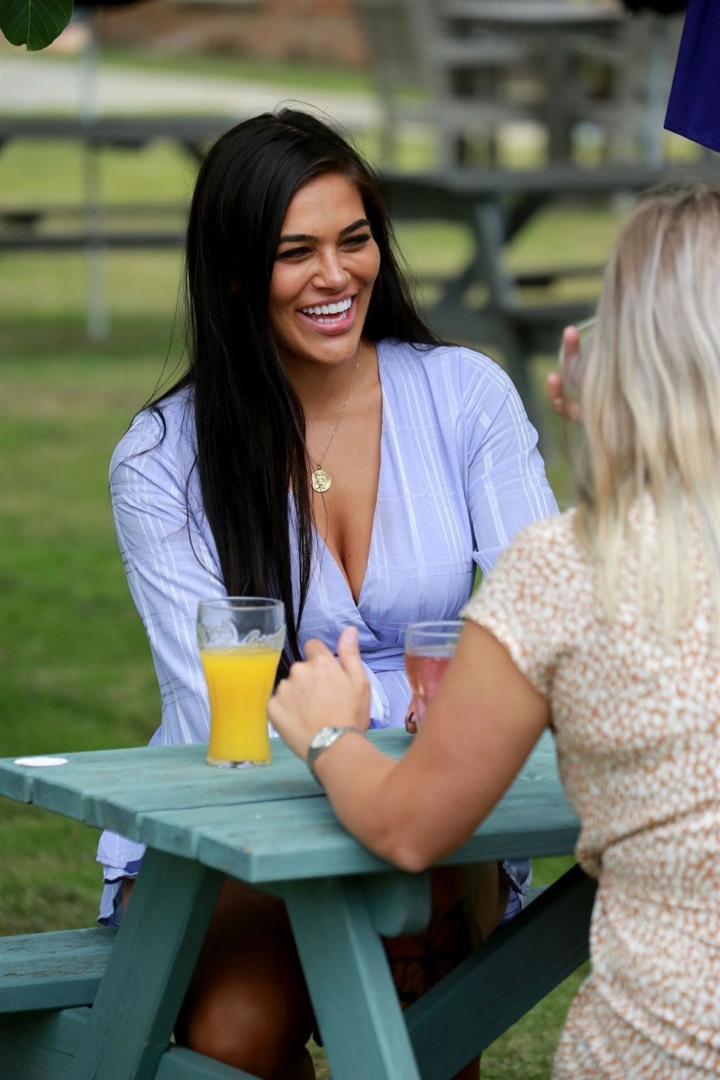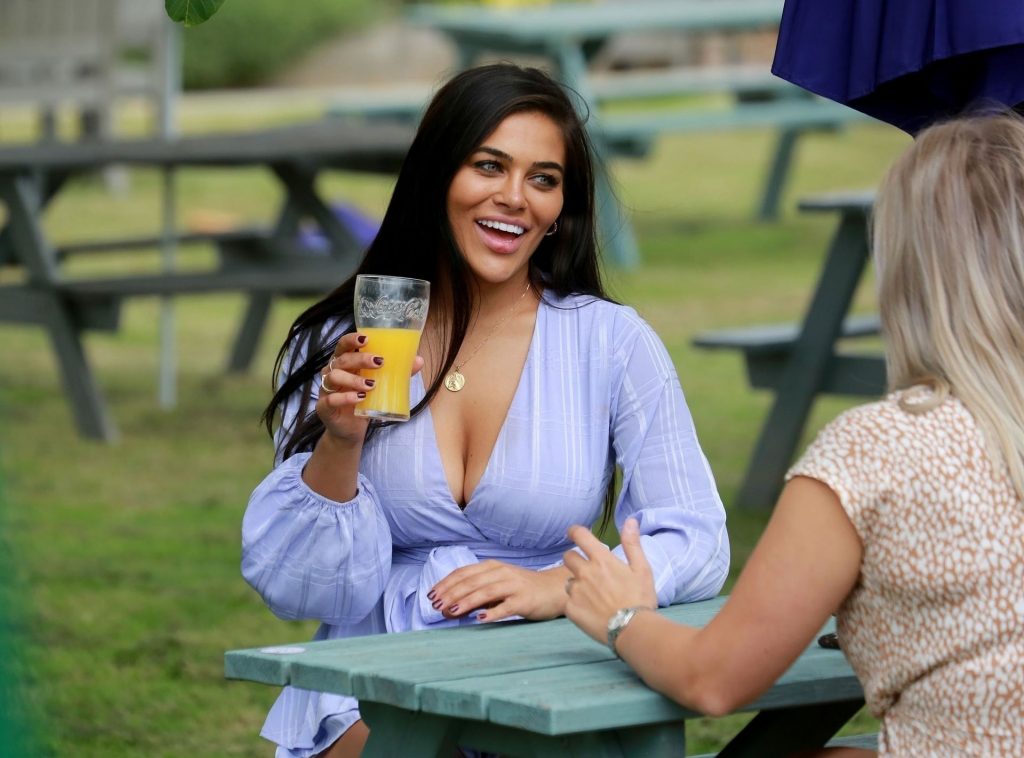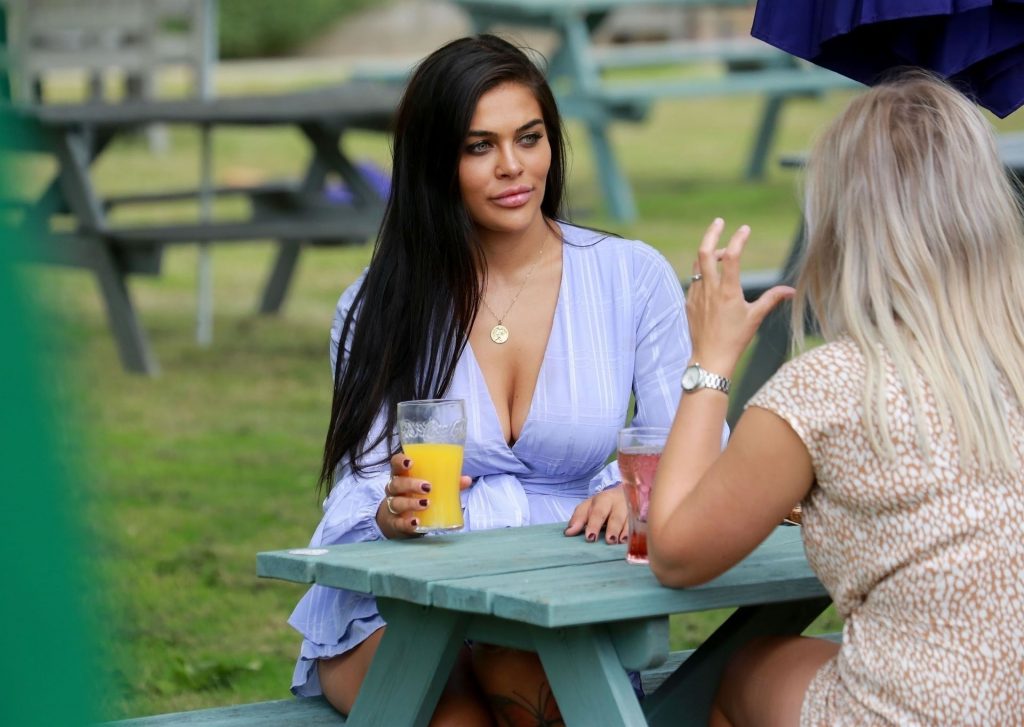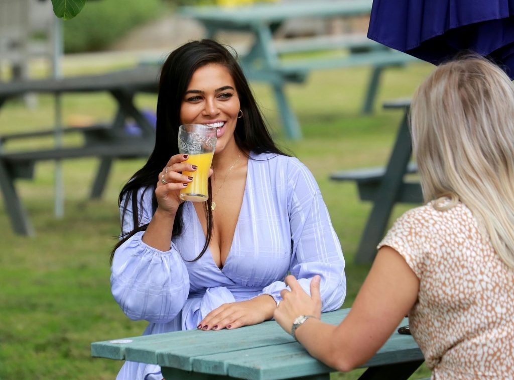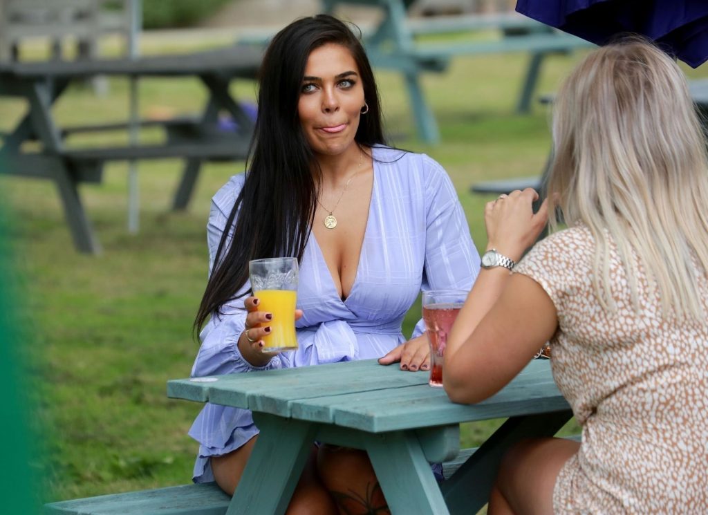 La star del reality show di Netflix ‘Too Hot to Handle’ Lydia Clyma approfitta del caldo clima britannico con una bevanda fresca e una bella chiacchierata con un’amica nel giardino di un pub vicino a casa sua a Portsmouth, 17/07/2020.