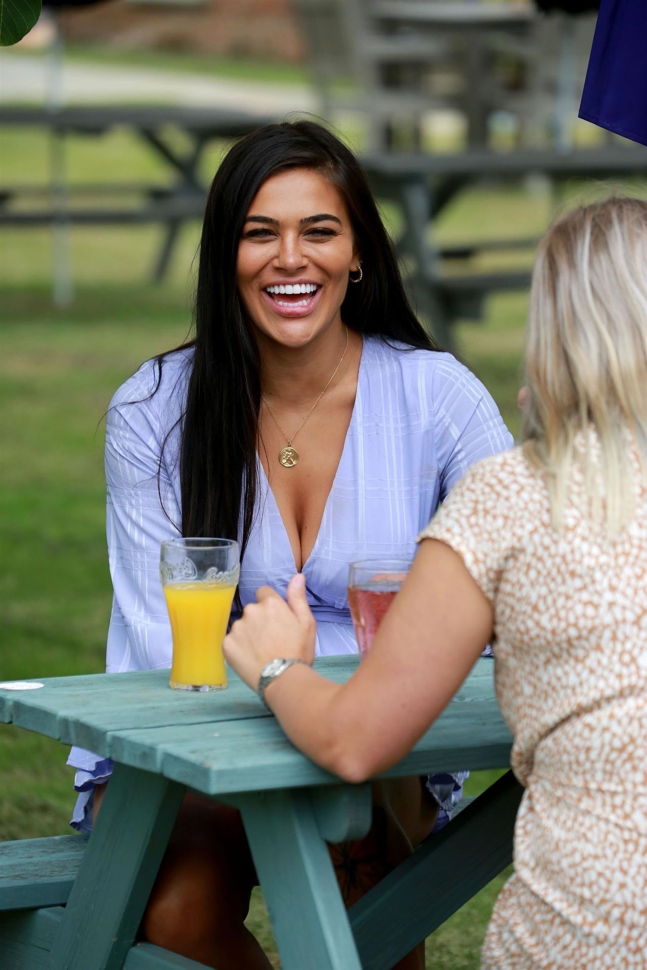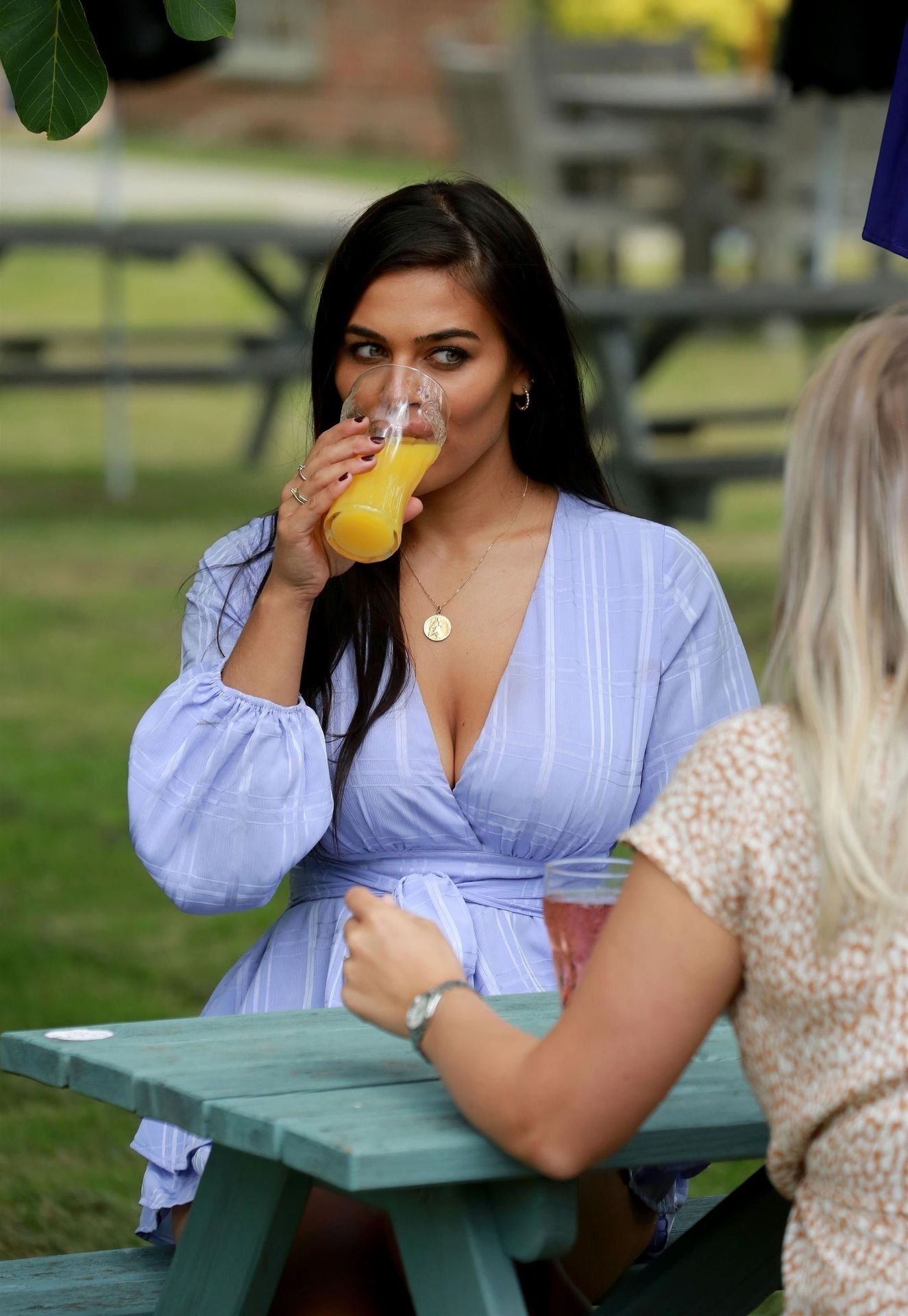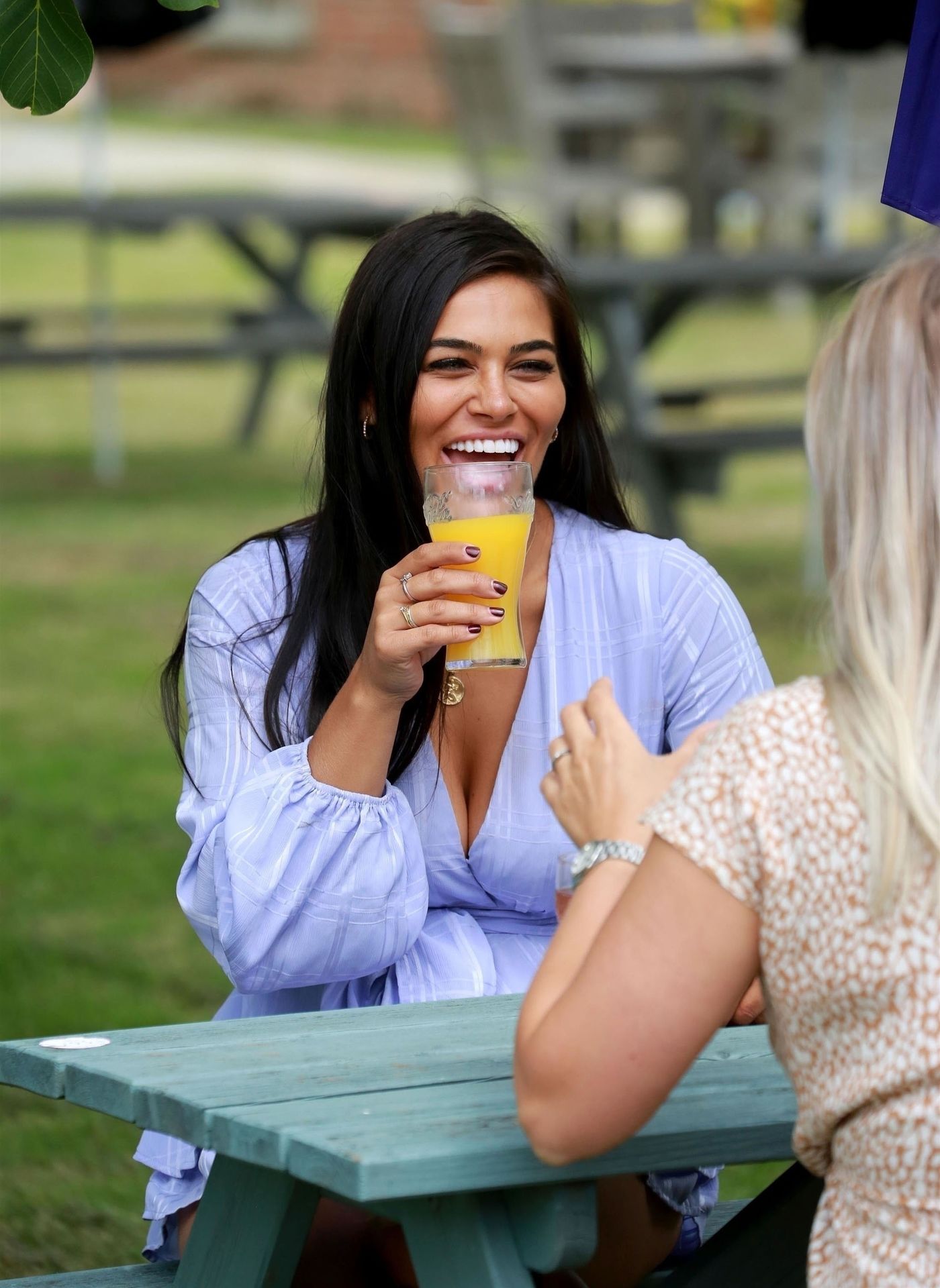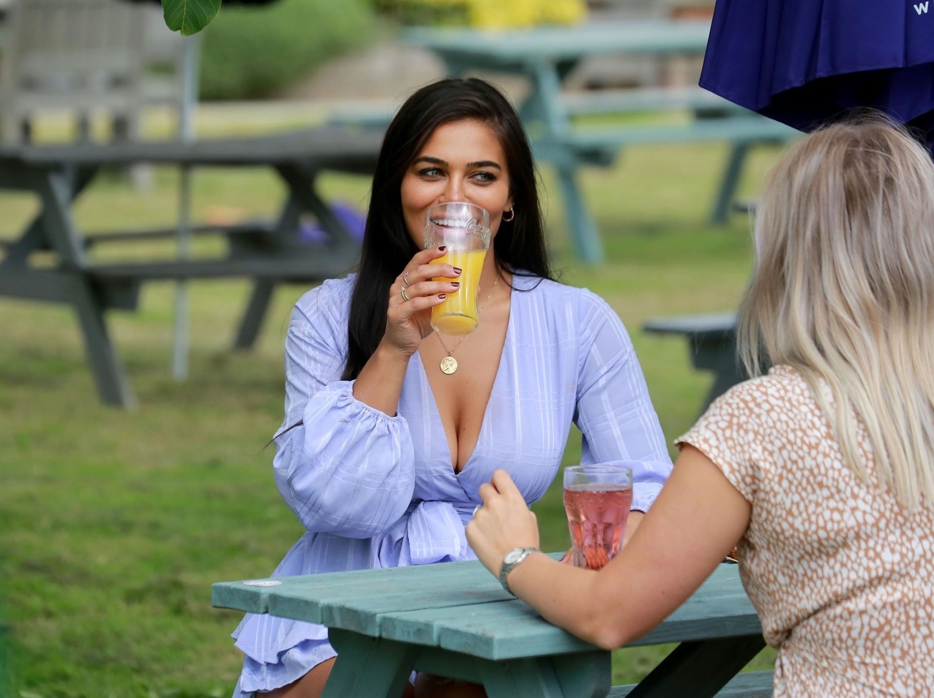 La star del reality show di Netflix ‘Too Hot to Handle’ Lydia Clyma approfitta del caldo clima britannico con una bevanda fresca e una bella chiacchierata con un’amica nel giardino di un pub vicino a casa sua a Portsmouth, 17/07/2020.