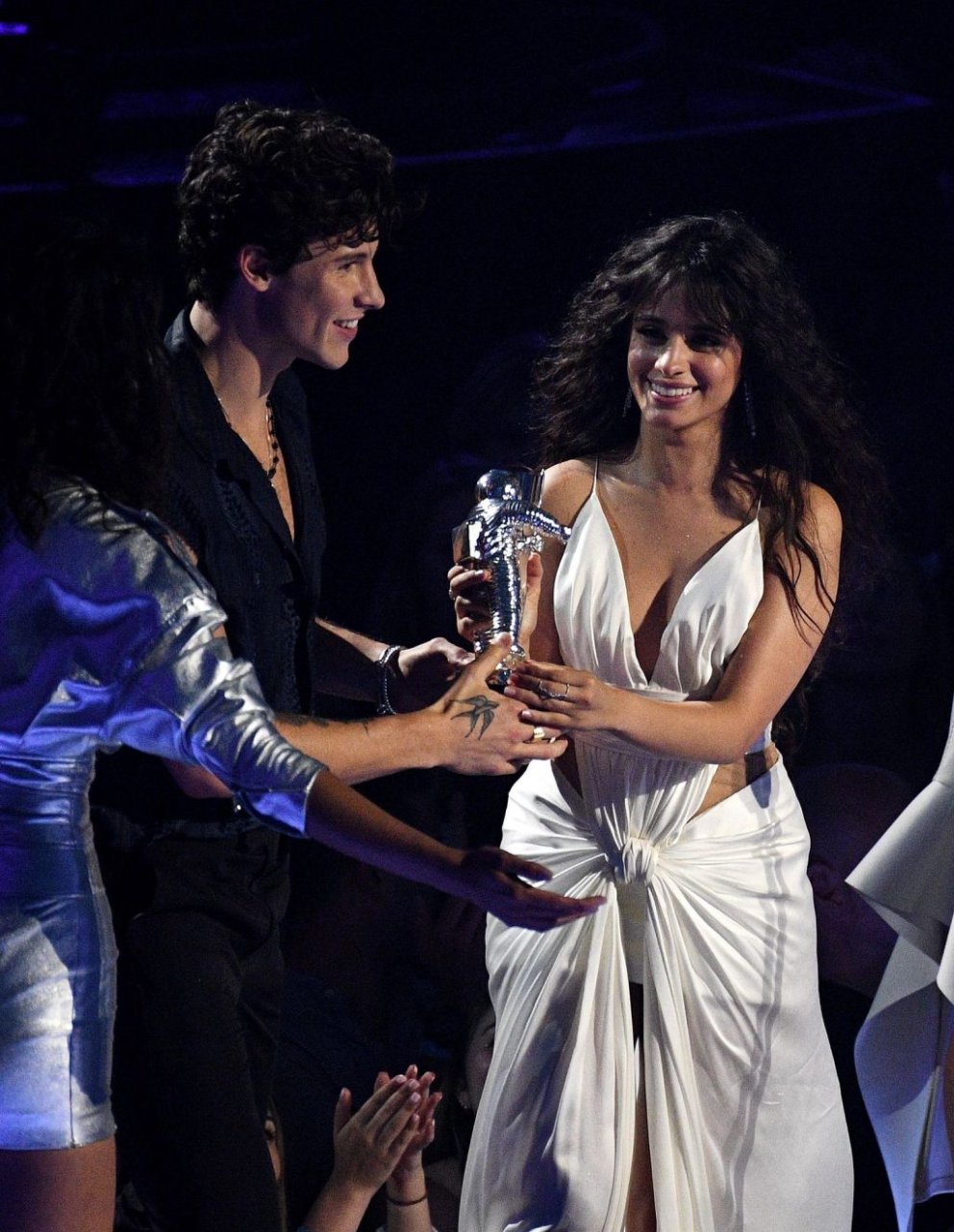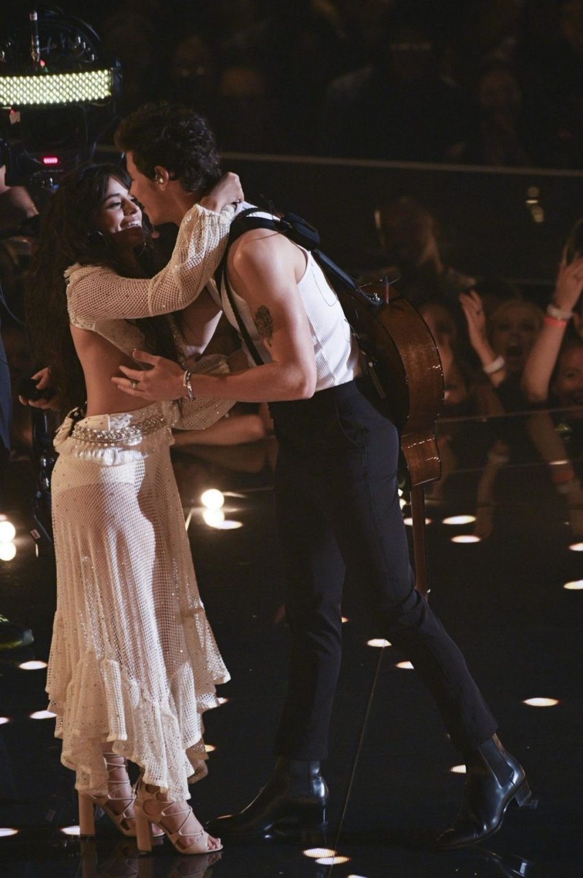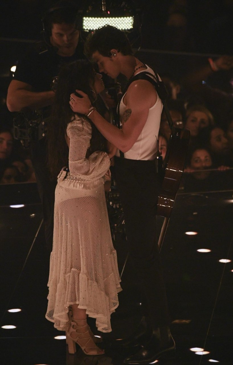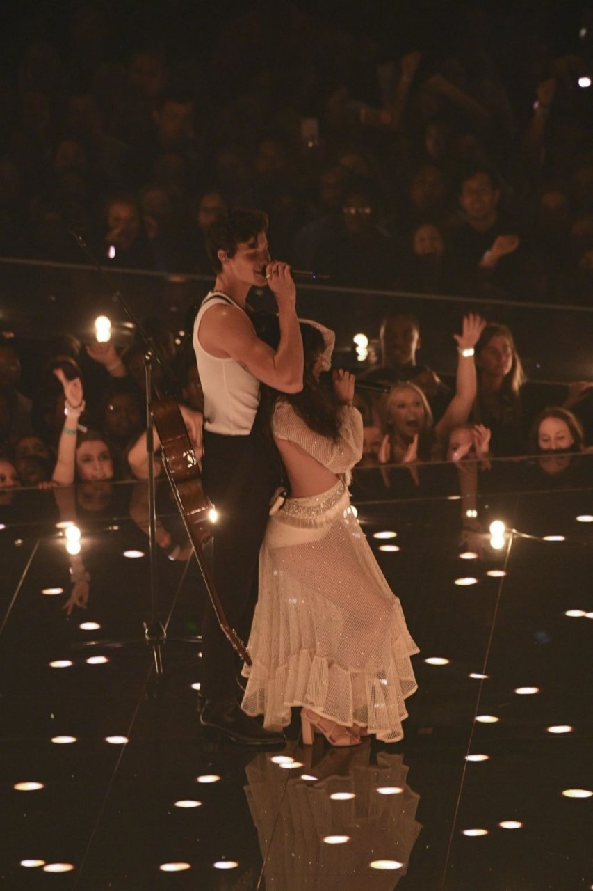 Camila Cabello si gode una performance romantica con Shawn Mendes durante gli MTV Video Music Awards 2019 al Prudential Center di Newark, New Jersey, 26/08/2019. La cantante ha scelto per l’evento un vestito bianco senza biancheria intima.