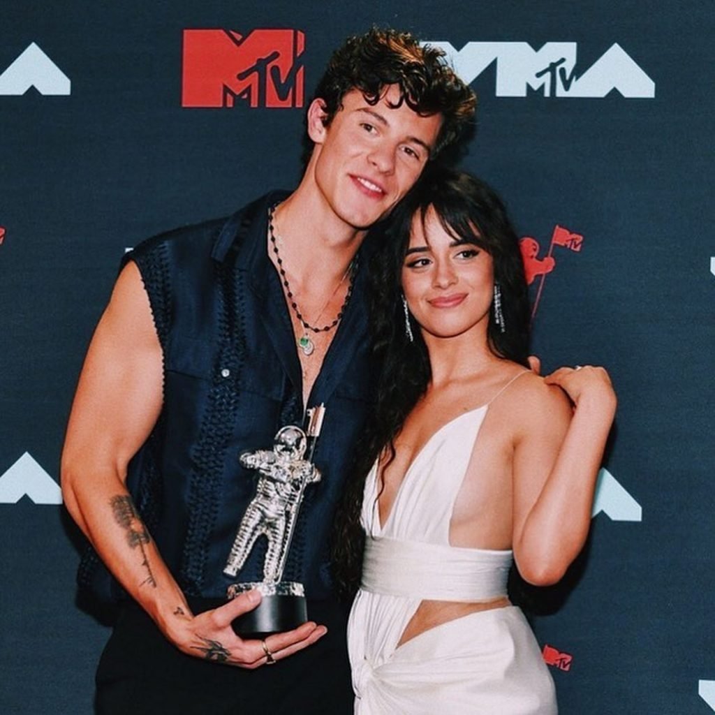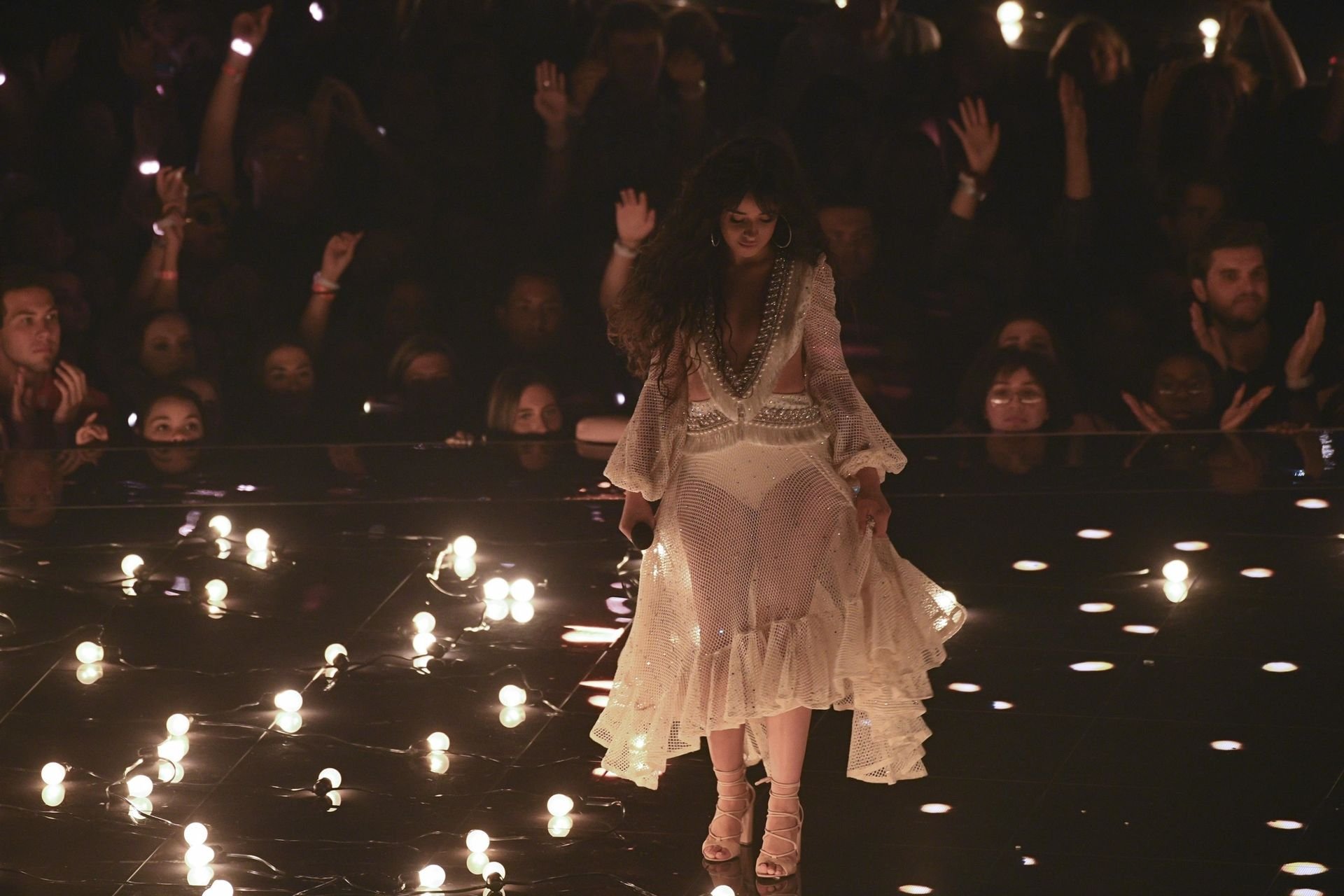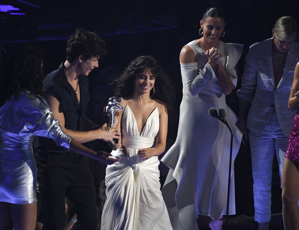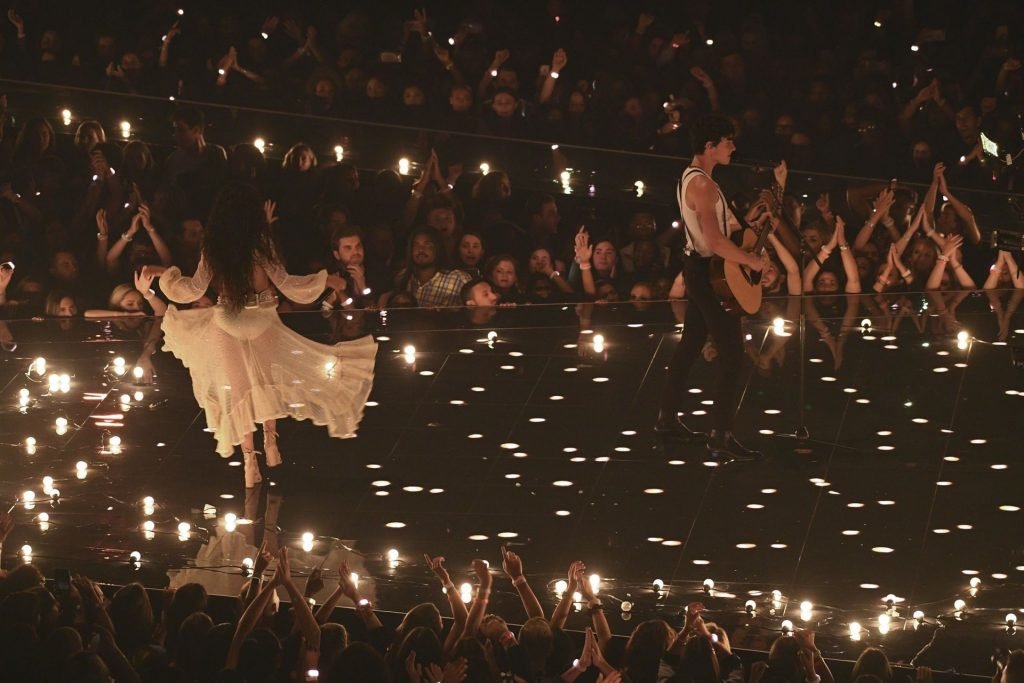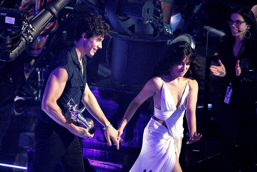 Camila Cabello si gode una performance romantica con Shawn Mendes durante gli MTV Video Music Awards 2019 al Prudential Center di Newark, New Jersey, 26/08/2019. La cantante ha scelto per l’evento un vestito bianco senza biancheria intima.