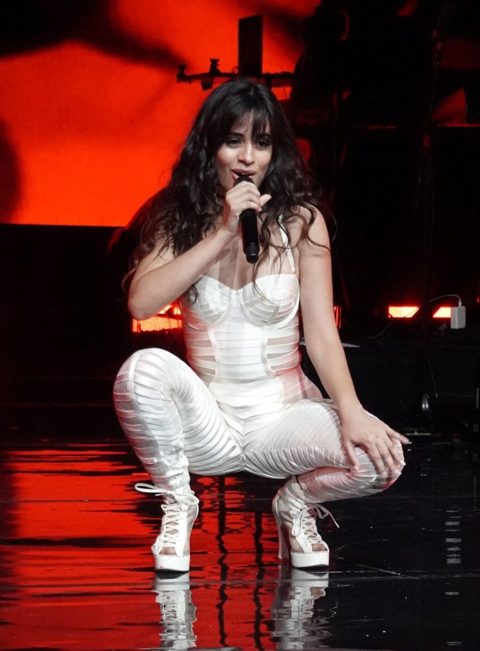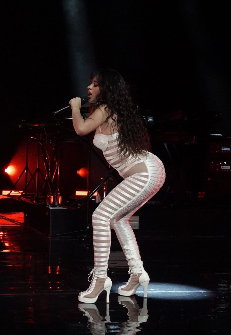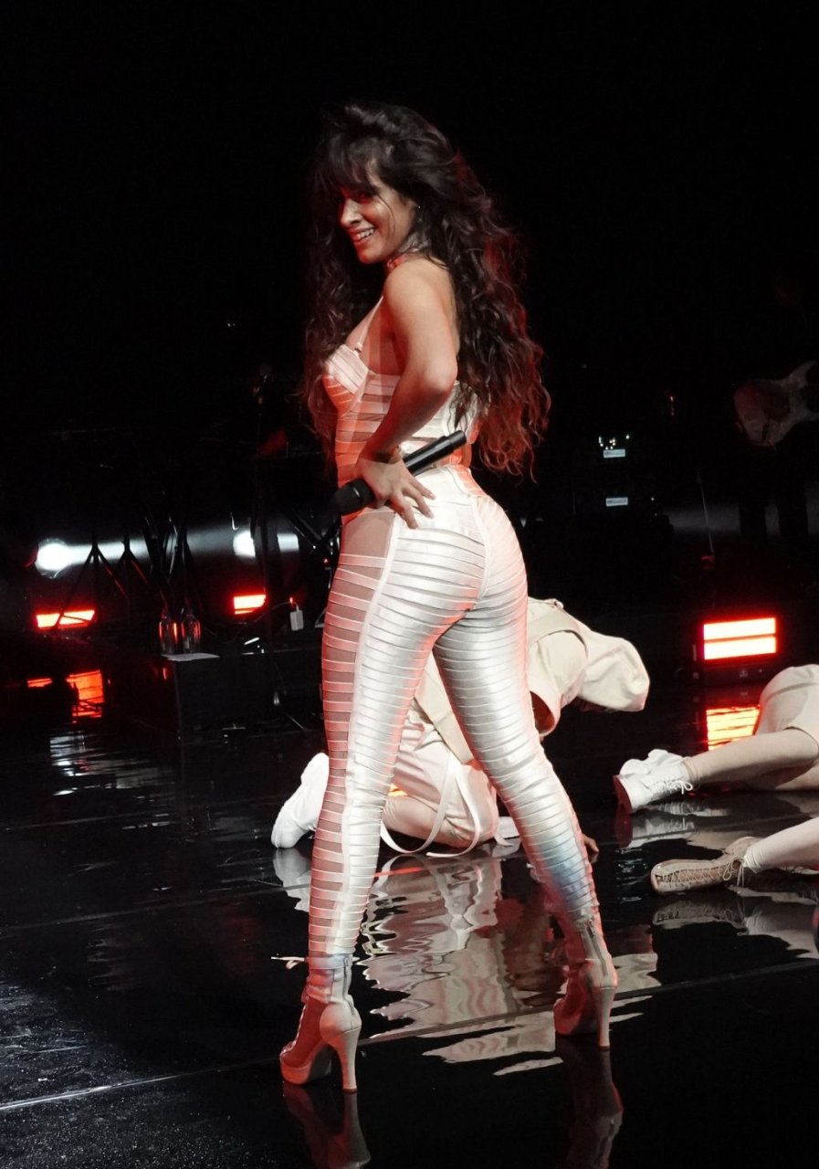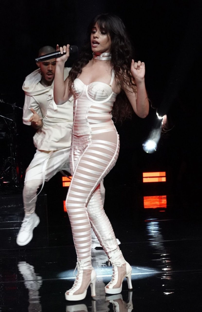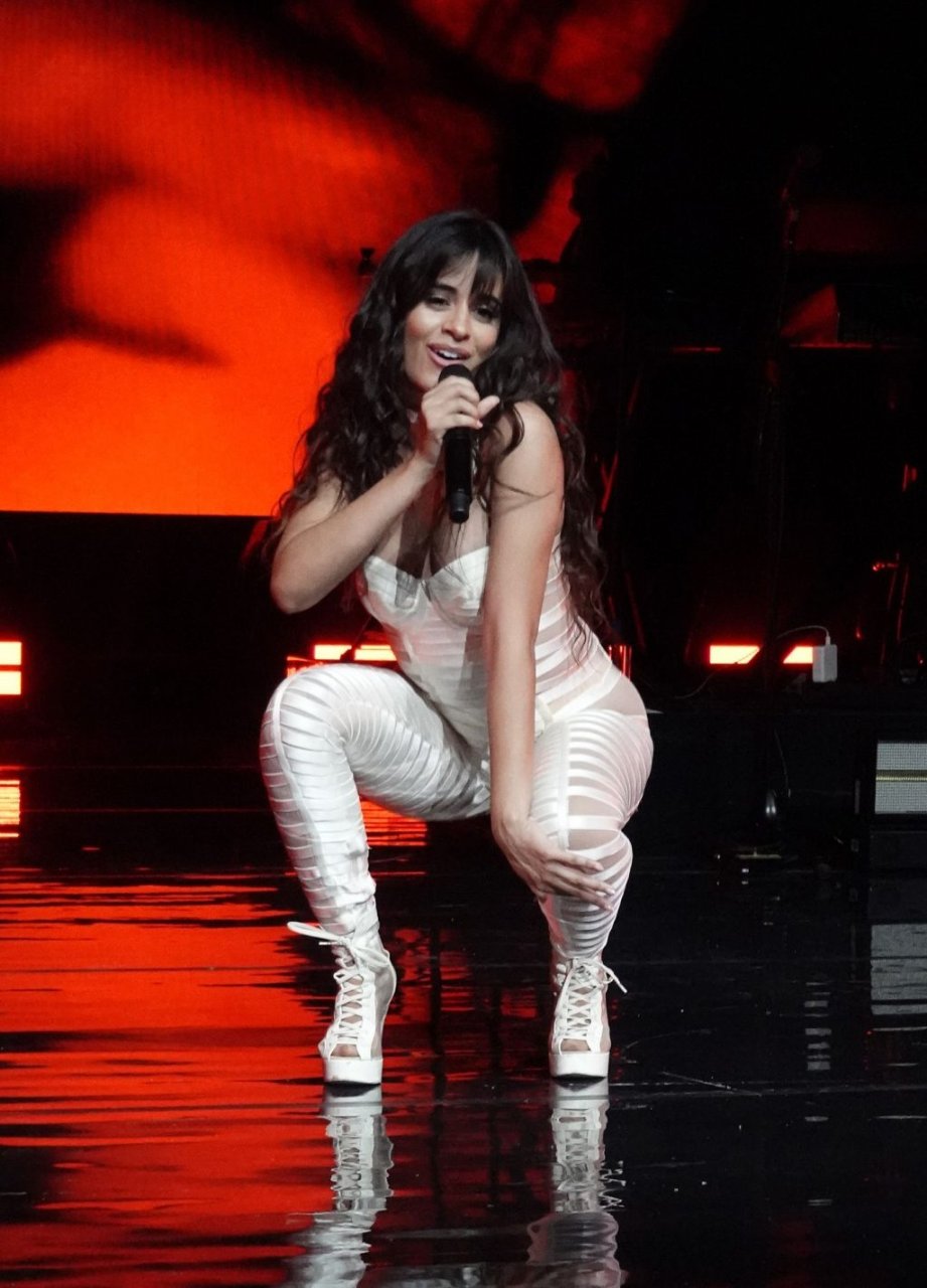 La cantante cubano-americana Camila Cabello indossa una tuta bianca con ritagli e stiletto allacciati mentre si esibisce dal vivo in concerto per Verizon Up al The Fillmore Miami Beach presso il Jackie Gleason Theater, 25/09/2019.