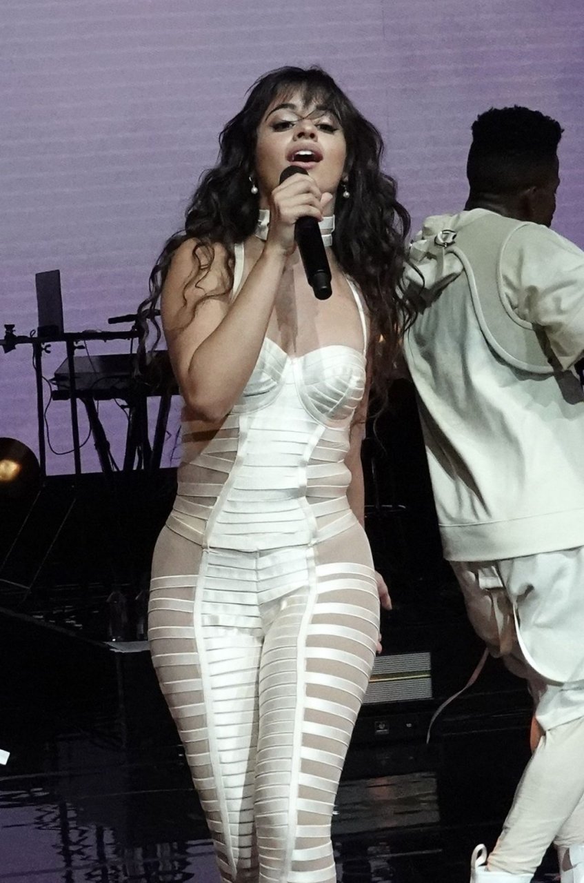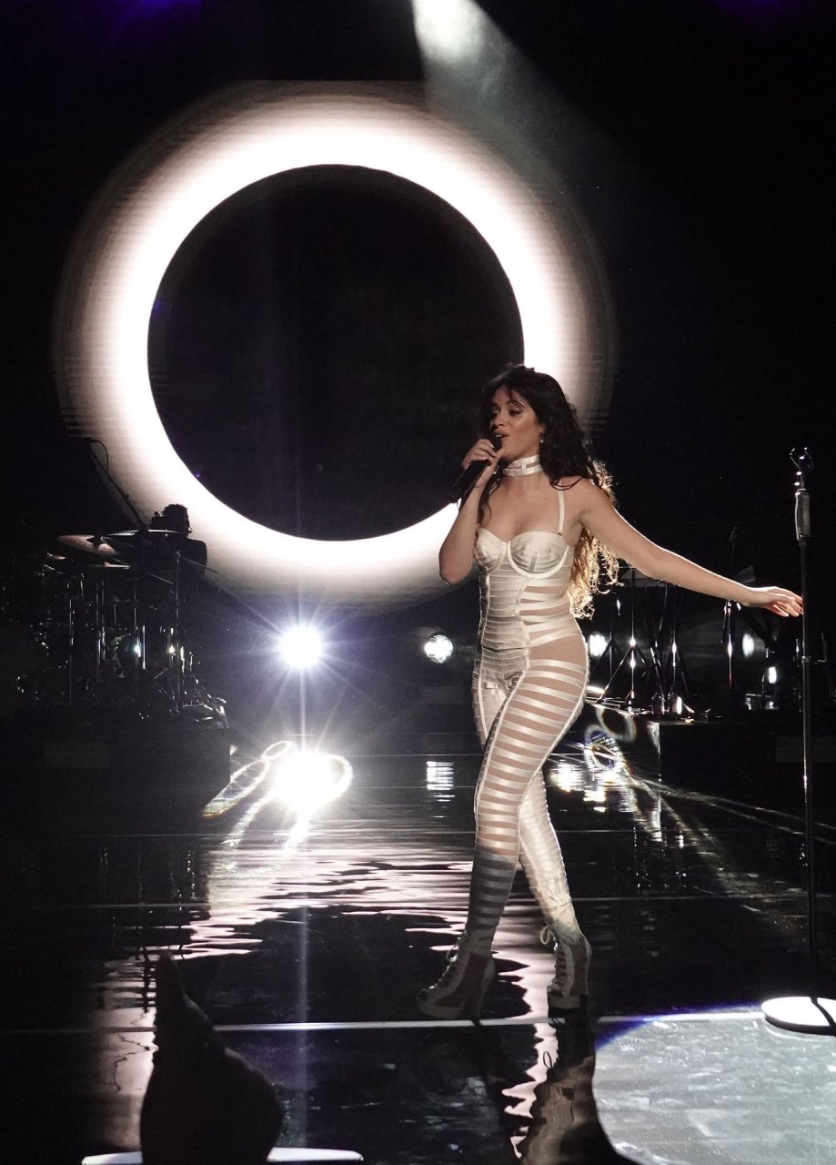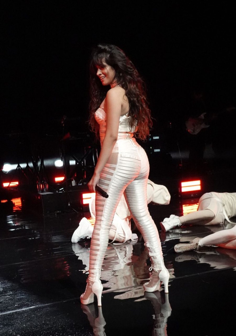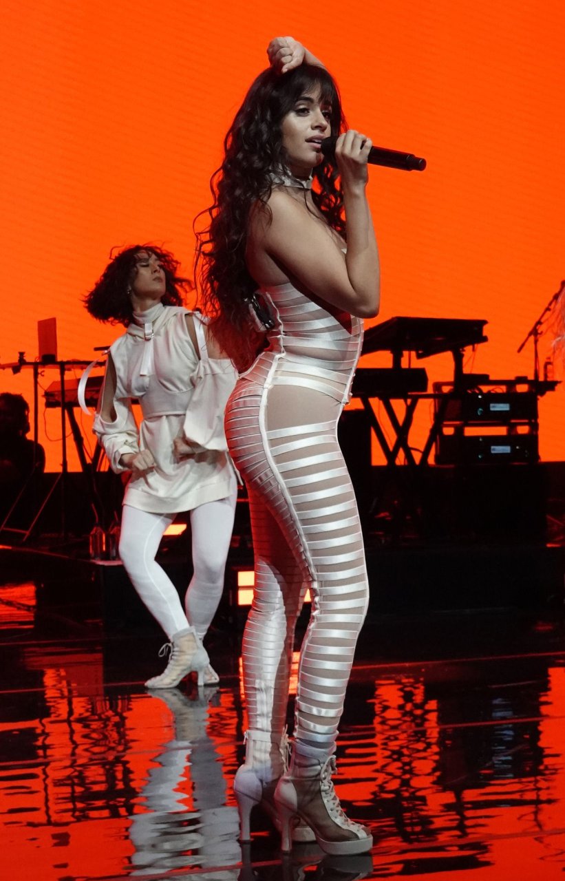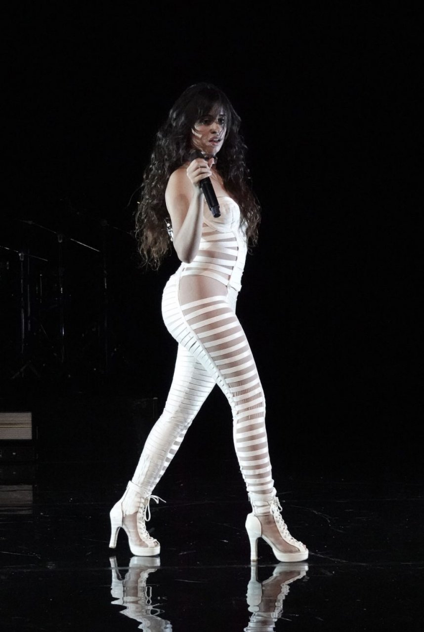 La cantante cubano-americana Camila Cabello indossa una tuta bianca con ritagli e stiletto allacciati mentre si esibisce dal vivo in concerto per Verizon Up al The Fillmore Miami Beach presso il Jackie Gleason Theater, 25/09/2019.