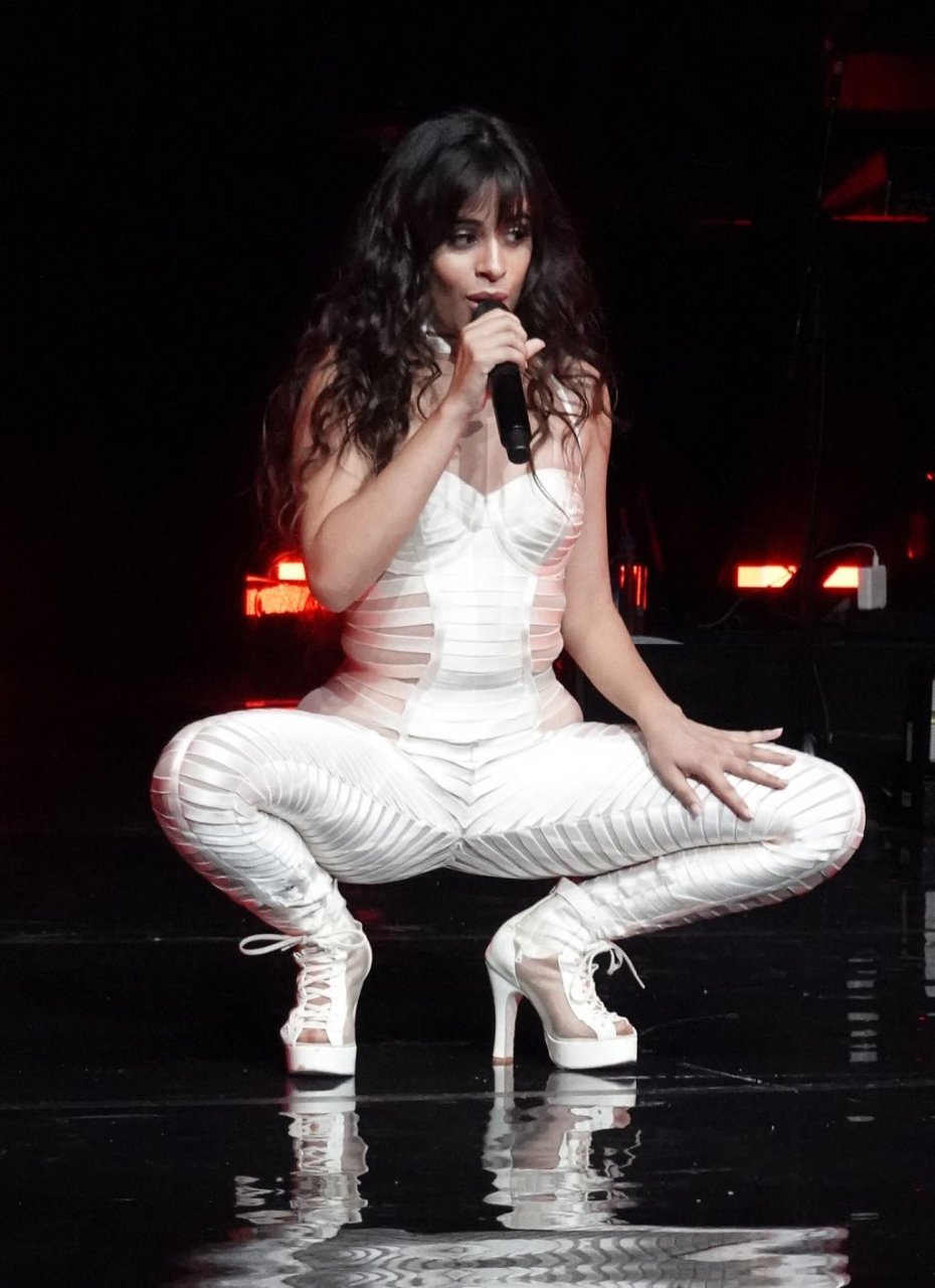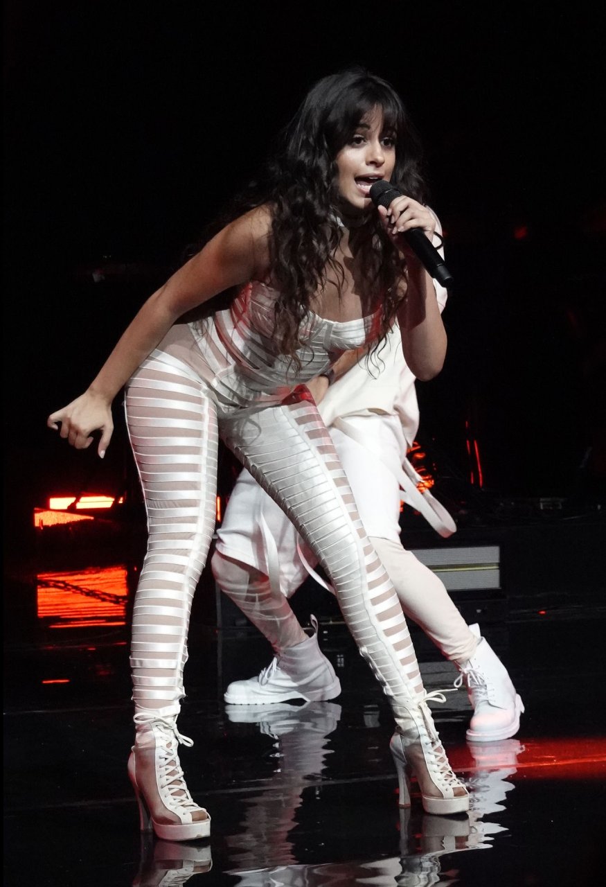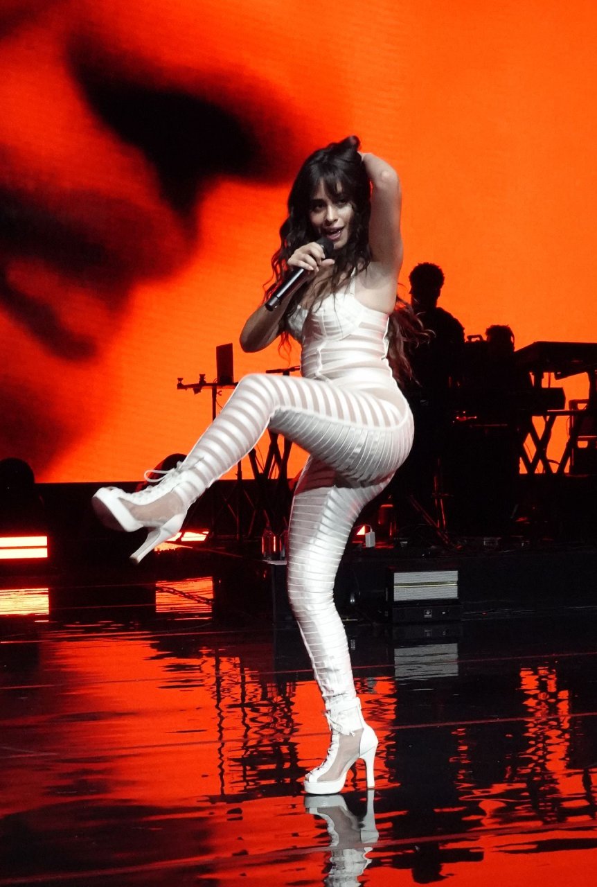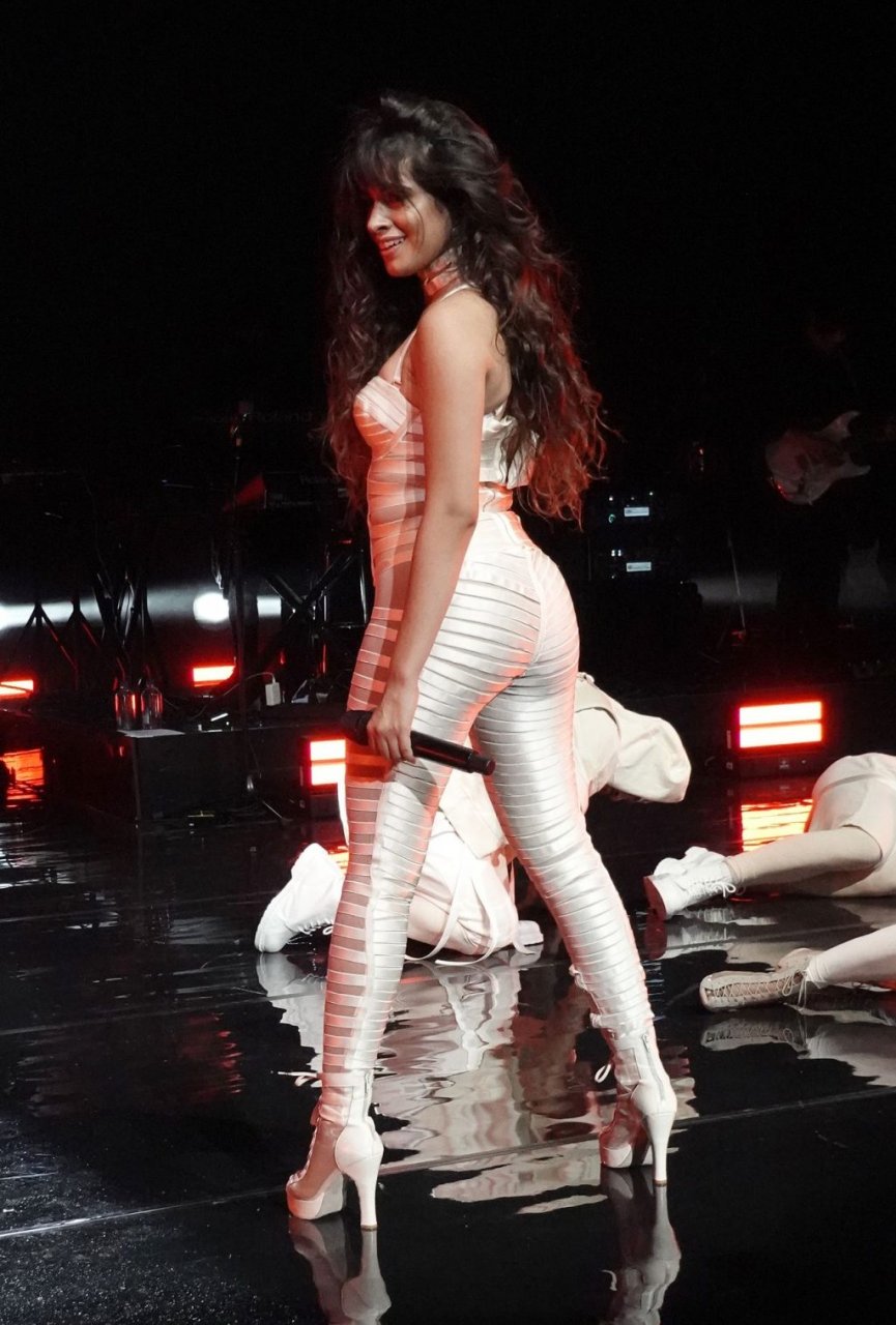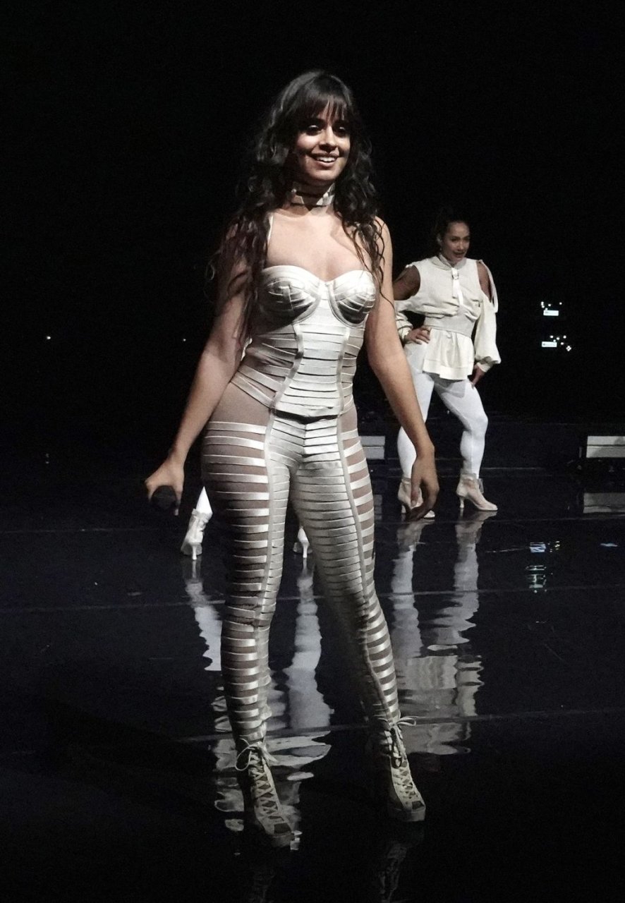 La cantante cubano-americana Camila Cabello indossa una tuta bianca con ritagli e stiletto allacciati mentre si esibisce dal vivo in concerto per Verizon Up al The Fillmore Miami Beach presso il Jackie Gleason Theater, 25/09/2019.