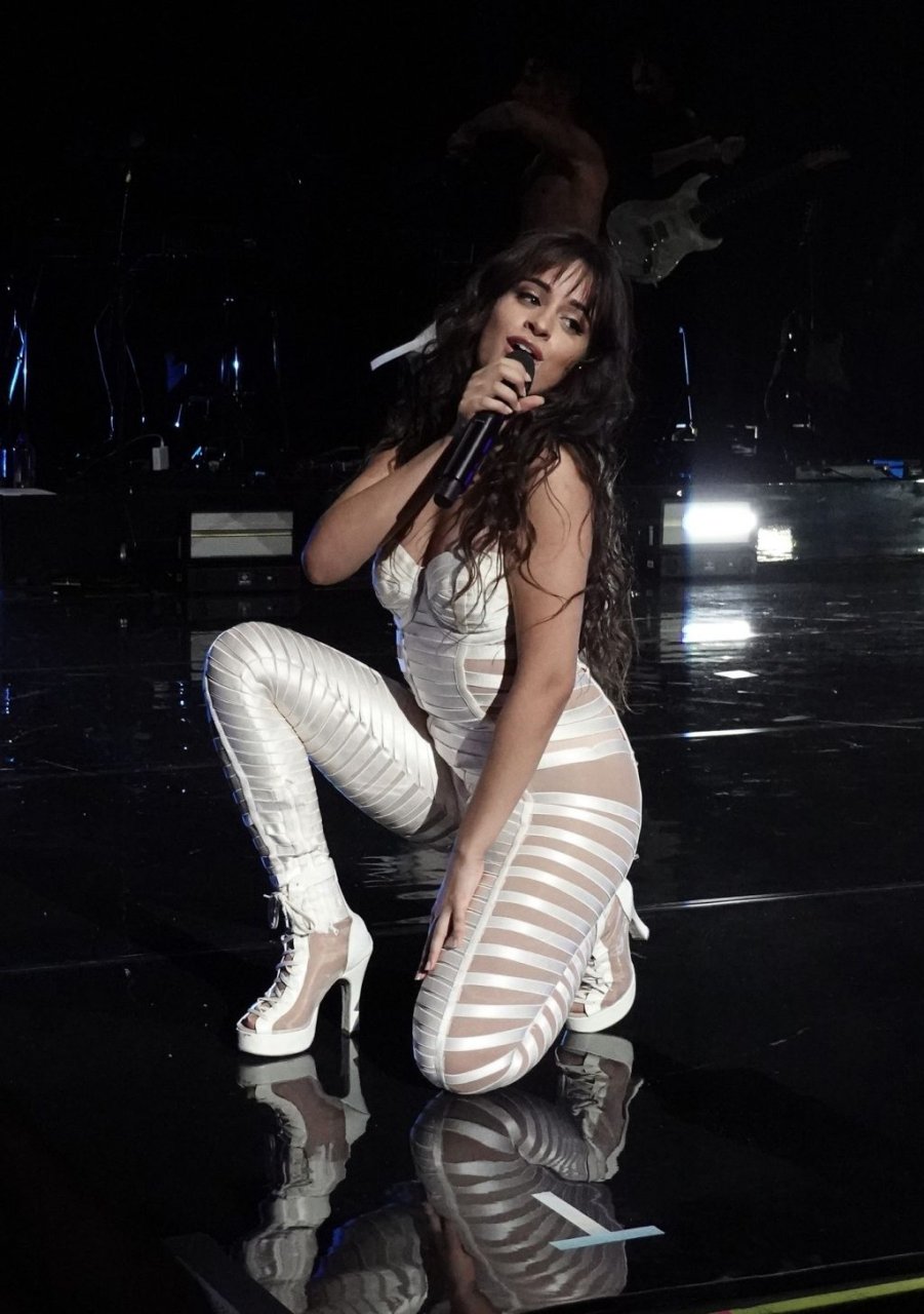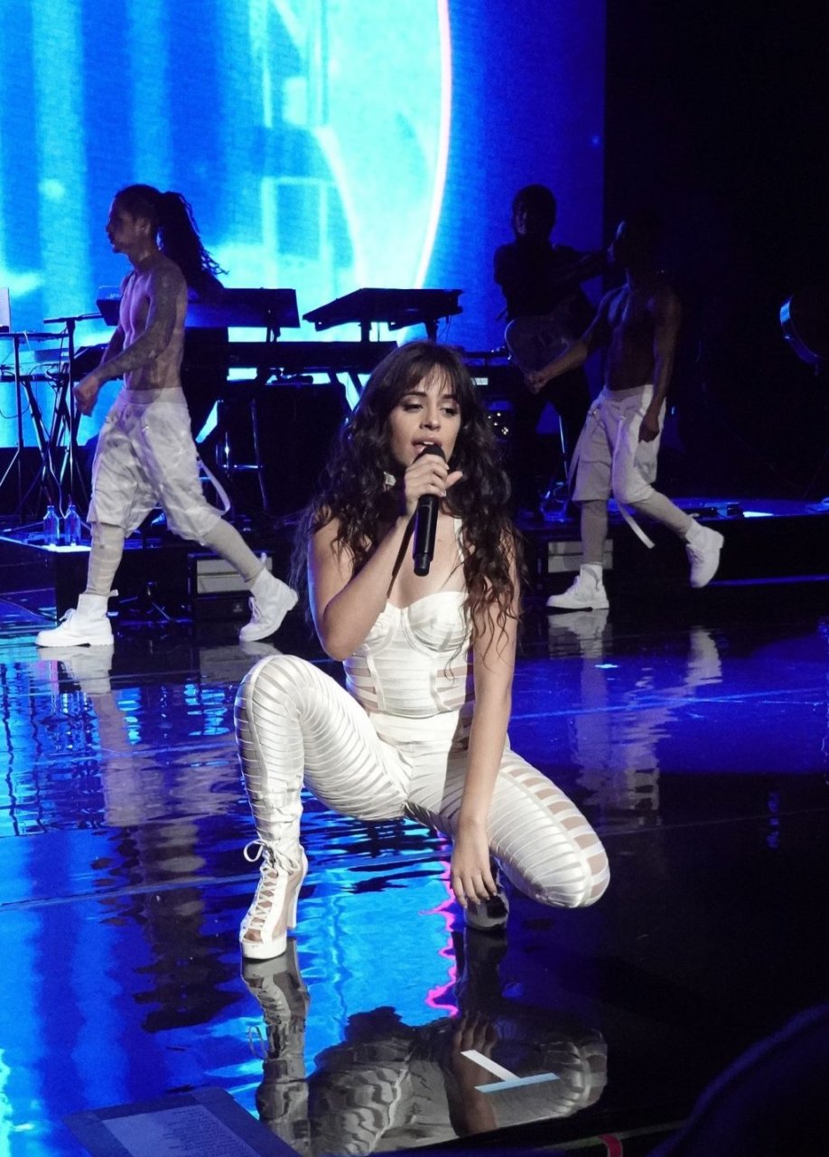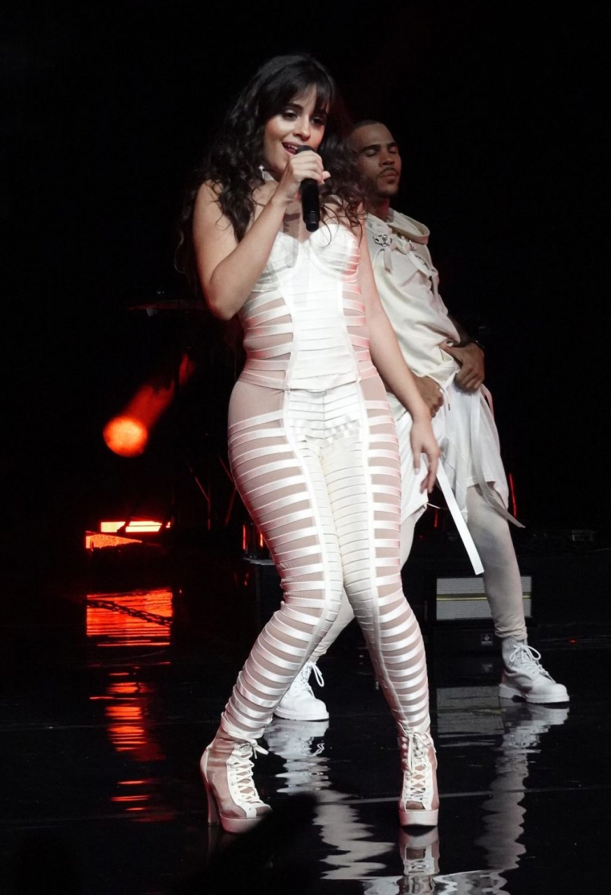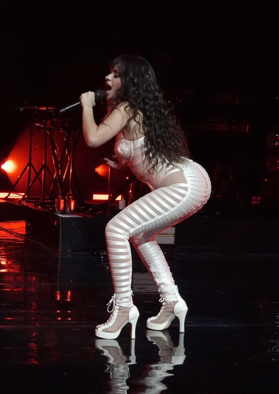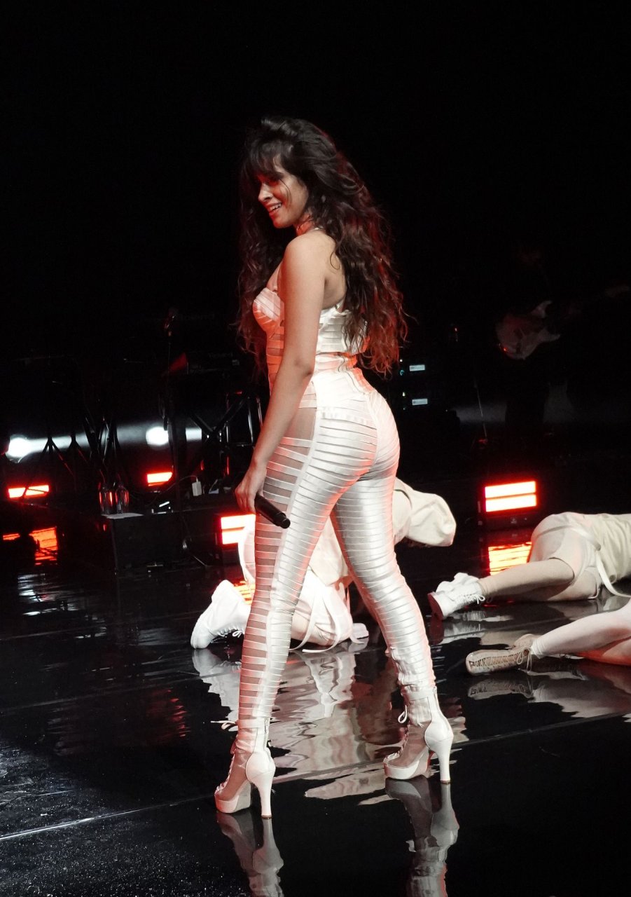 La cantante cubano-americana Camila Cabello indossa una tuta bianca con ritagli e stiletto allacciati mentre si esibisce dal vivo in concerto per Verizon Up al The Fillmore Miami Beach presso il Jackie Gleason Theater, 25/09/2019.