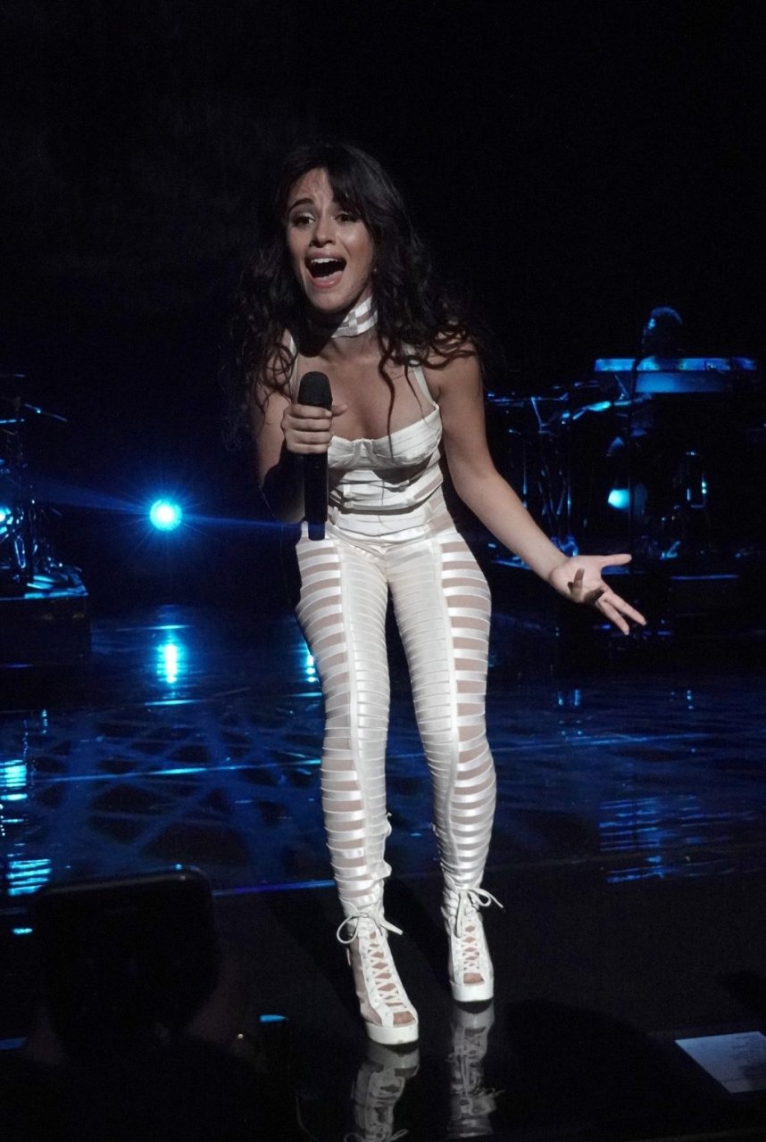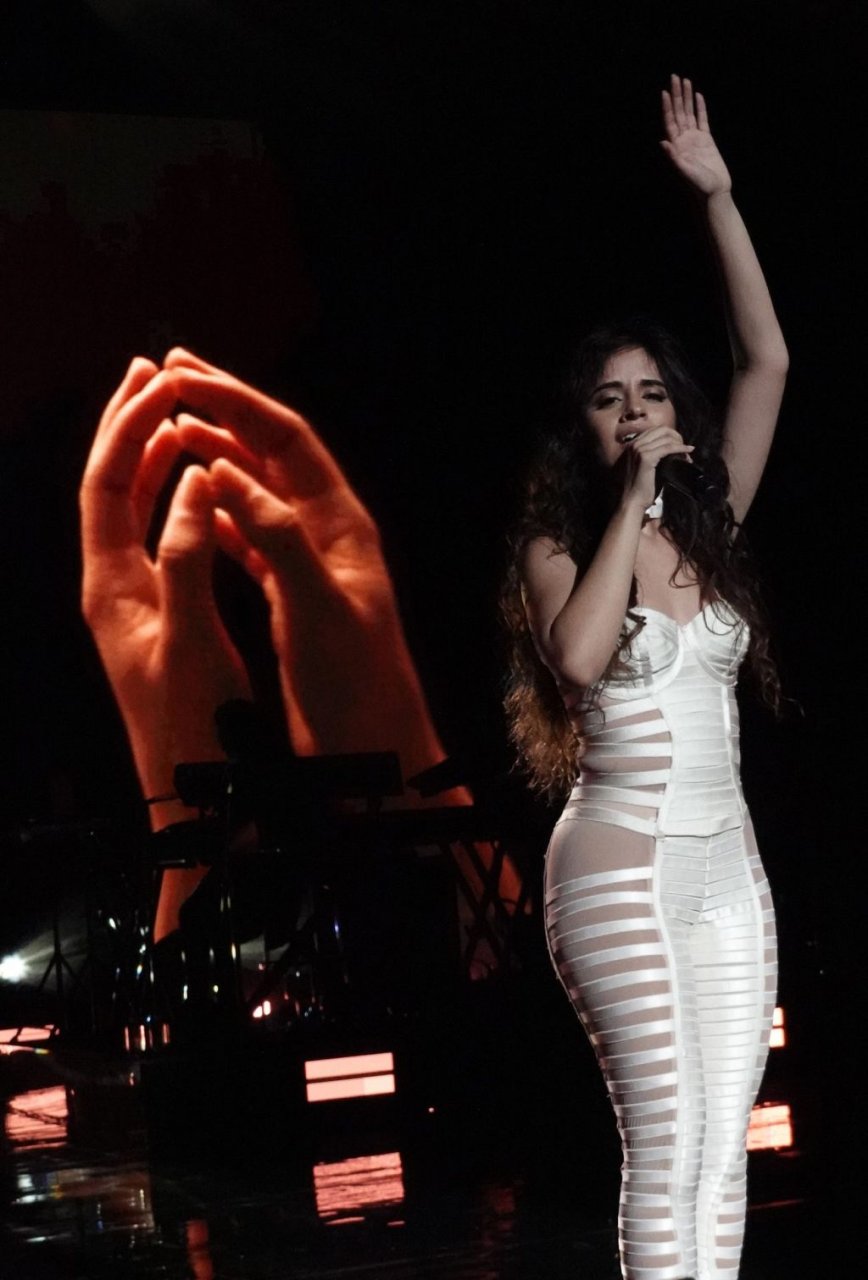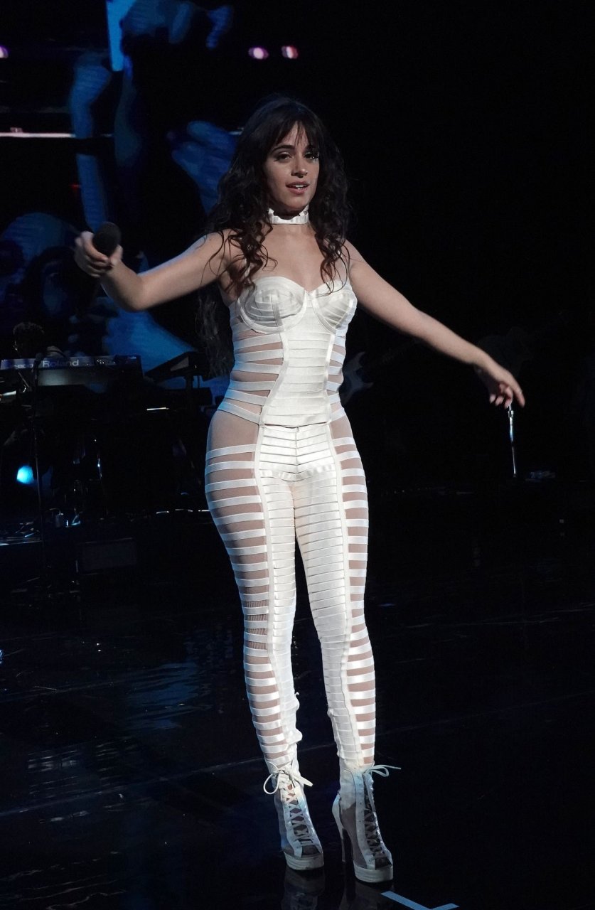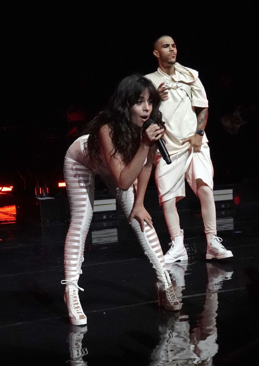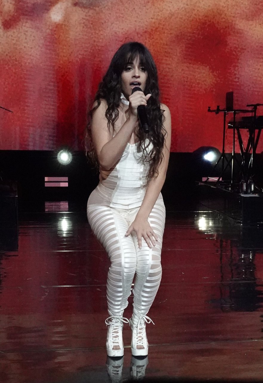 La cantante cubano-americana Camila Cabello indossa una tuta bianca con ritagli e stiletto allacciati mentre si esibisce dal vivo in concerto per Verizon Up al The Fillmore Miami Beach presso il Jackie Gleason Theater, 25/09/2019.