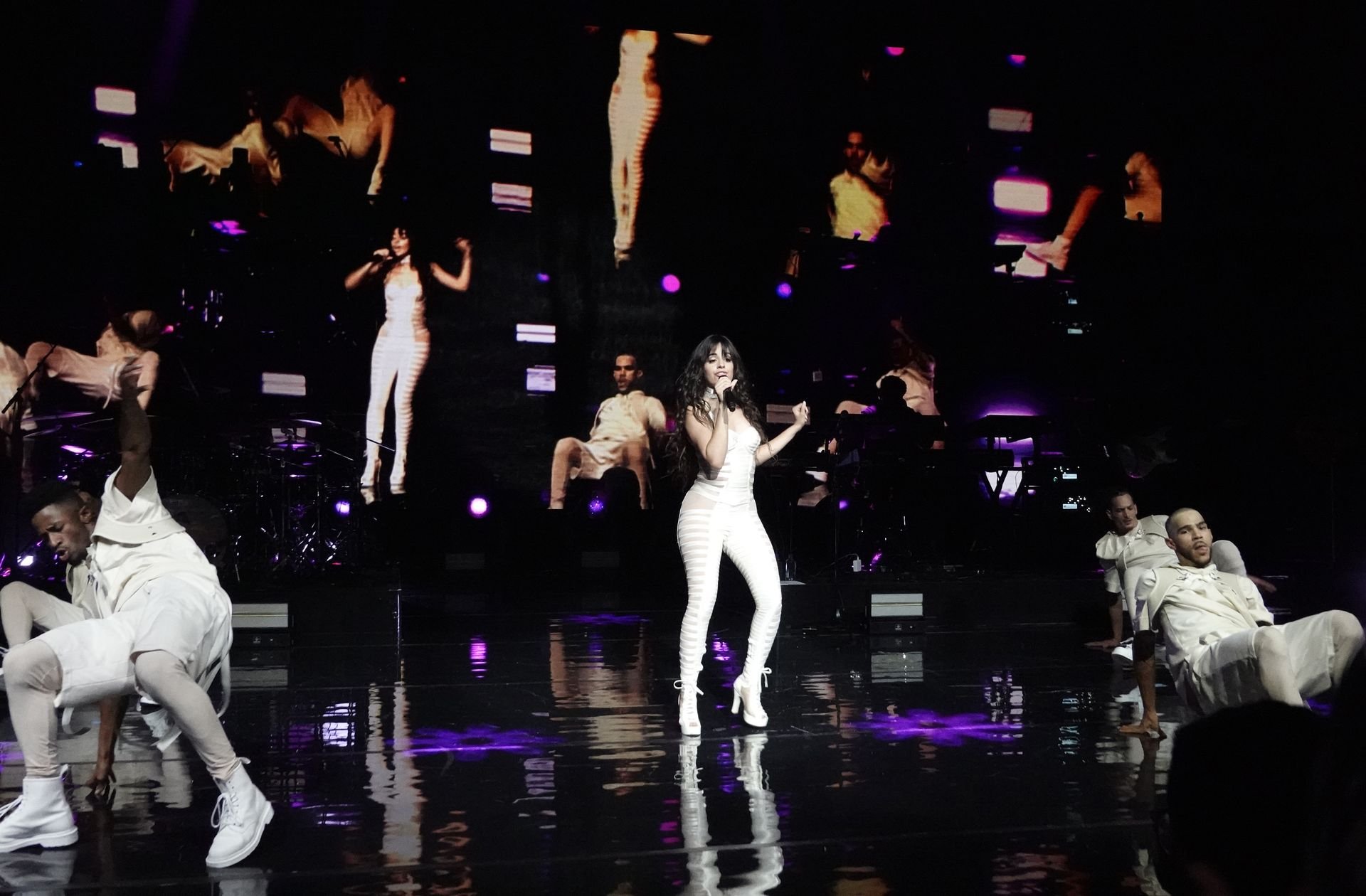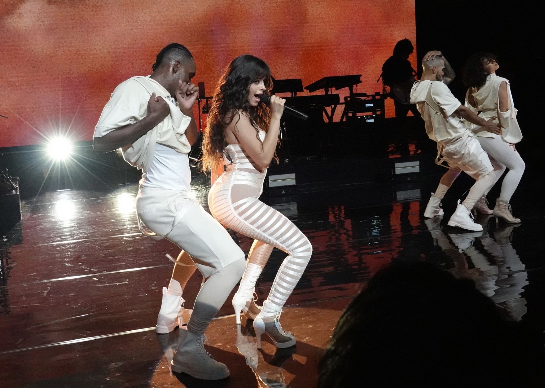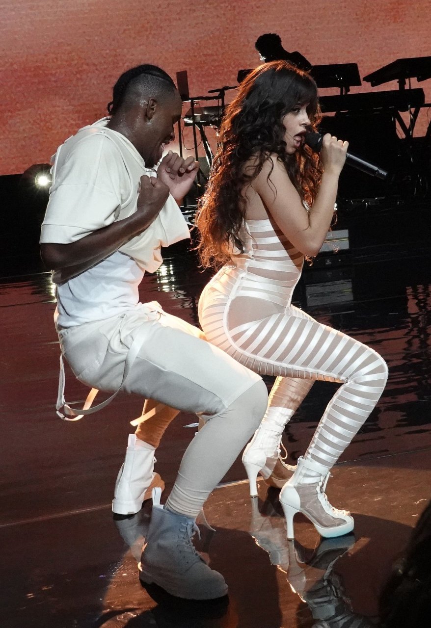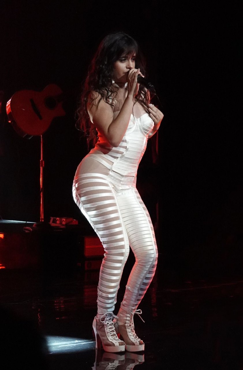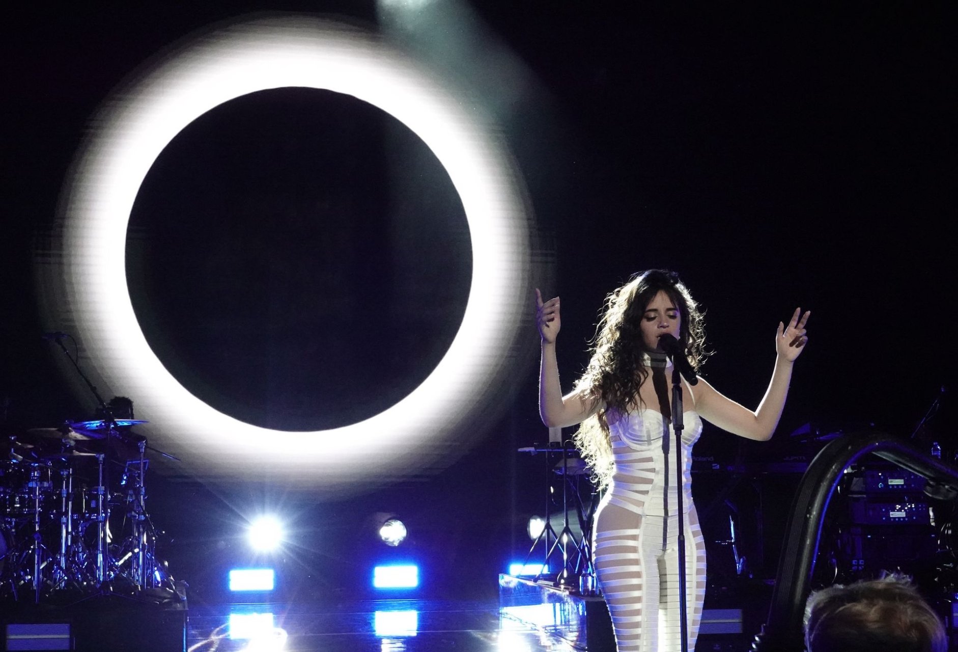 La cantante cubano-americana Camila Cabello indossa una tuta bianca con ritagli e stiletto allacciati mentre si esibisce dal vivo in concerto per Verizon Up al The Fillmore Miami Beach presso il Jackie Gleason Theater, 25/09/2019.