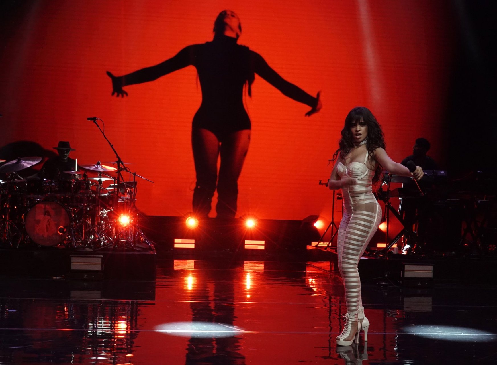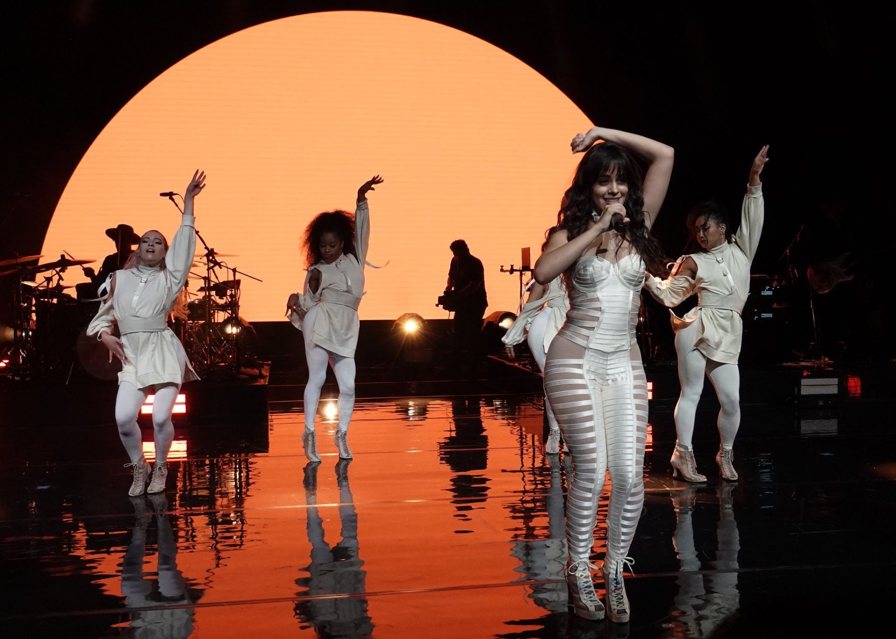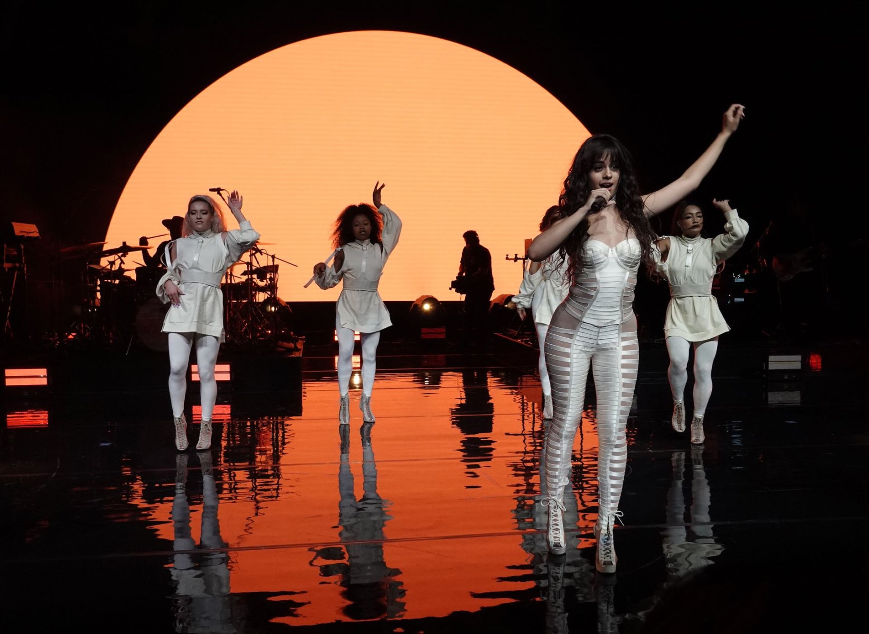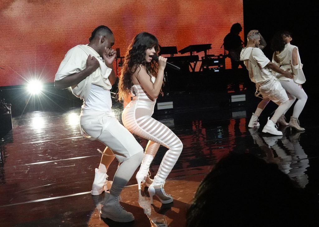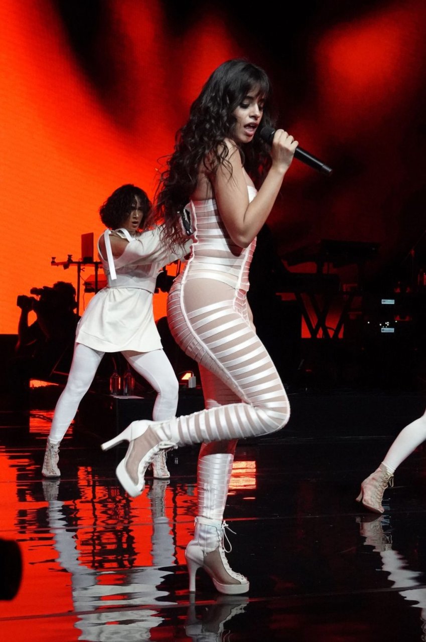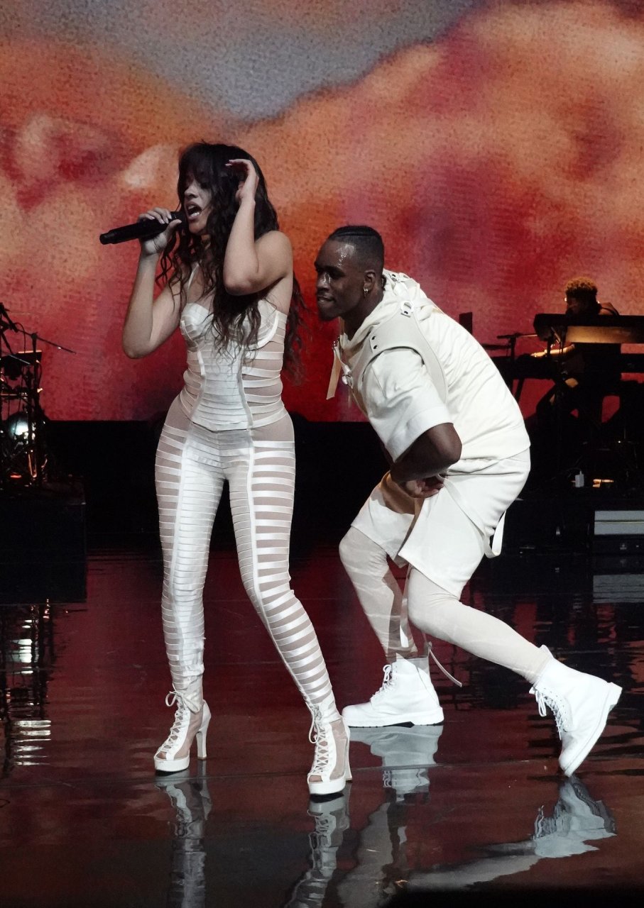 La cantante cubano-americana Camila Cabello indossa una tuta bianca con ritagli e stiletto allacciati mentre si esibisce dal vivo in concerto per Verizon Up al The Fillmore Miami Beach presso il Jackie Gleason Theater, 25/09/2019.