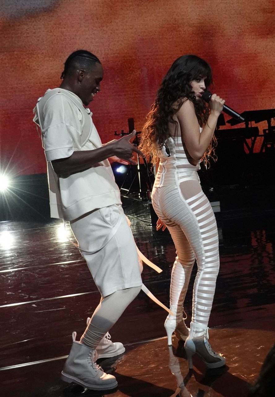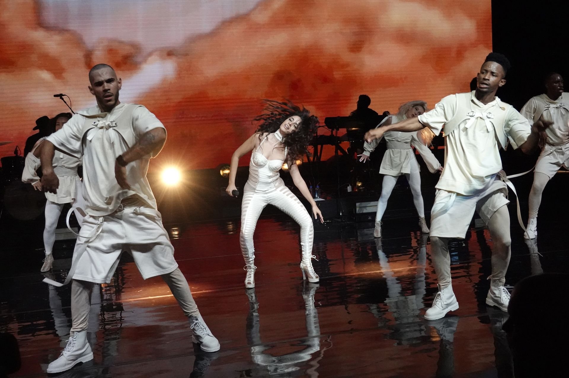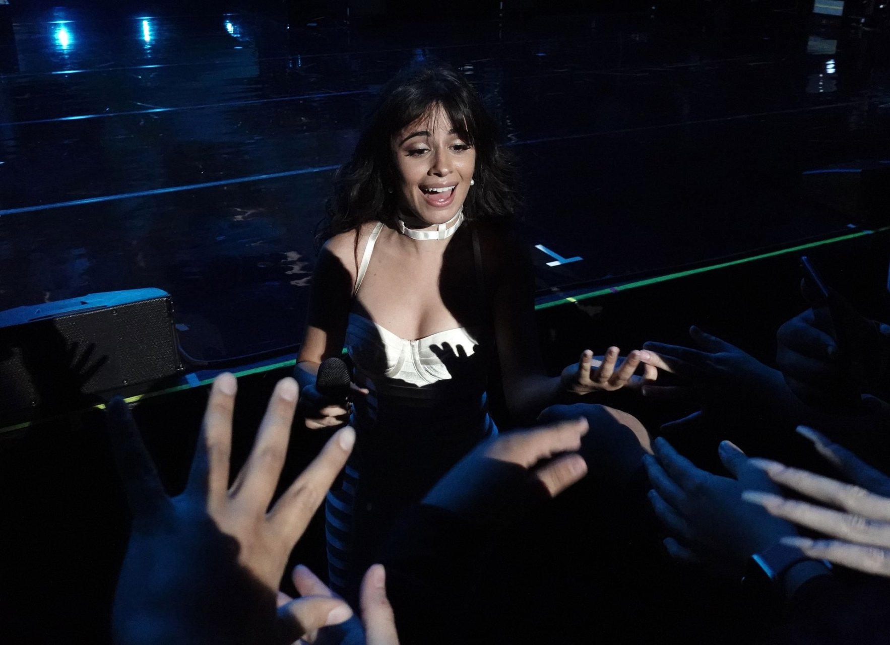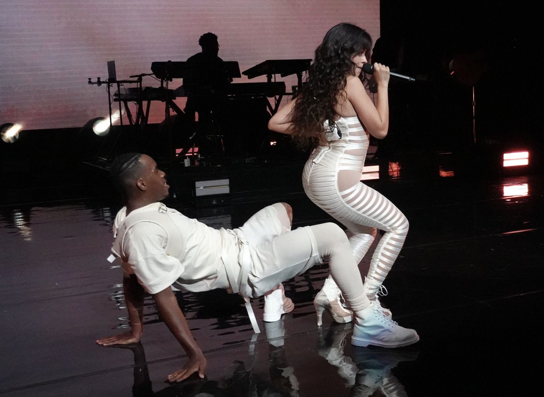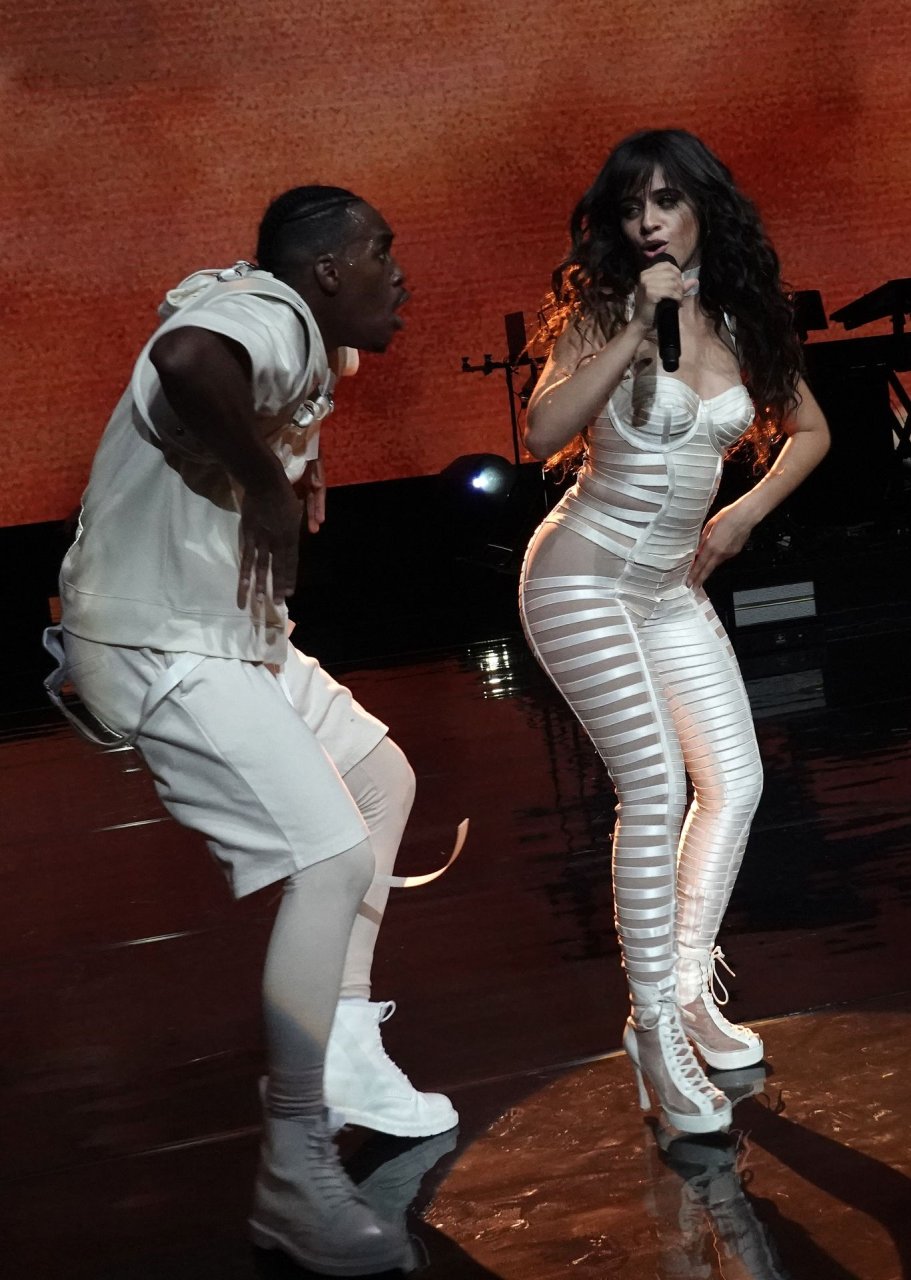 La cantante cubano-americana Camila Cabello indossa una tuta bianca con ritagli e stiletto allacciati mentre si esibisce dal vivo in concerto per Verizon Up al The Fillmore Miami Beach presso il Jackie Gleason Theater, 25/09/2019.