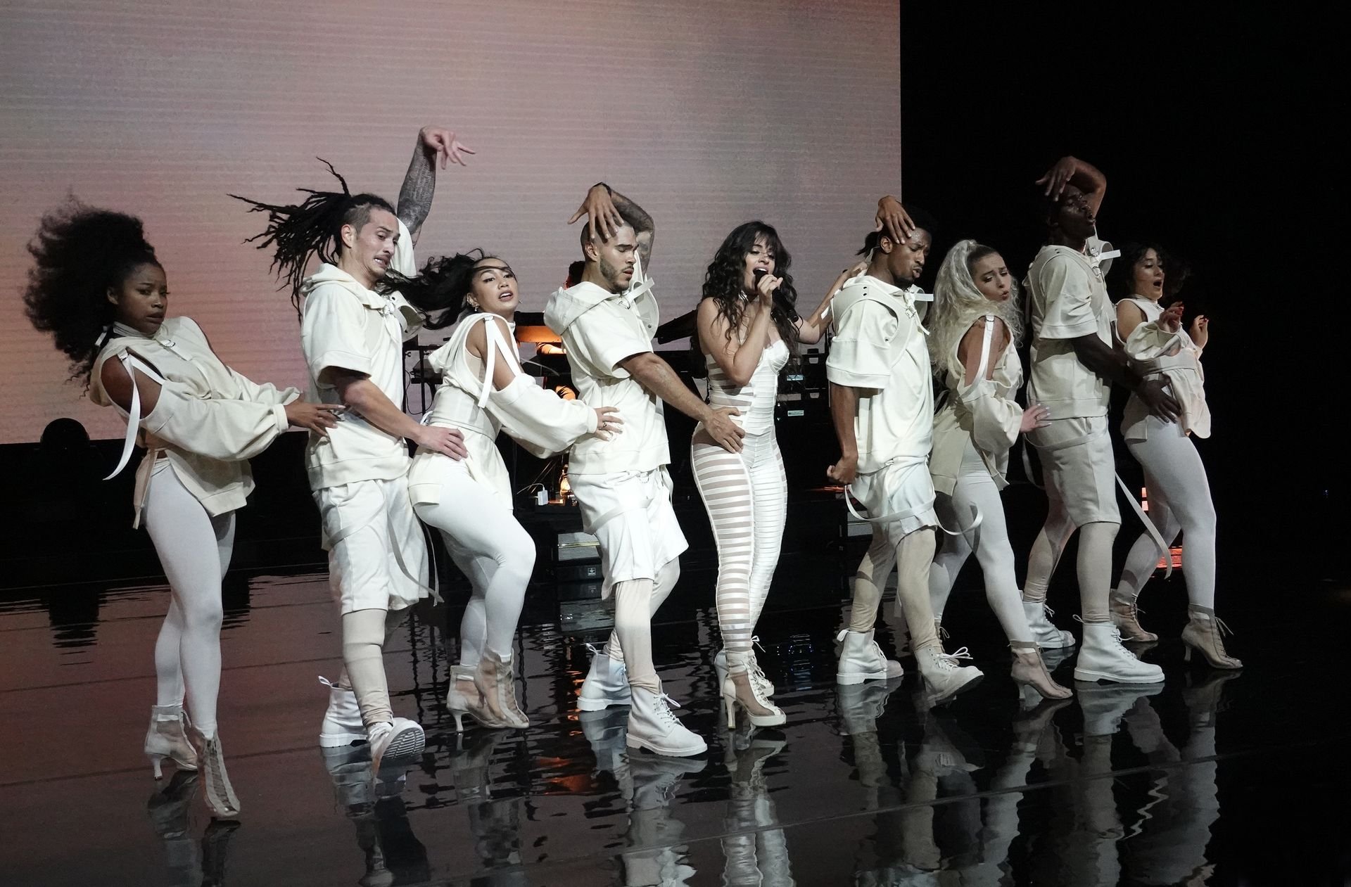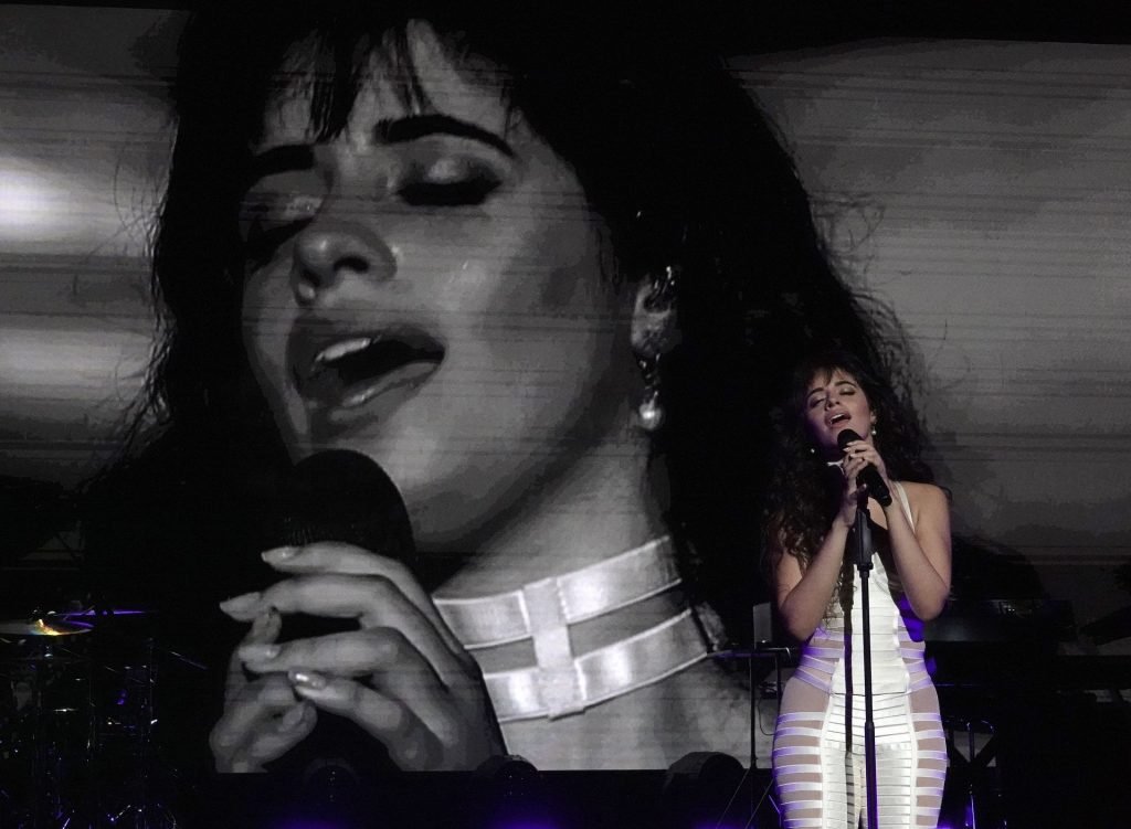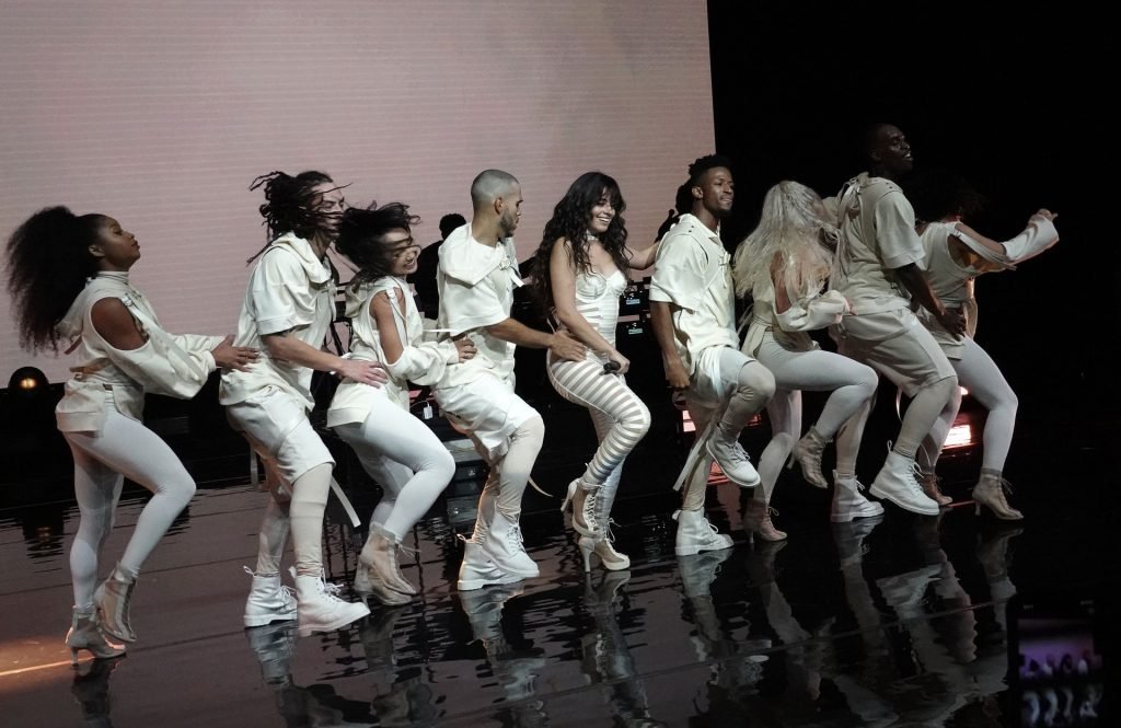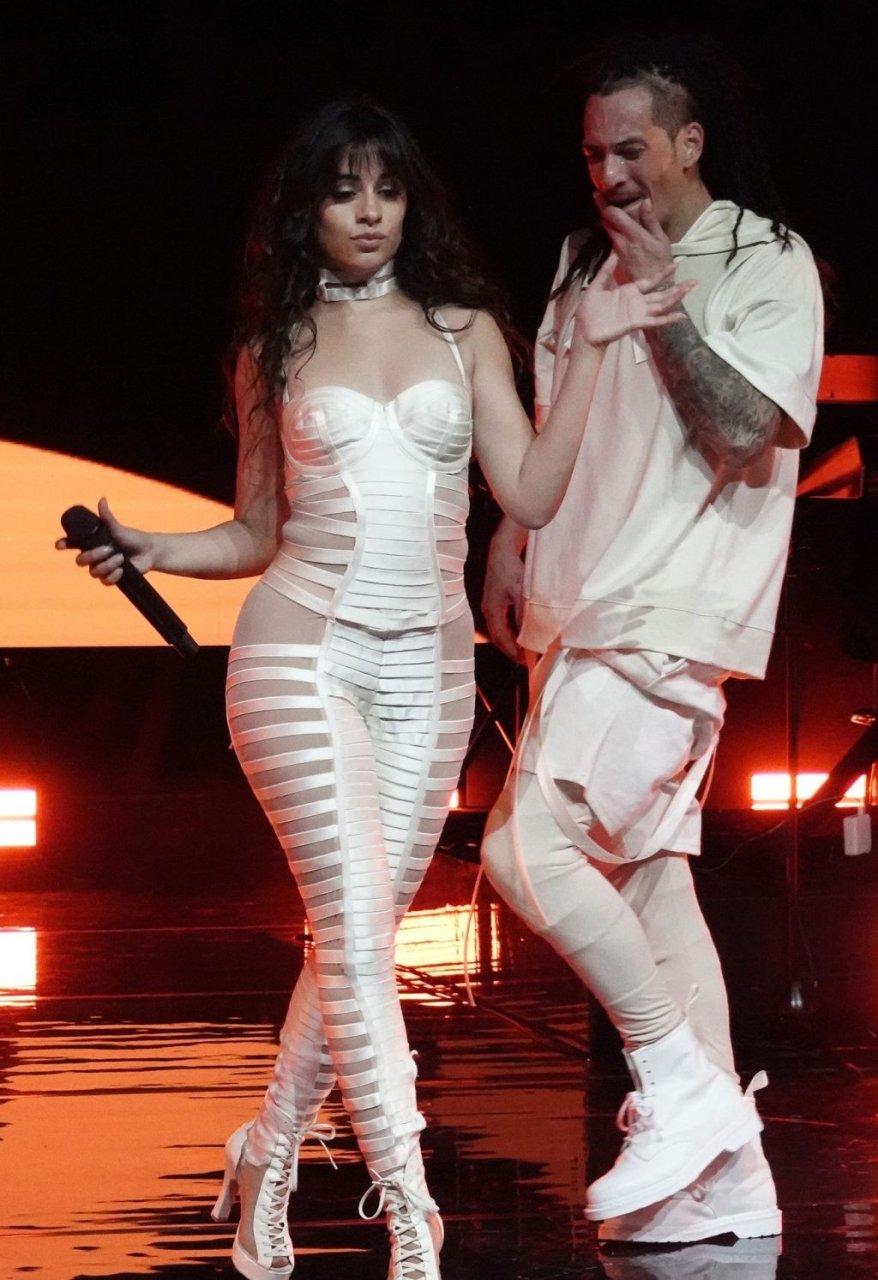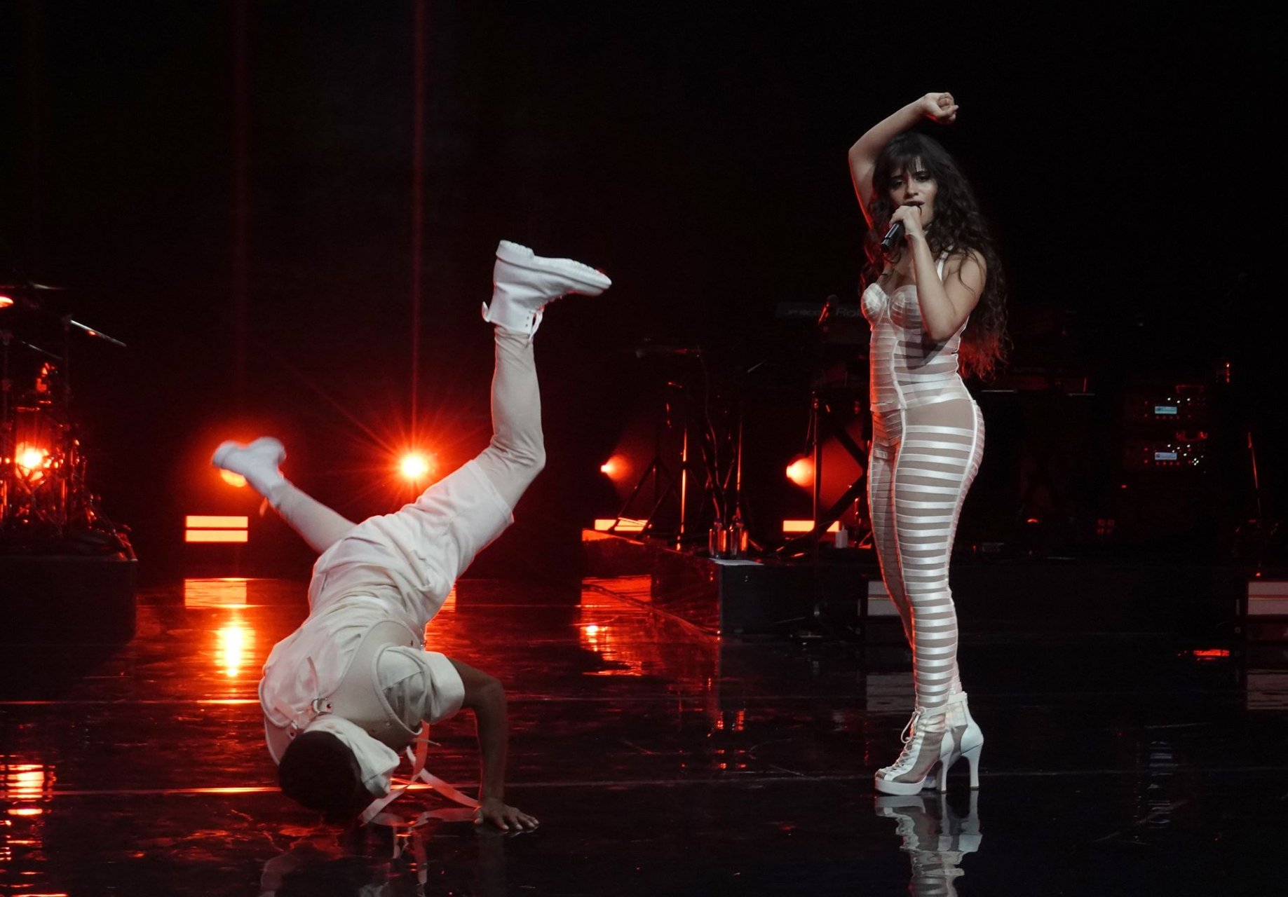 La cantante cubano-americana Camila Cabello indossa una tuta bianca con ritagli e stiletto allacciati mentre si esibisce dal vivo in concerto per Verizon Up al The Fillmore Miami Beach presso il Jackie Gleason Theater, 25/09/2019.