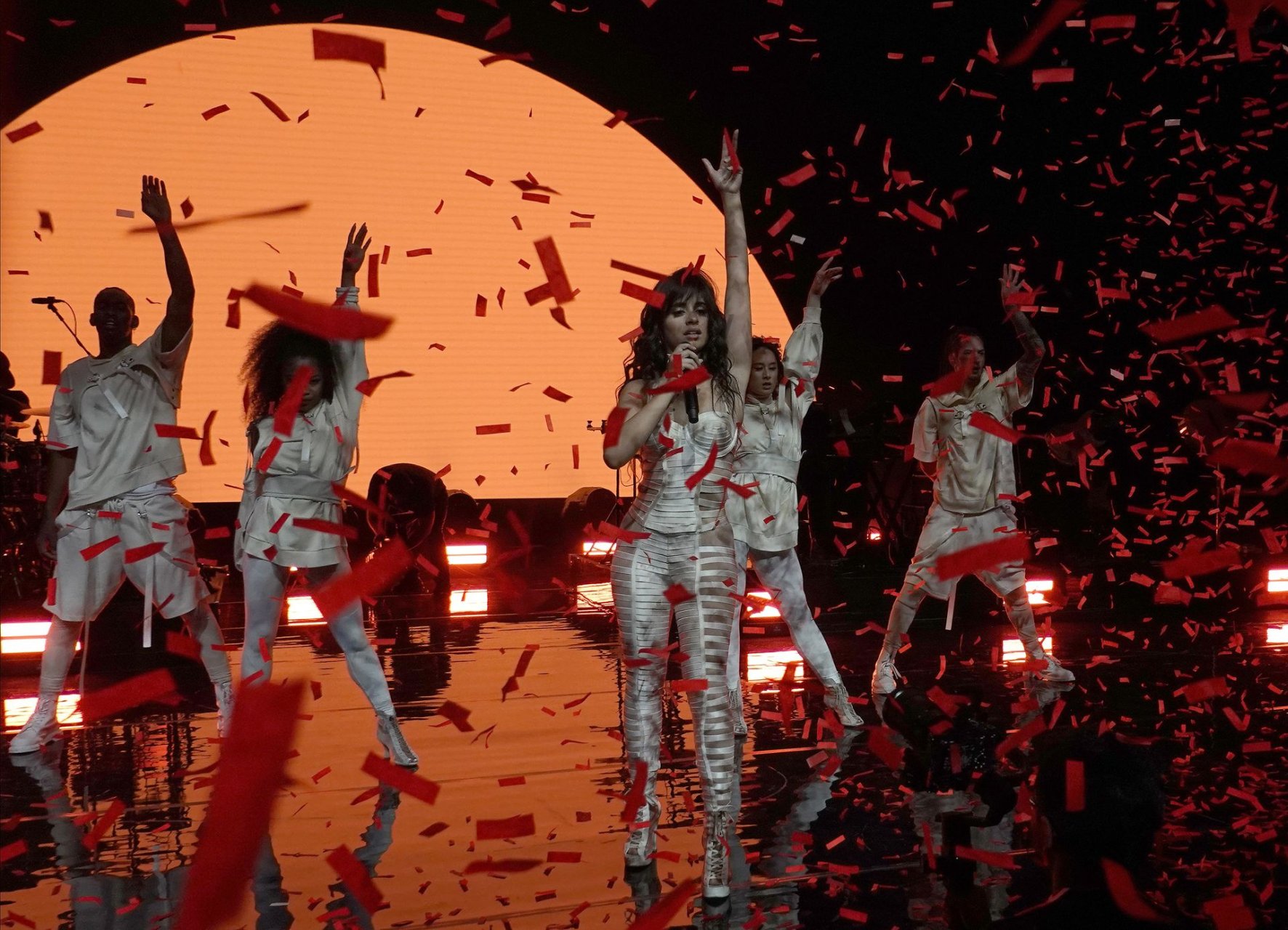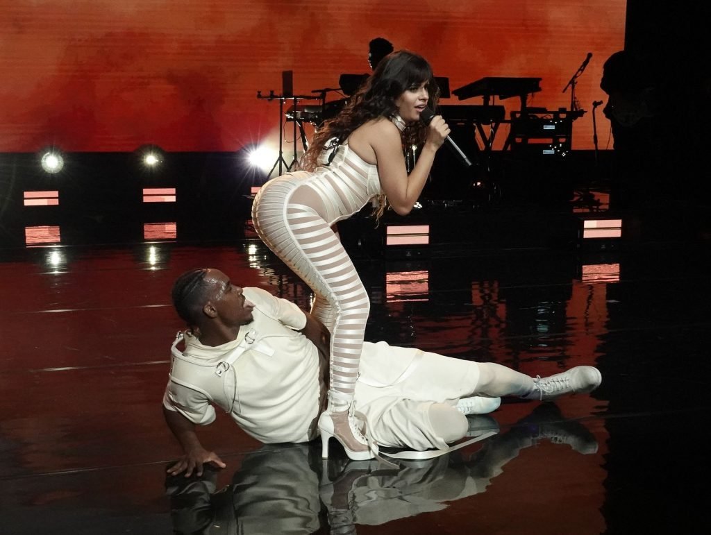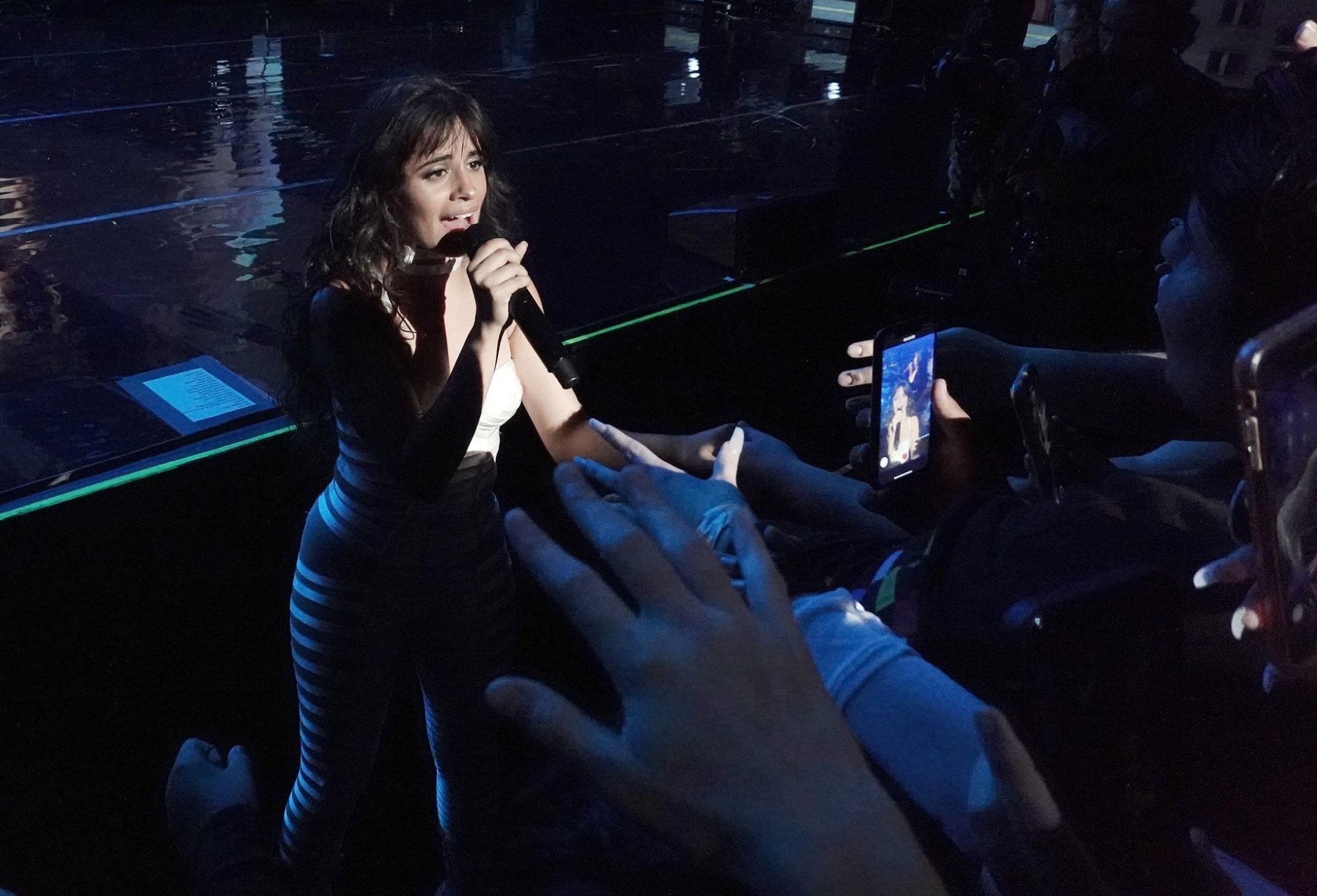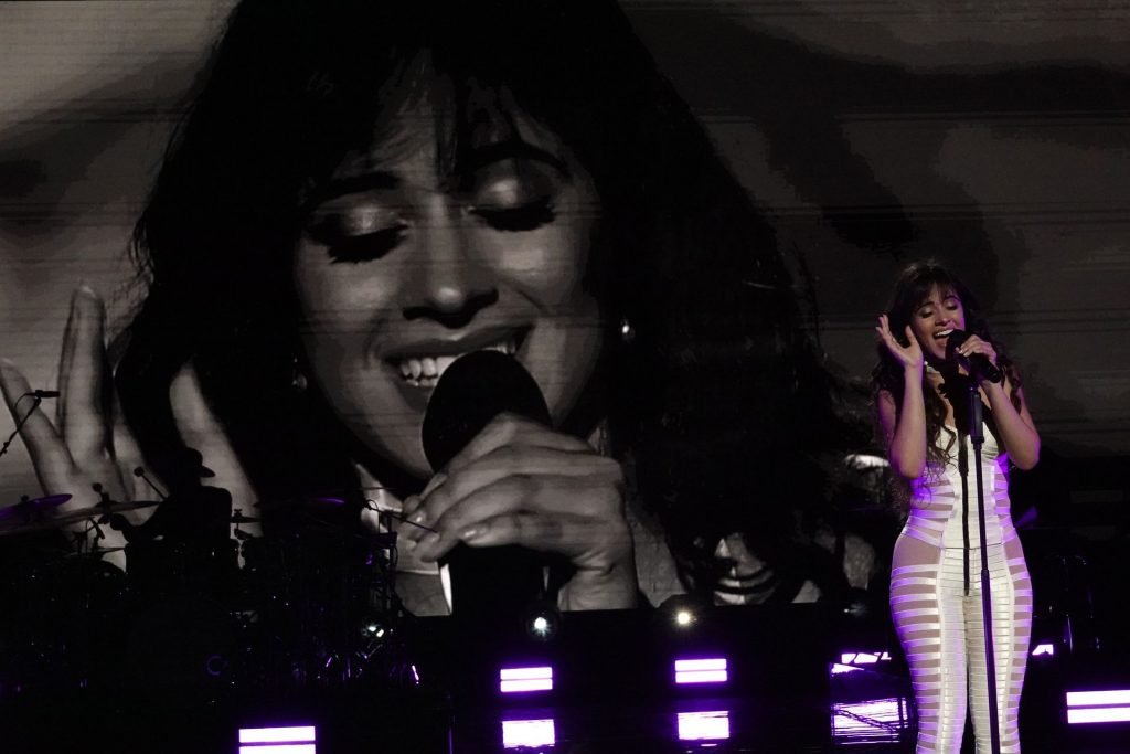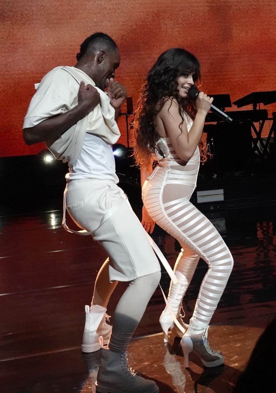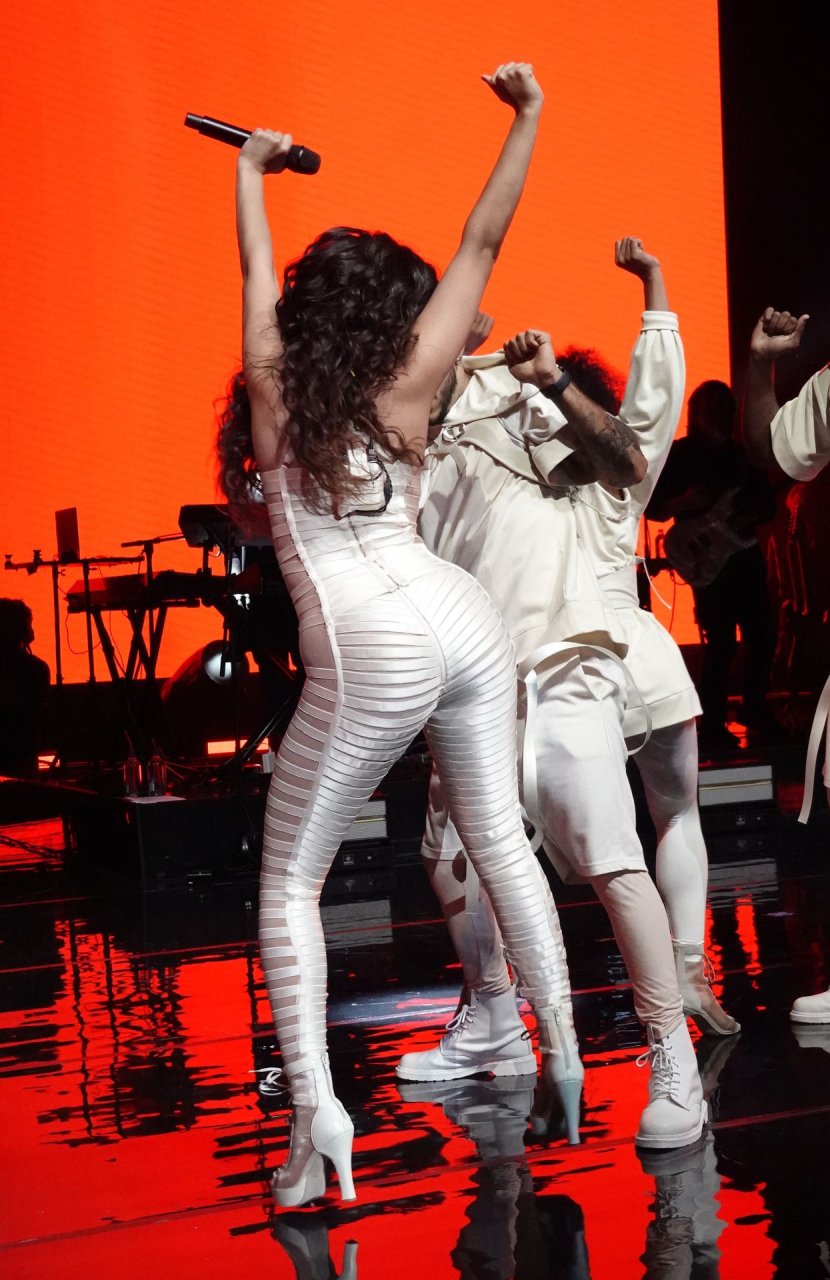 La cantante cubano-americana Camila Cabello indossa una tuta bianca con ritagli e stiletto allacciati mentre si esibisce dal vivo in concerto per Verizon Up al The Fillmore Miami Beach presso il Jackie Gleason Theater, 25/09/2019.
