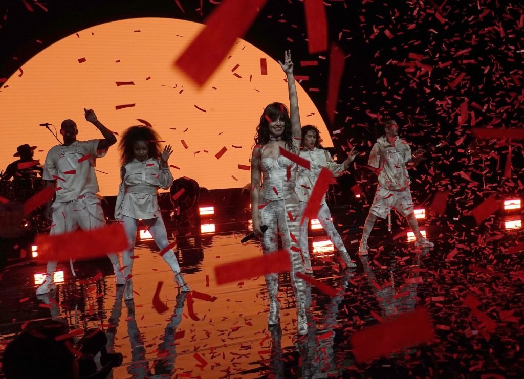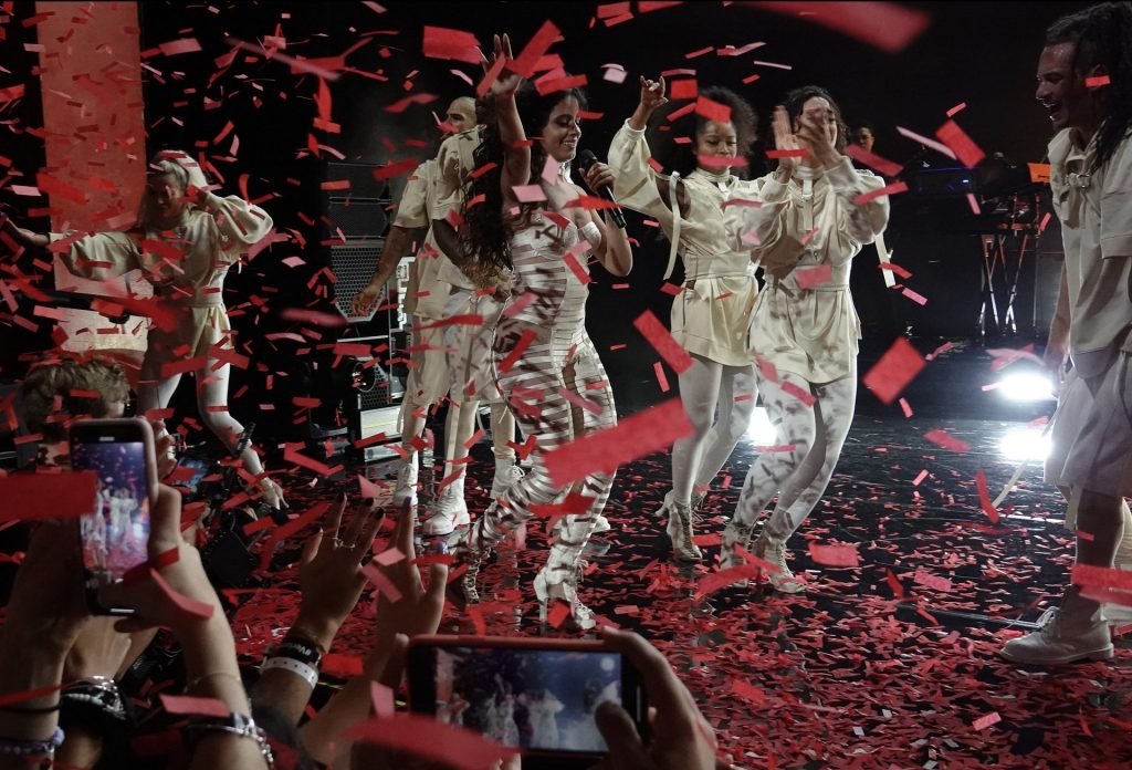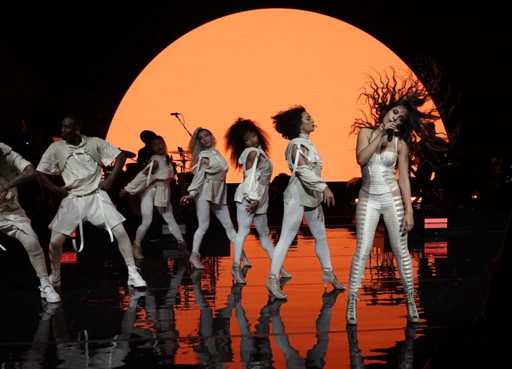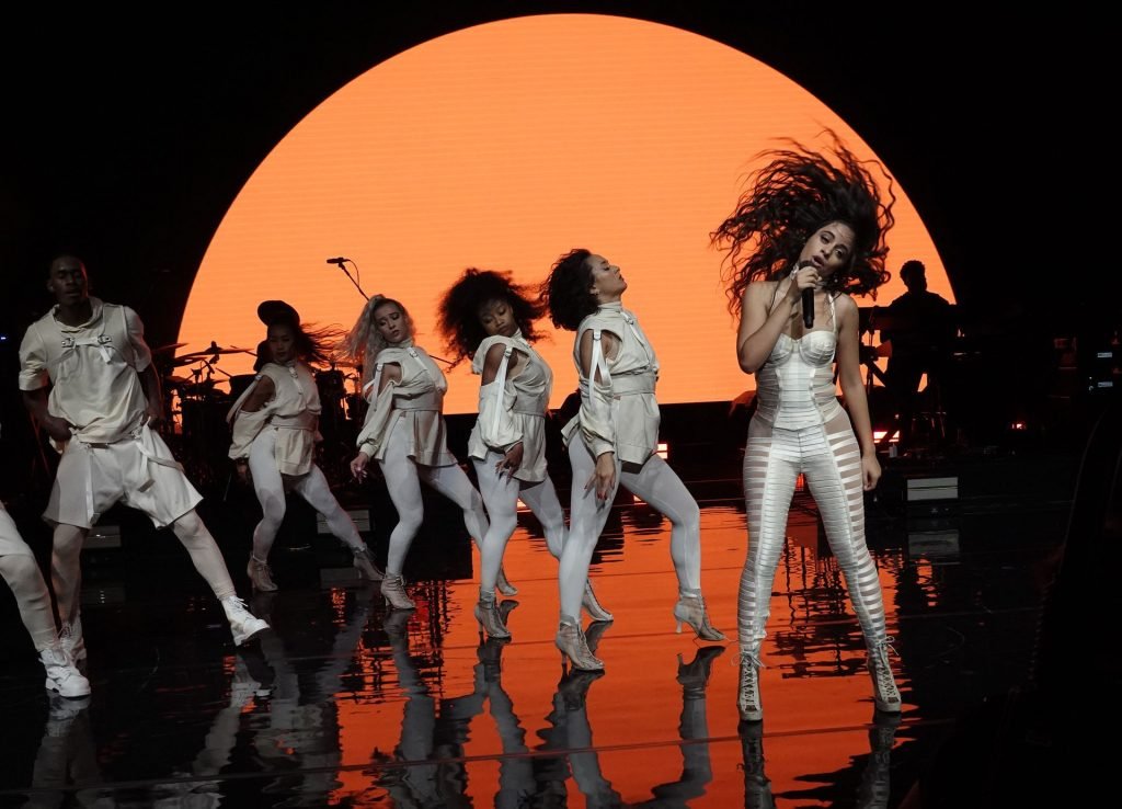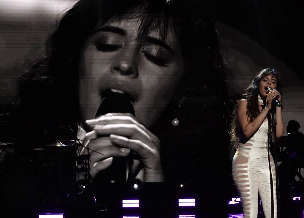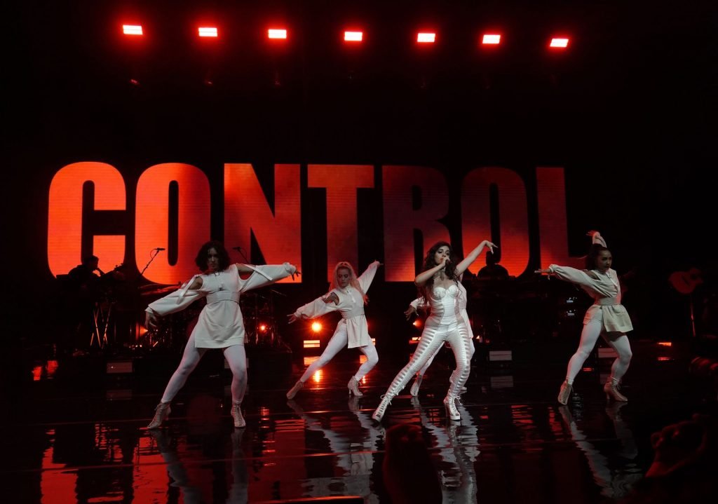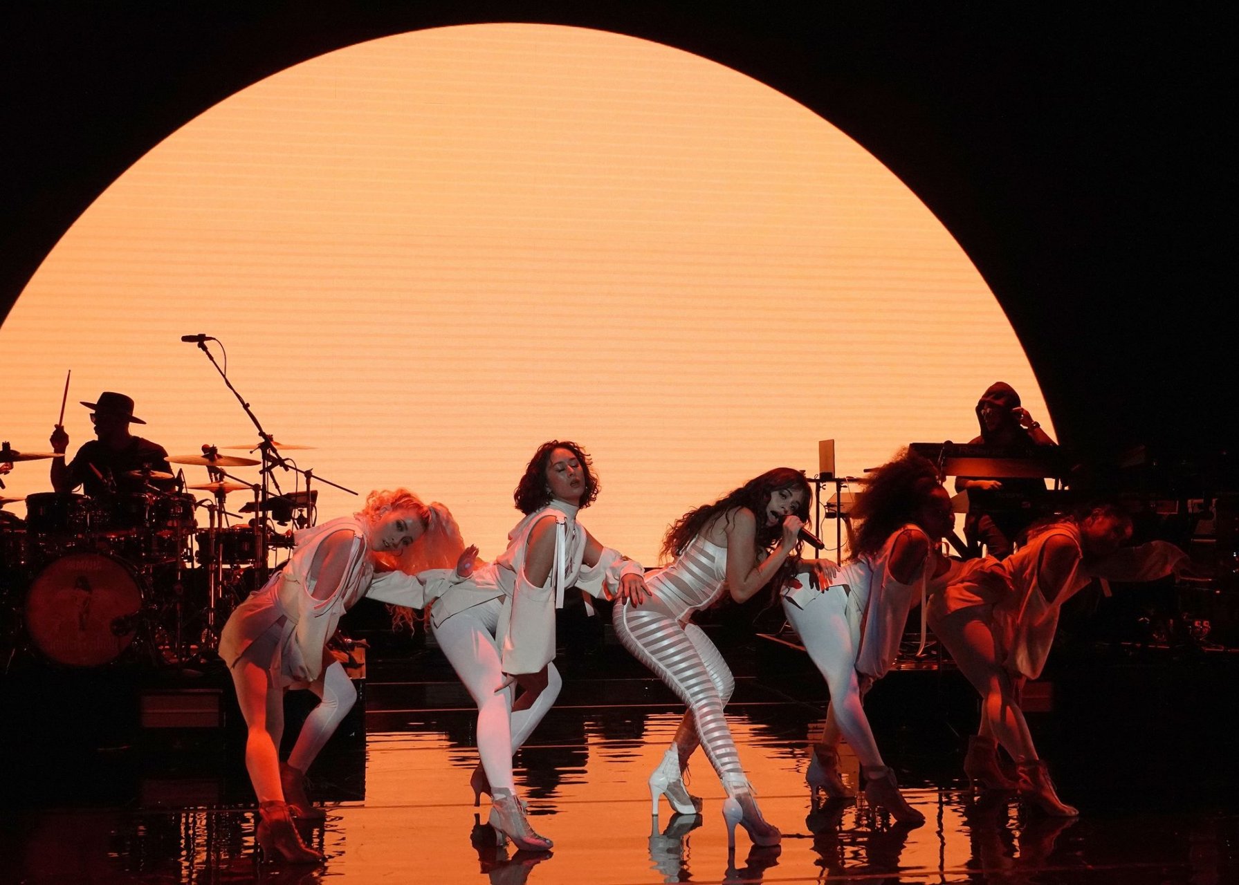 La cantante cubano-americana Camila Cabello indossa una tuta bianca con ritagli e stiletto allacciati mentre si esibisce dal vivo in concerto per Verizon Up al The Fillmore Miami Beach presso il Jackie Gleason Theater, 25/09/2019.