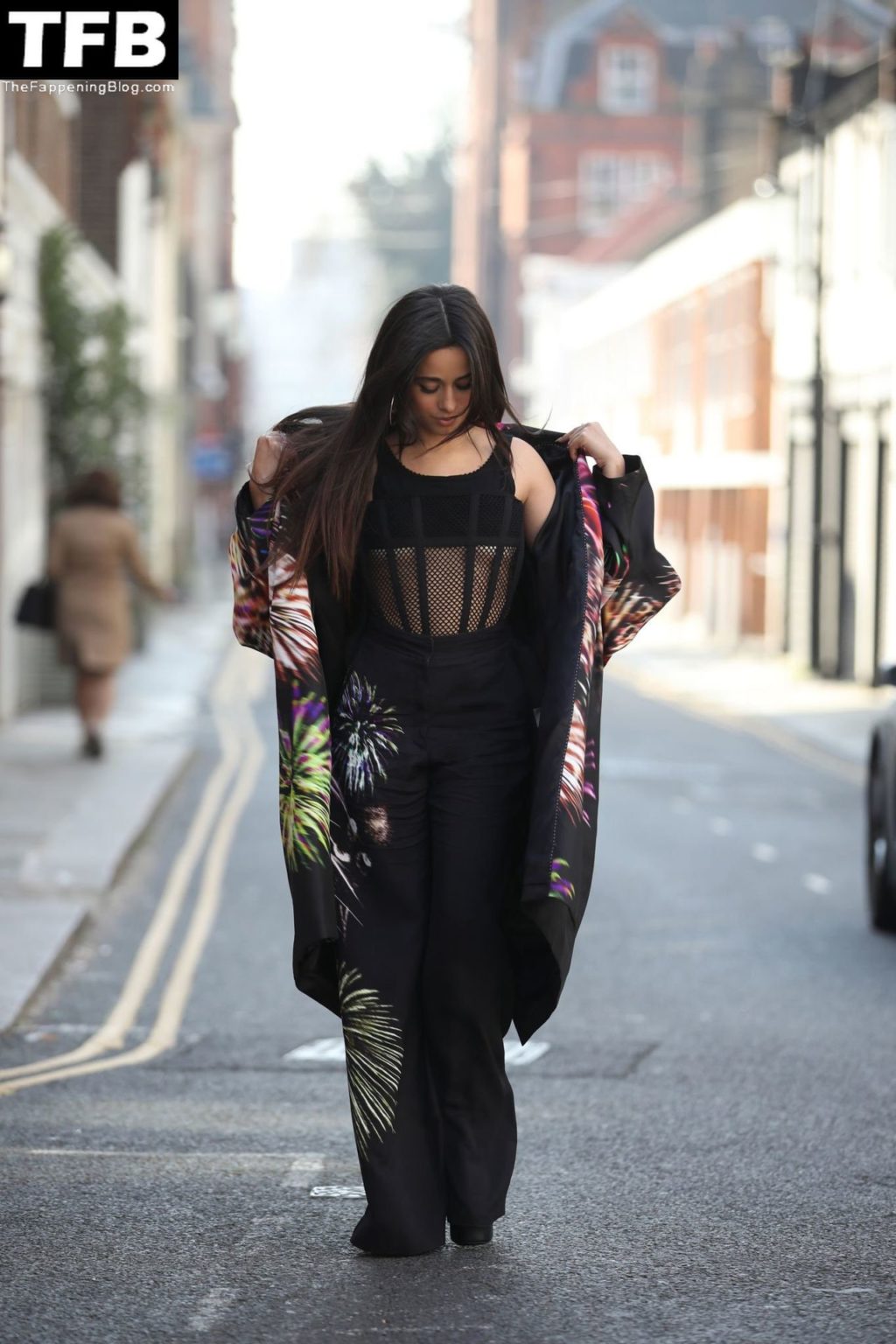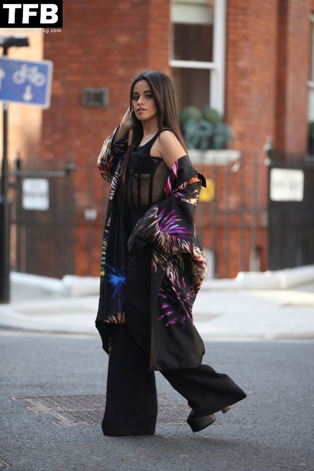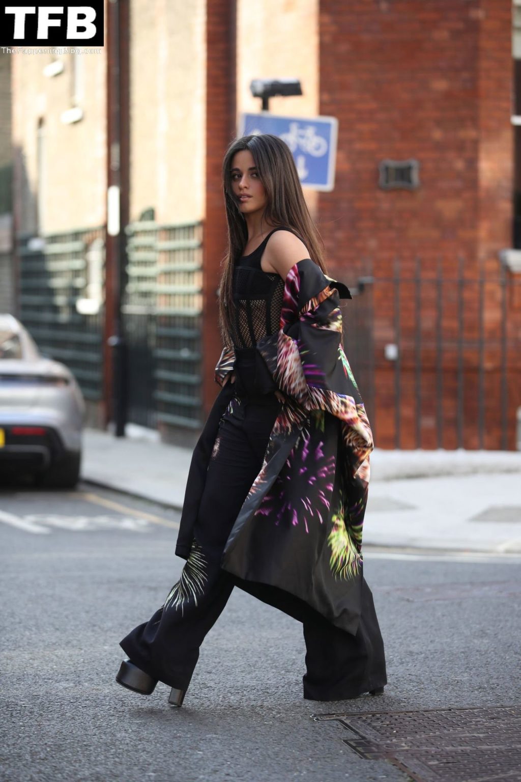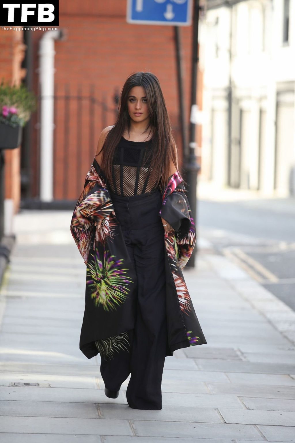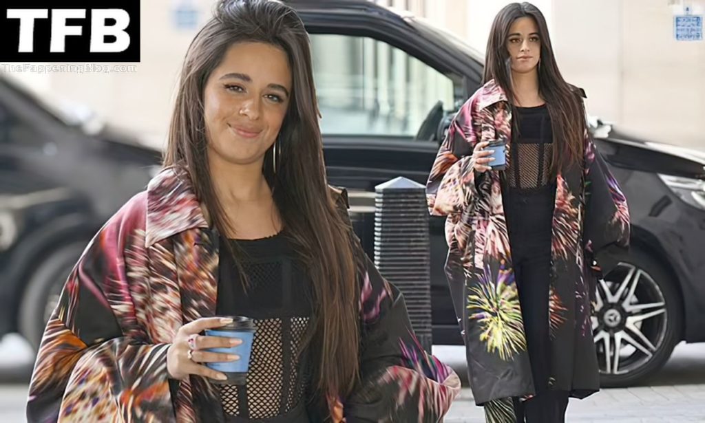 La cantante Camila Cabello sfoggia un look alla moda con un top nero trasparente e una giacca multicolore mentre arriva a Radio a Londra 1 giovedì.