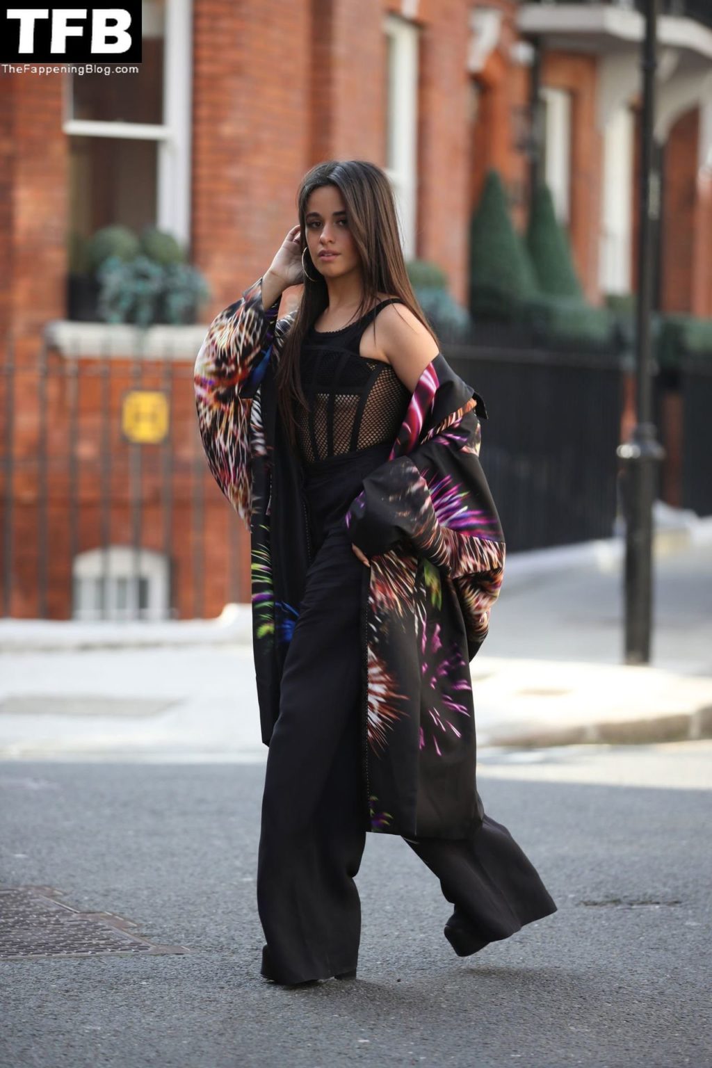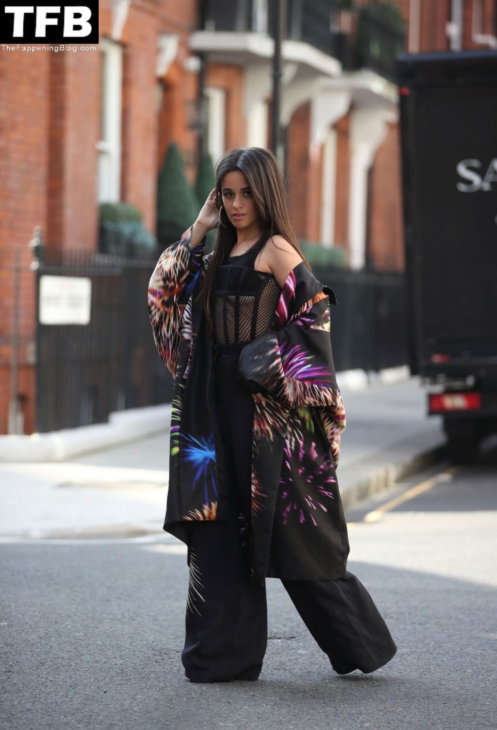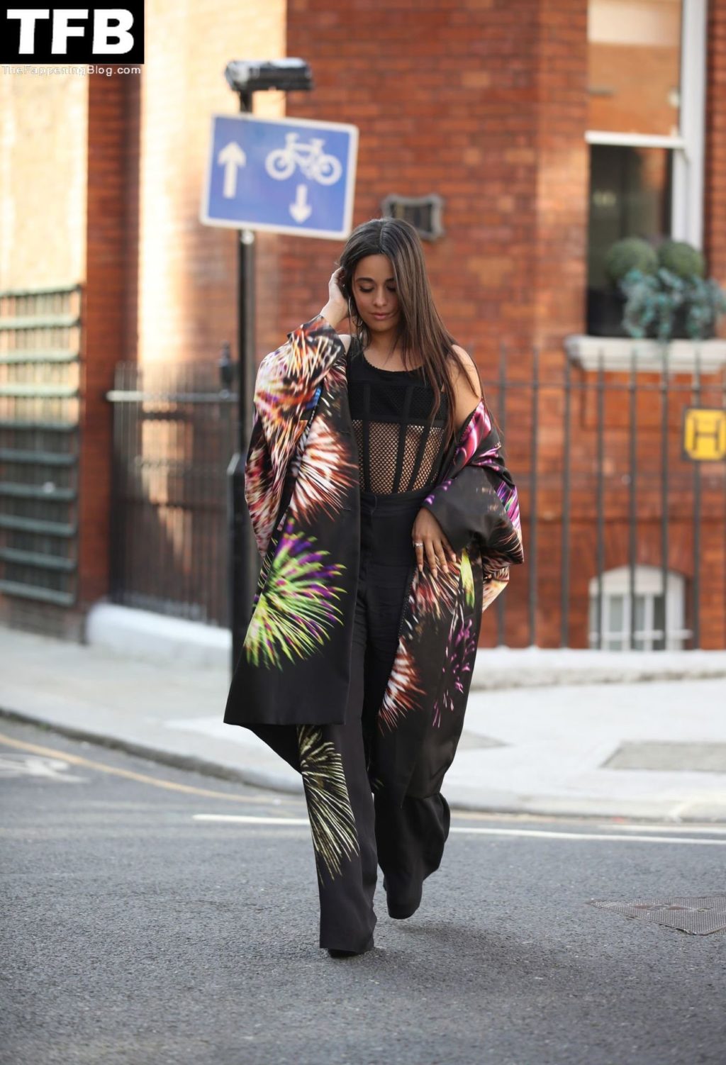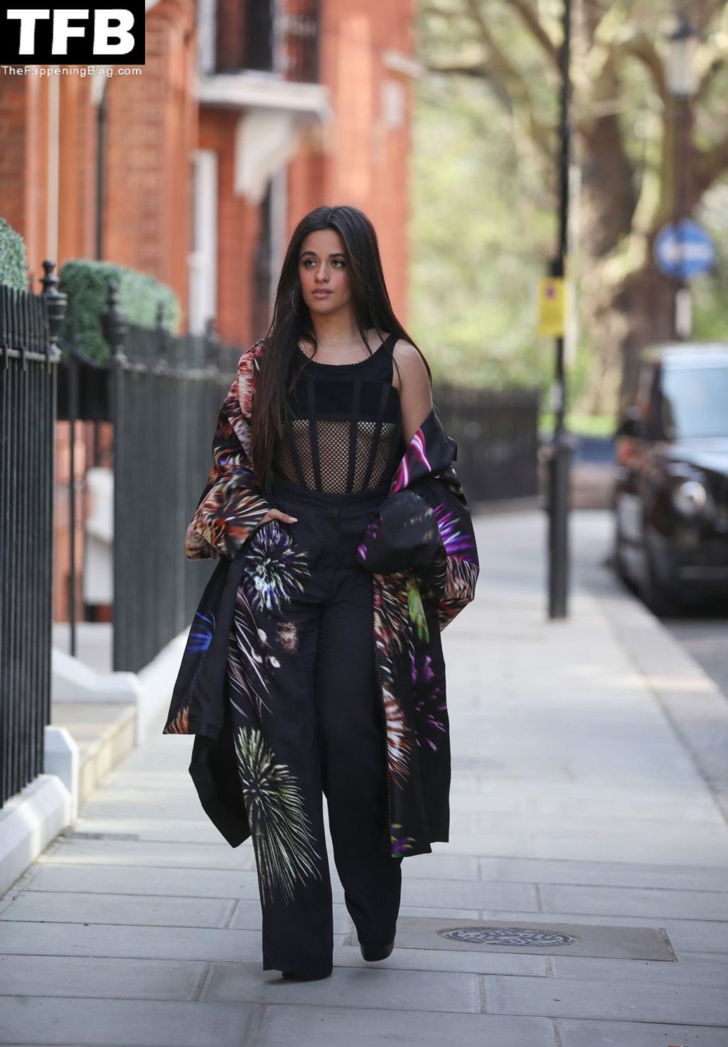 La cantante Camila Cabello sfoggia un look alla moda con un top nero trasparente e una giacca multicolore mentre arriva a Radio a Londra 1 giovedì.