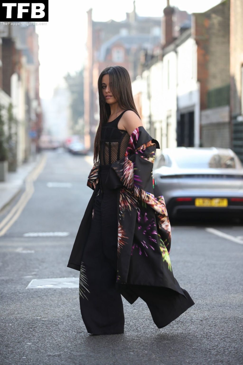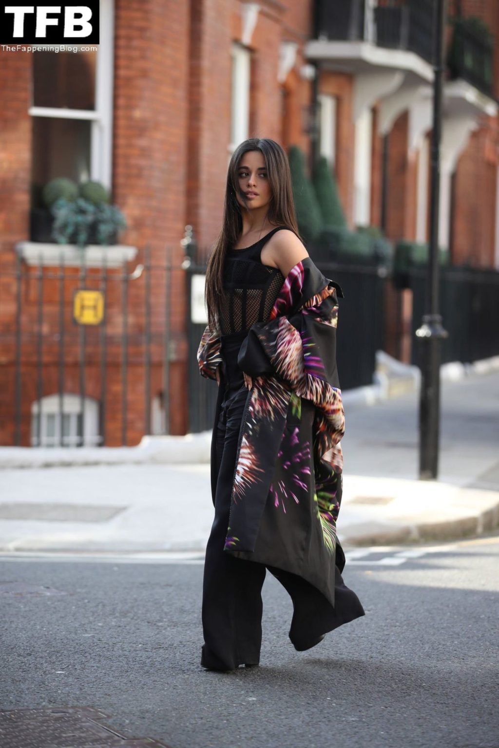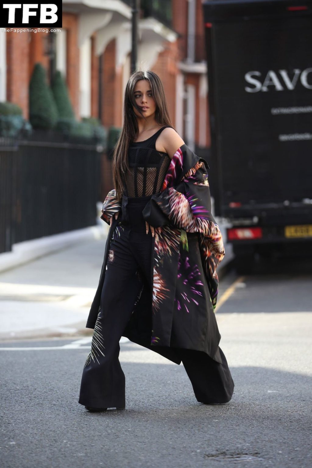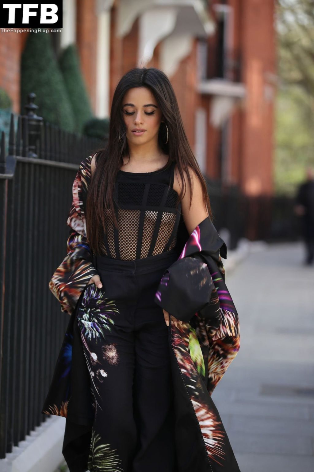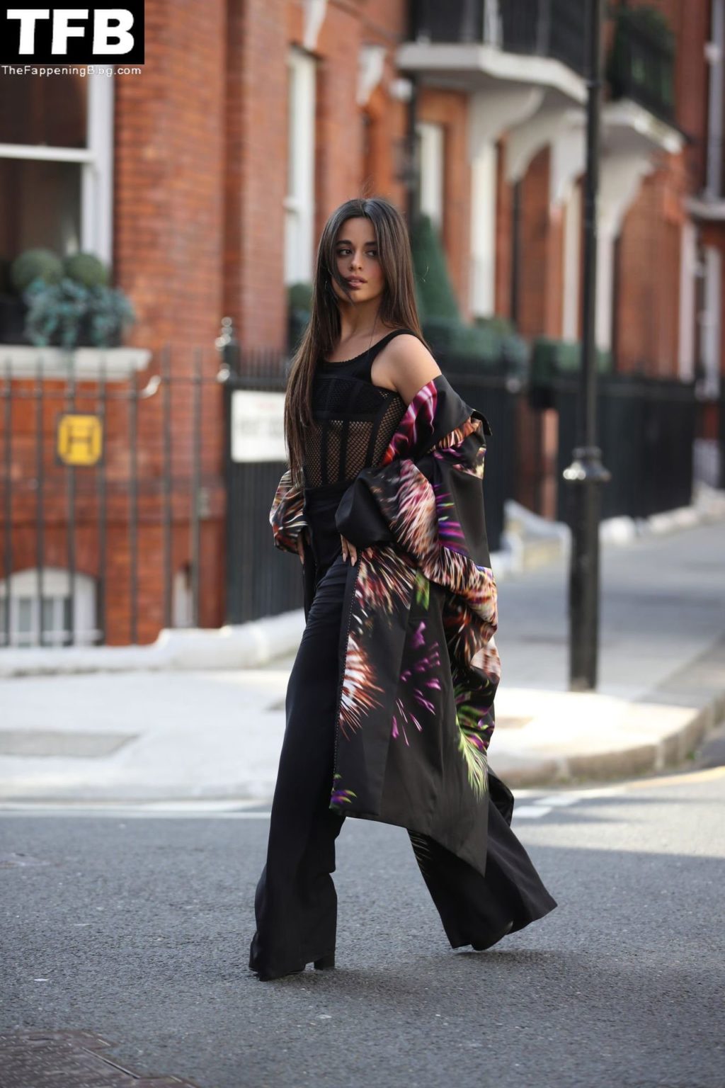 La cantante Camila Cabello sfoggia un look alla moda con un top nero trasparente e una giacca multicolore mentre arriva a Radio a Londra 1 giovedì.