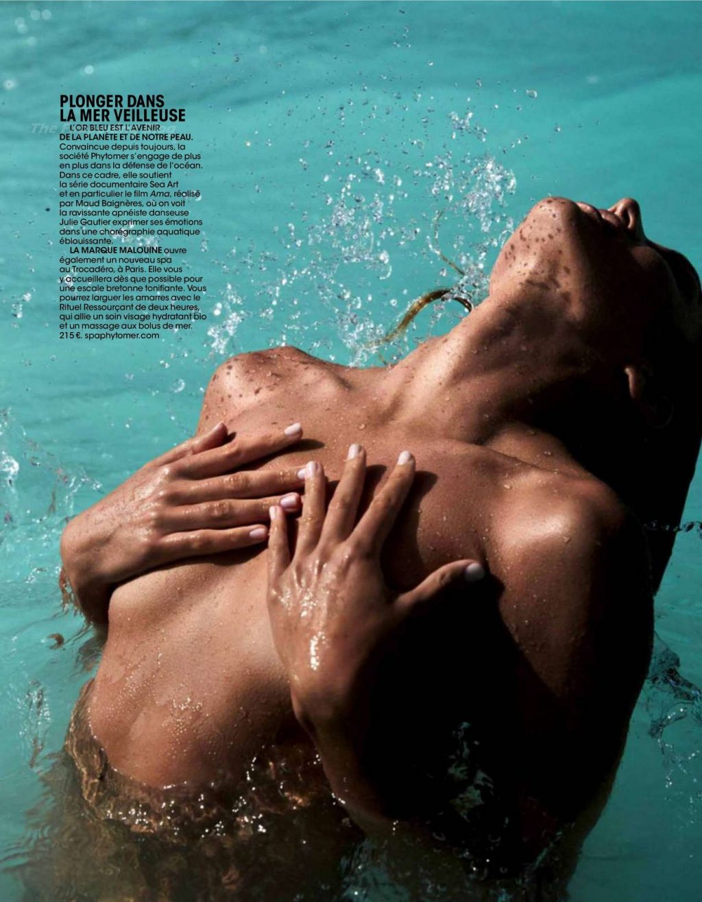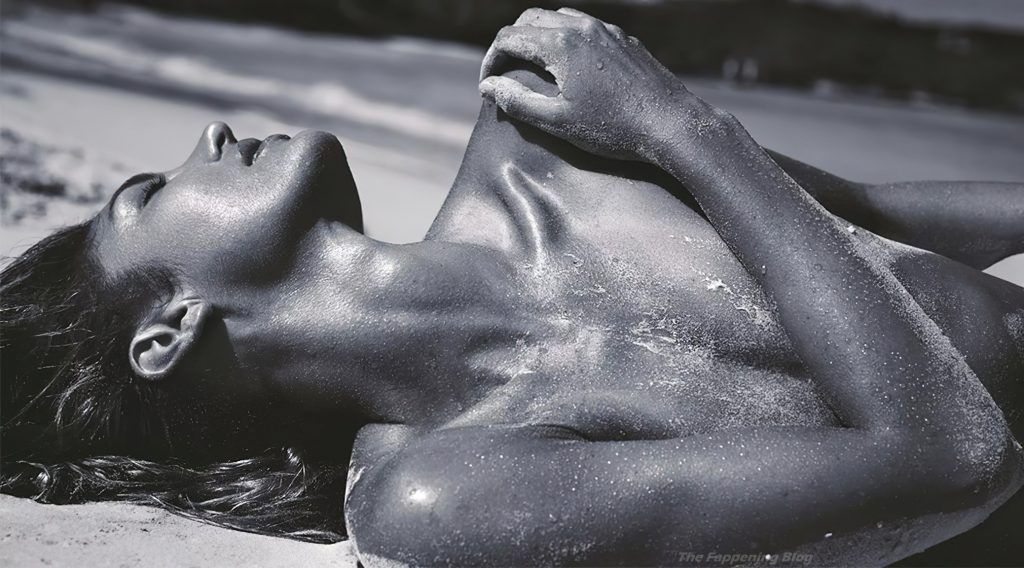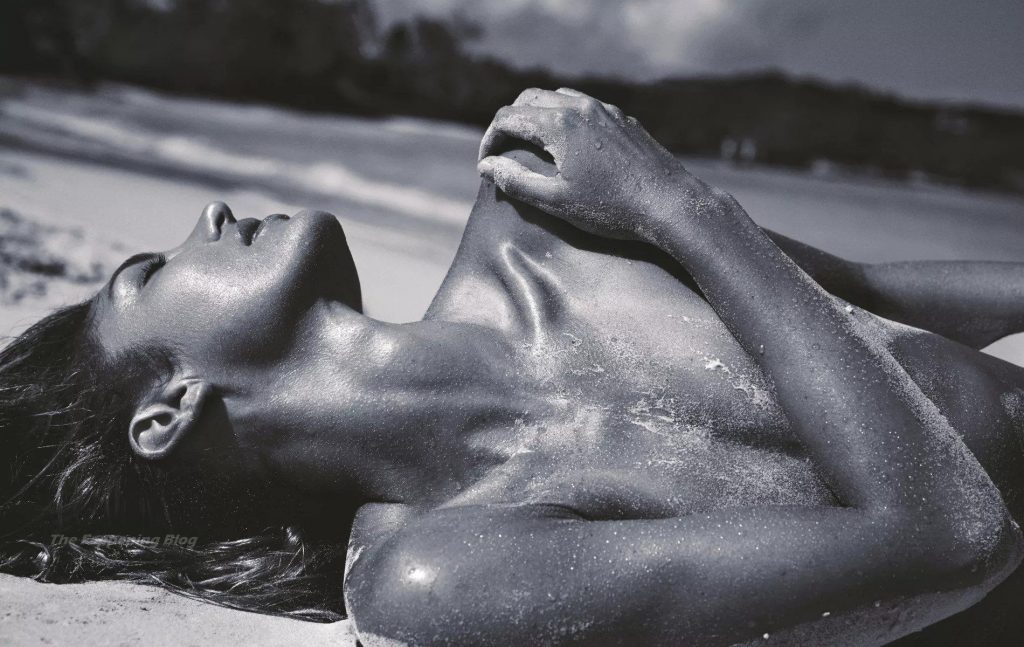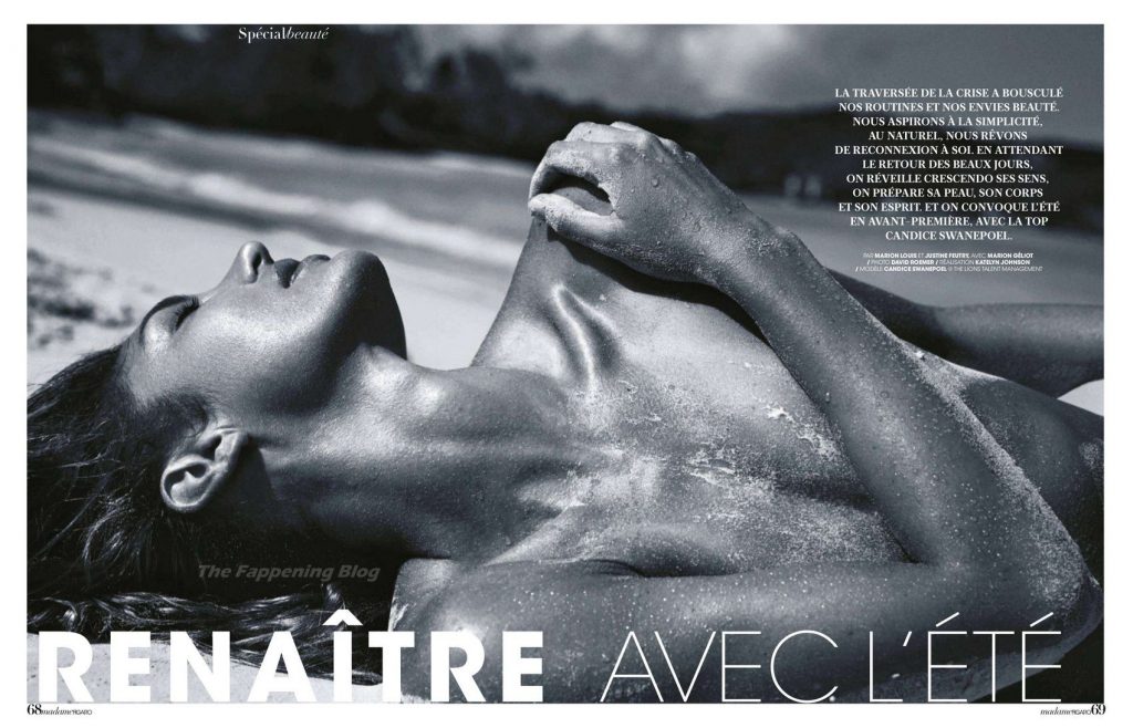 La modella Candice Swanepoel si bagna e mostra i suoi seni nudi posando quasi nuda in un servizio fotografico di David Roemer per la rivista Madame Figaro Paris, numero di aprile 2021.