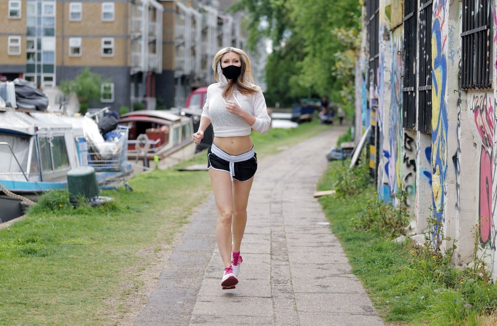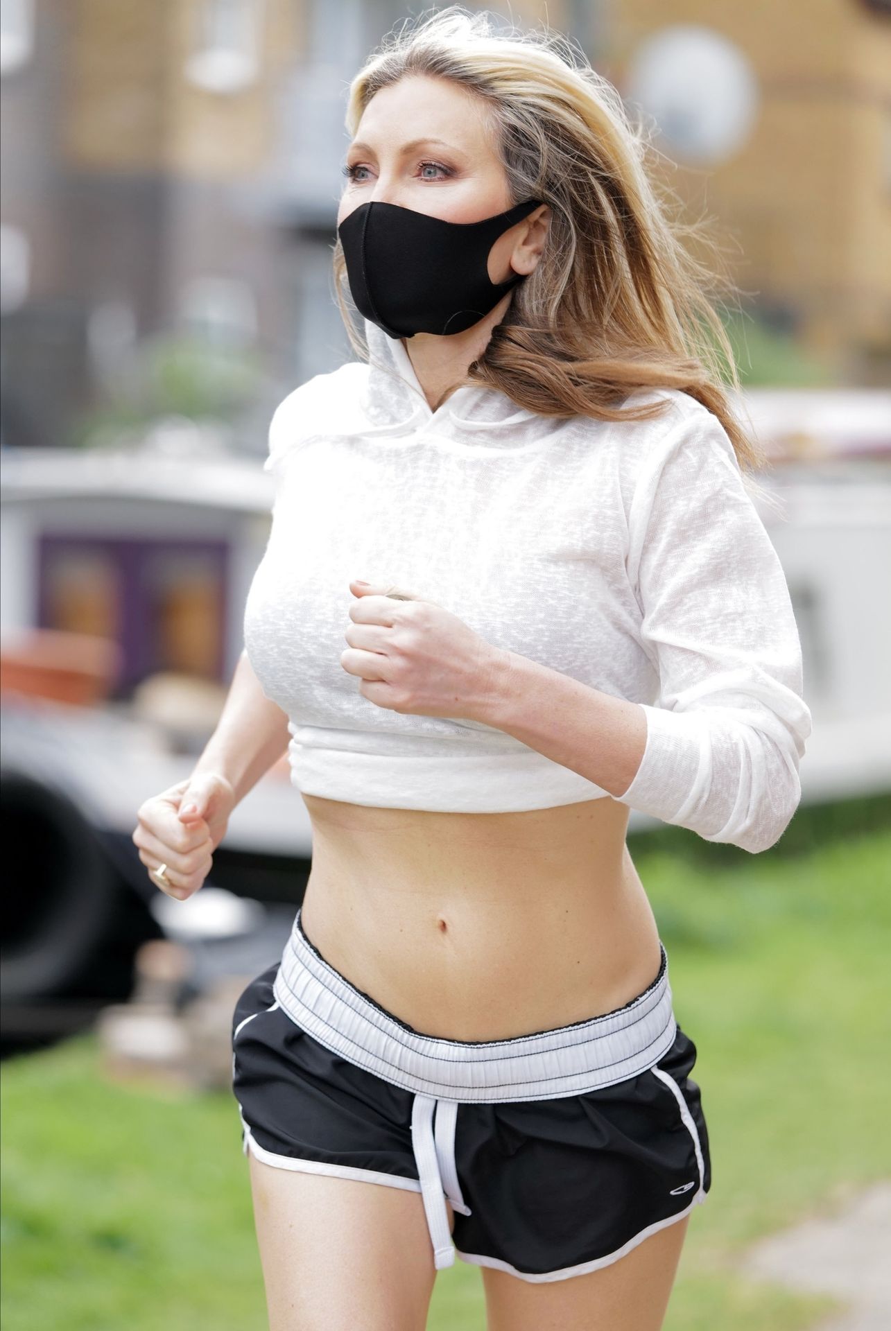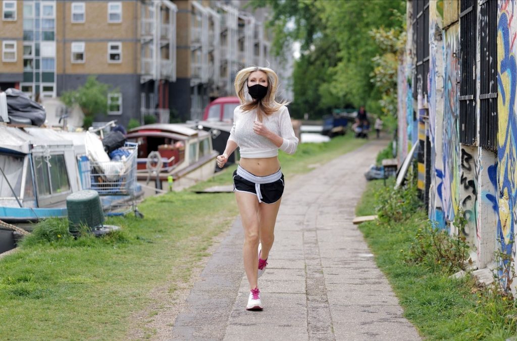 La modella americana Caprice, 48 anni, mostra i suoi addominali scolpiti e il fisico tonico mentre viene fotografata con una maschera protettiva mentre fa jogging da sola a Londra indossando un crop top e shorts sexy e cortissimi, 20/05/2020.