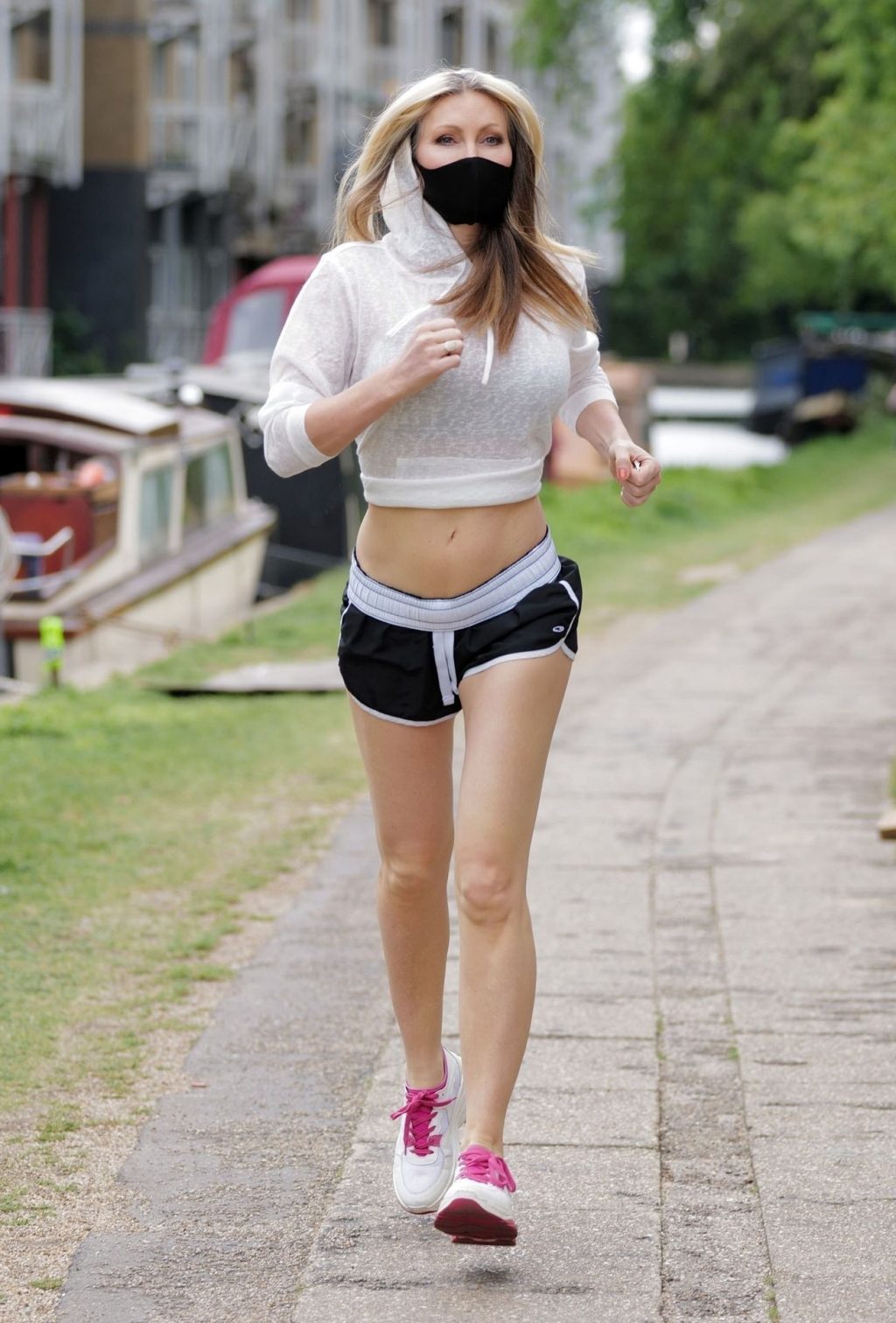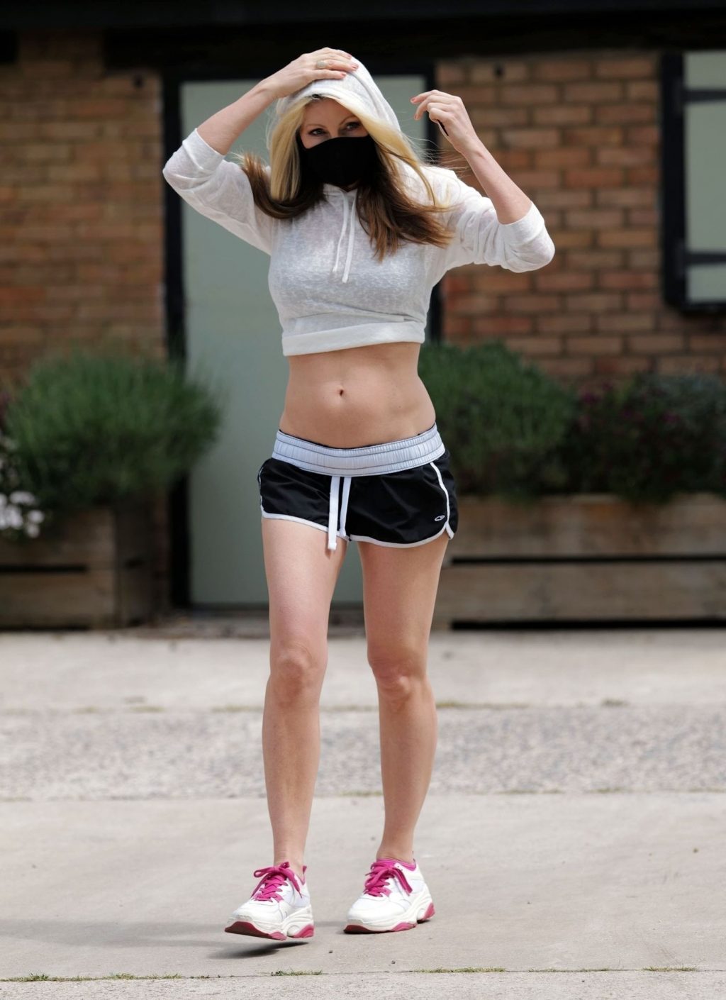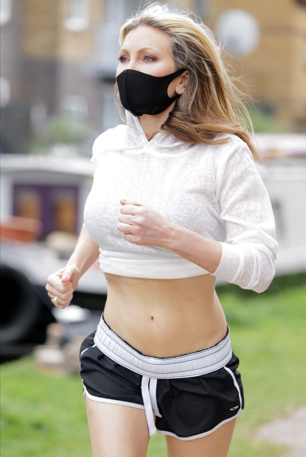 La modella americana Caprice, 48 anni, mostra i suoi addominali scolpiti e il fisico tonico mentre viene fotografata con una maschera protettiva mentre fa jogging da sola a Londra indossando un crop top e shorts sexy e cortissimi, 20/05/2020.