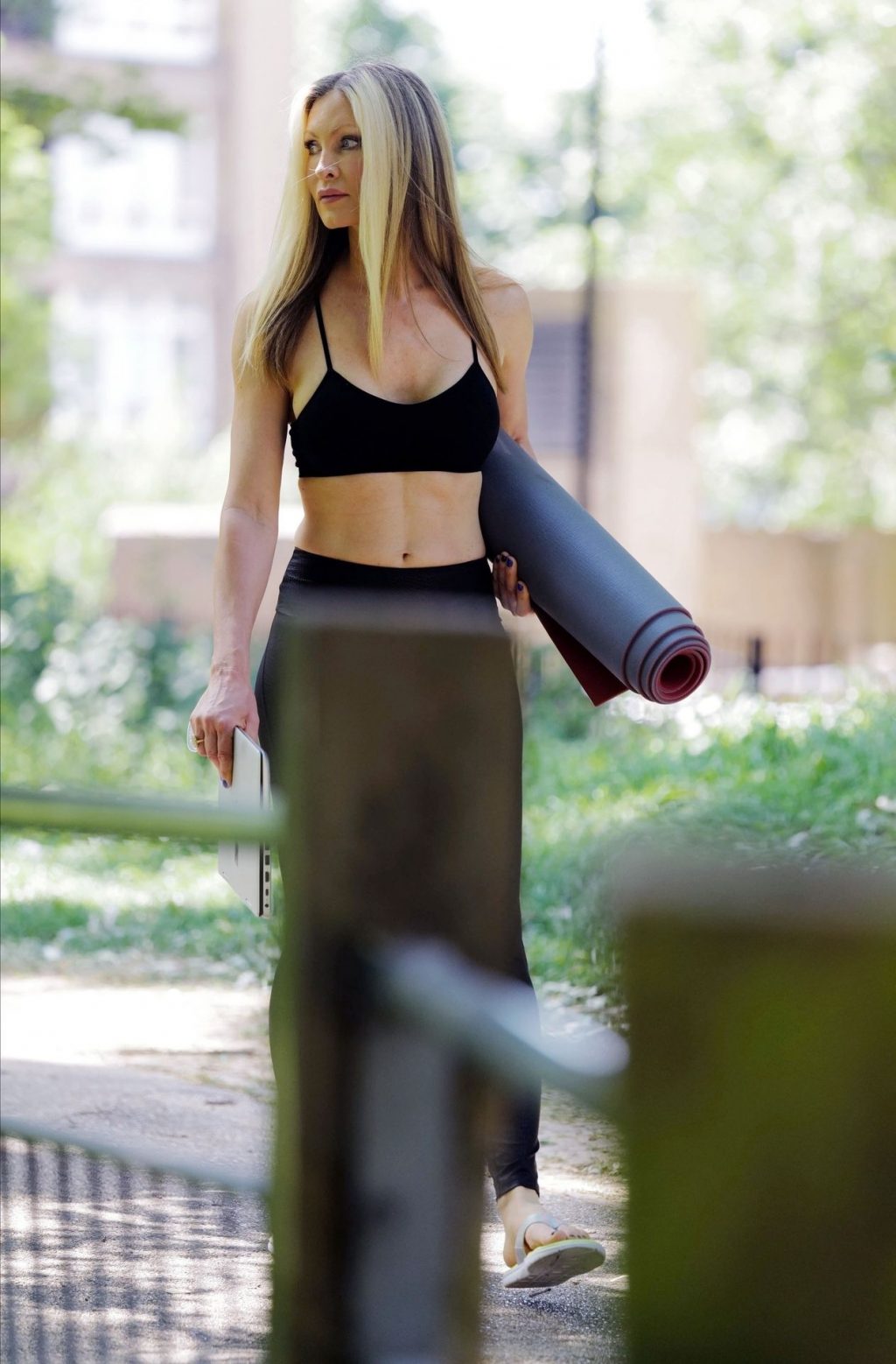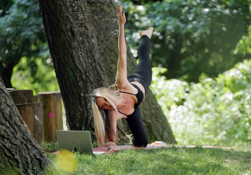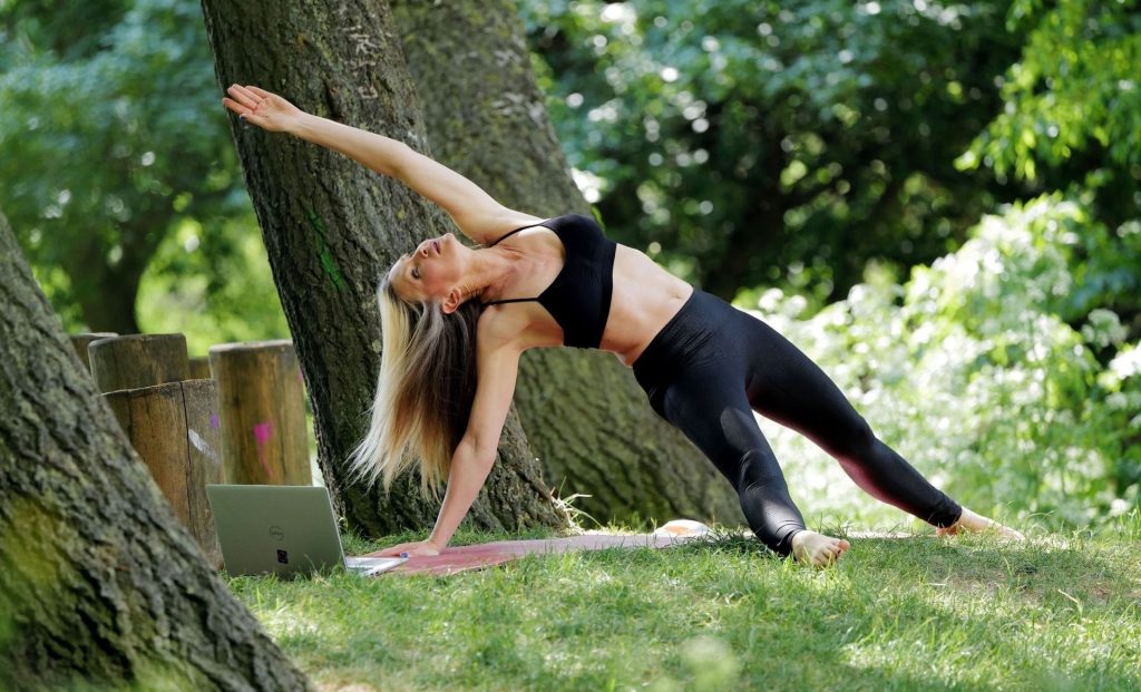 La modella americana Caprice è ritratta mentre trasmette in streaming le sue lezioni di yoga online da un parco indossando un top corto e leggings a Londra, 13/06/2020.