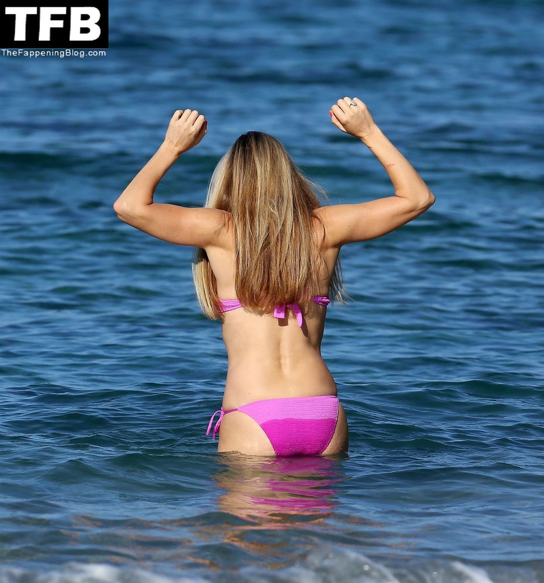 La modella americana di 50 anni Caprice appare splendida in un bikini viola mentre viene fotografata mentre mostra la sua incredibile figura mentre si gode il tempo sulla spiaggia a Ibiza, 27/10/2021.