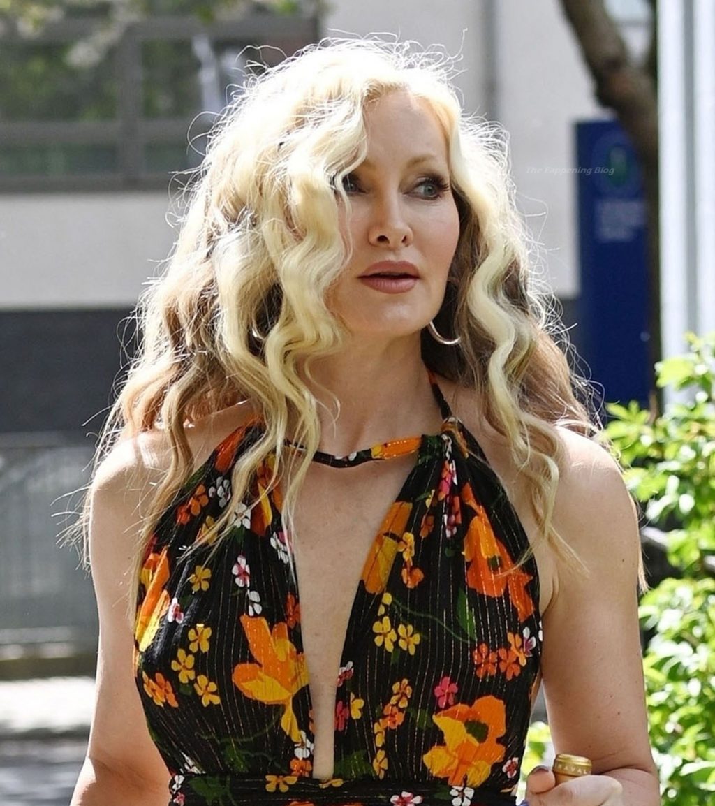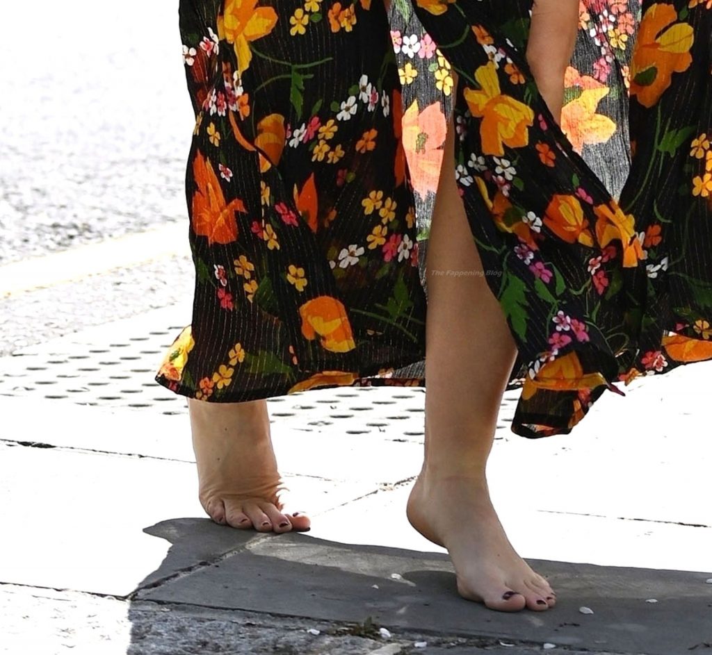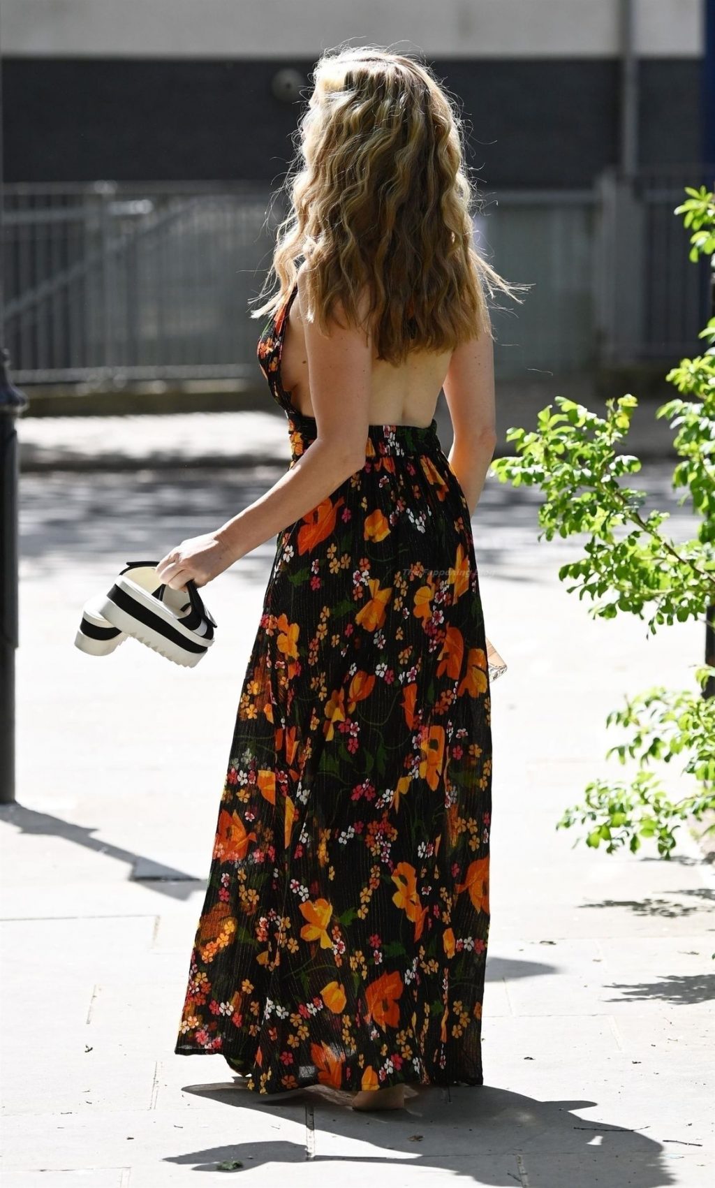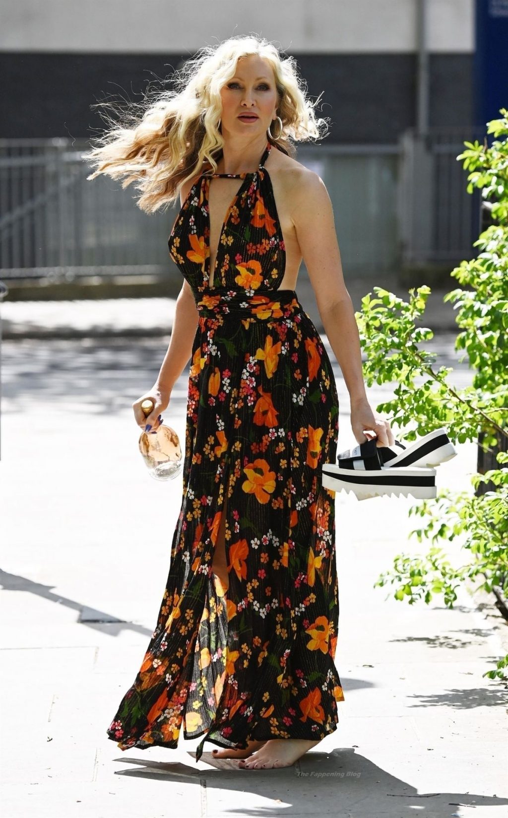 La modella americana Caprice esce con un abito floreale con spacco alto fino alla coscia a piedi nudi per le strade di Londra, portando una bottiglia di vino mentre si dirige a casa di un’amica per pranzo, 06/05/2021.