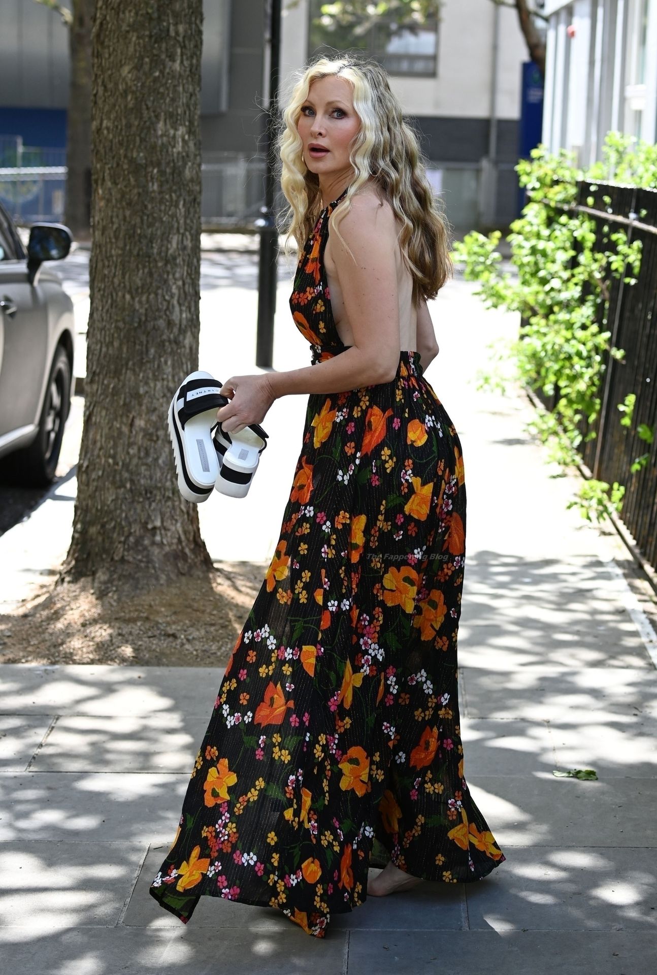 La modella americana Caprice esce con un abito floreale con spacco alto fino alla coscia a piedi nudi per le strade di Londra, portando una bottiglia di vino mentre si dirige a casa di un’amica per pranzo, 06/05/2021.