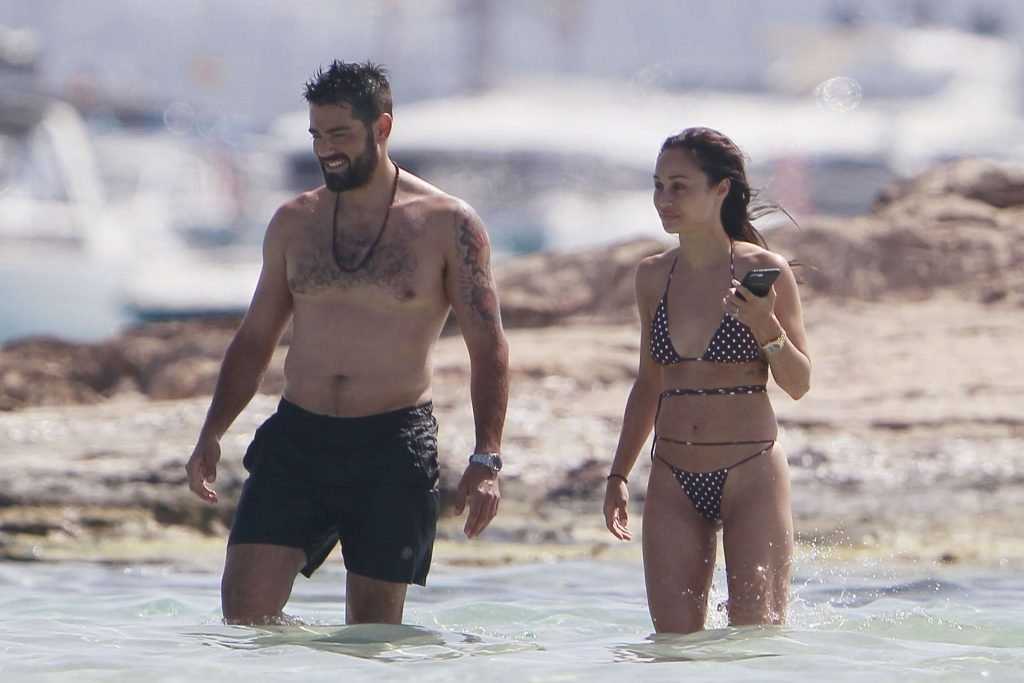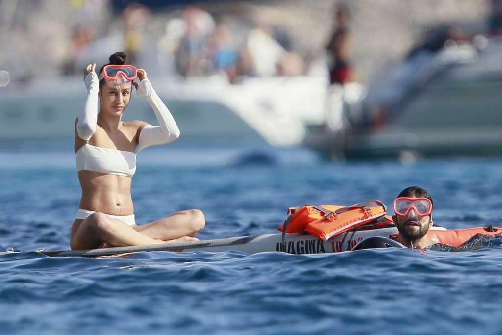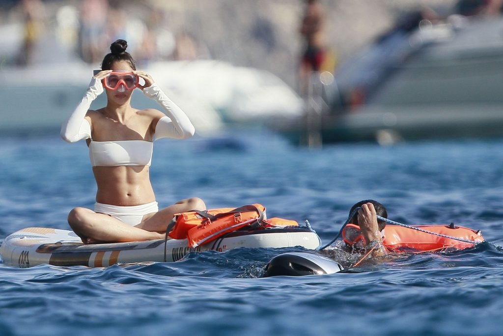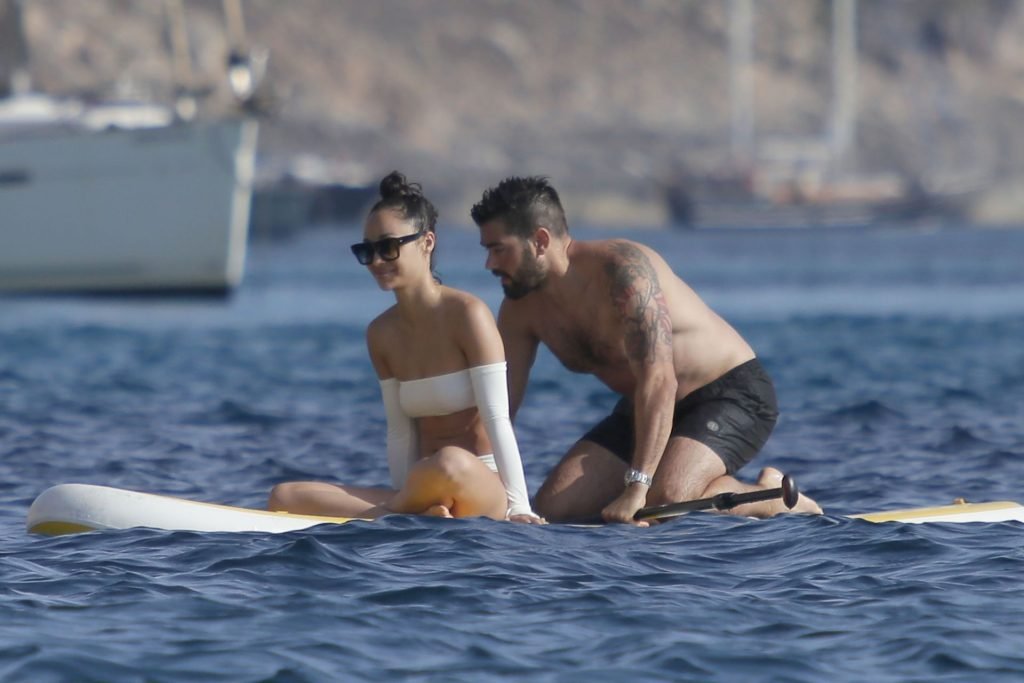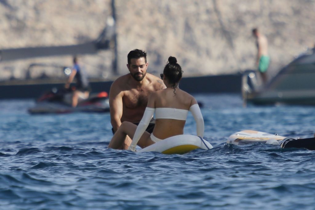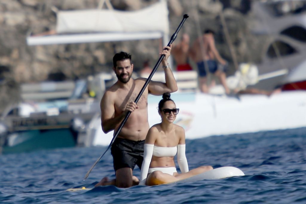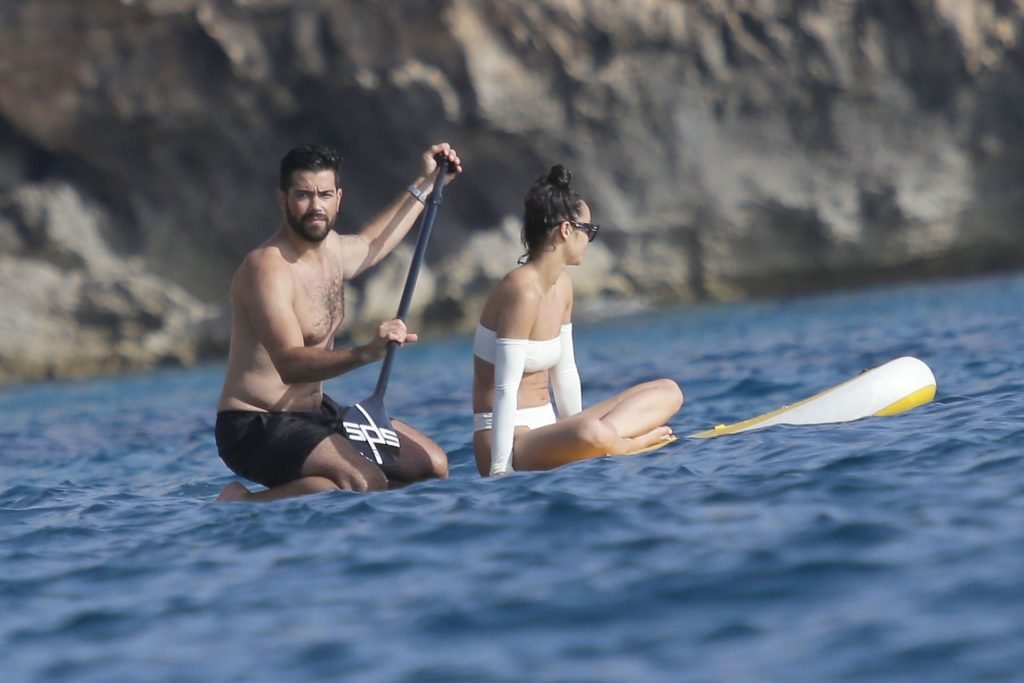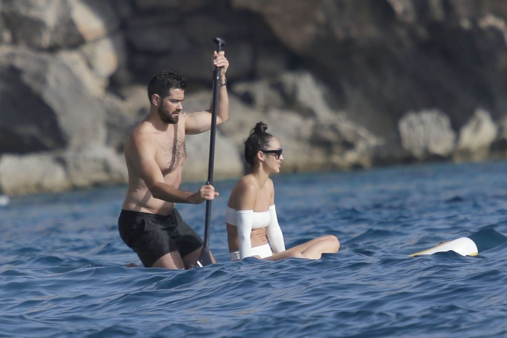 L’attrice cinematografica Cara Santana e Jesse Metcalfe vanno a fare paddle-boarding insieme alla fine di una lunga e rilassante giornata in spiaggia a Formentera, Spagna, 21/07/2019.