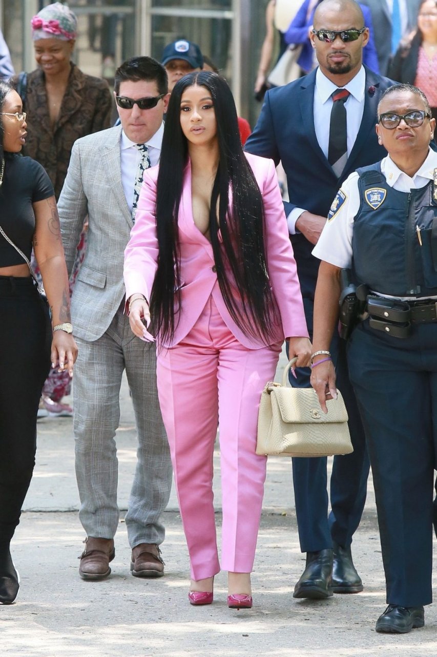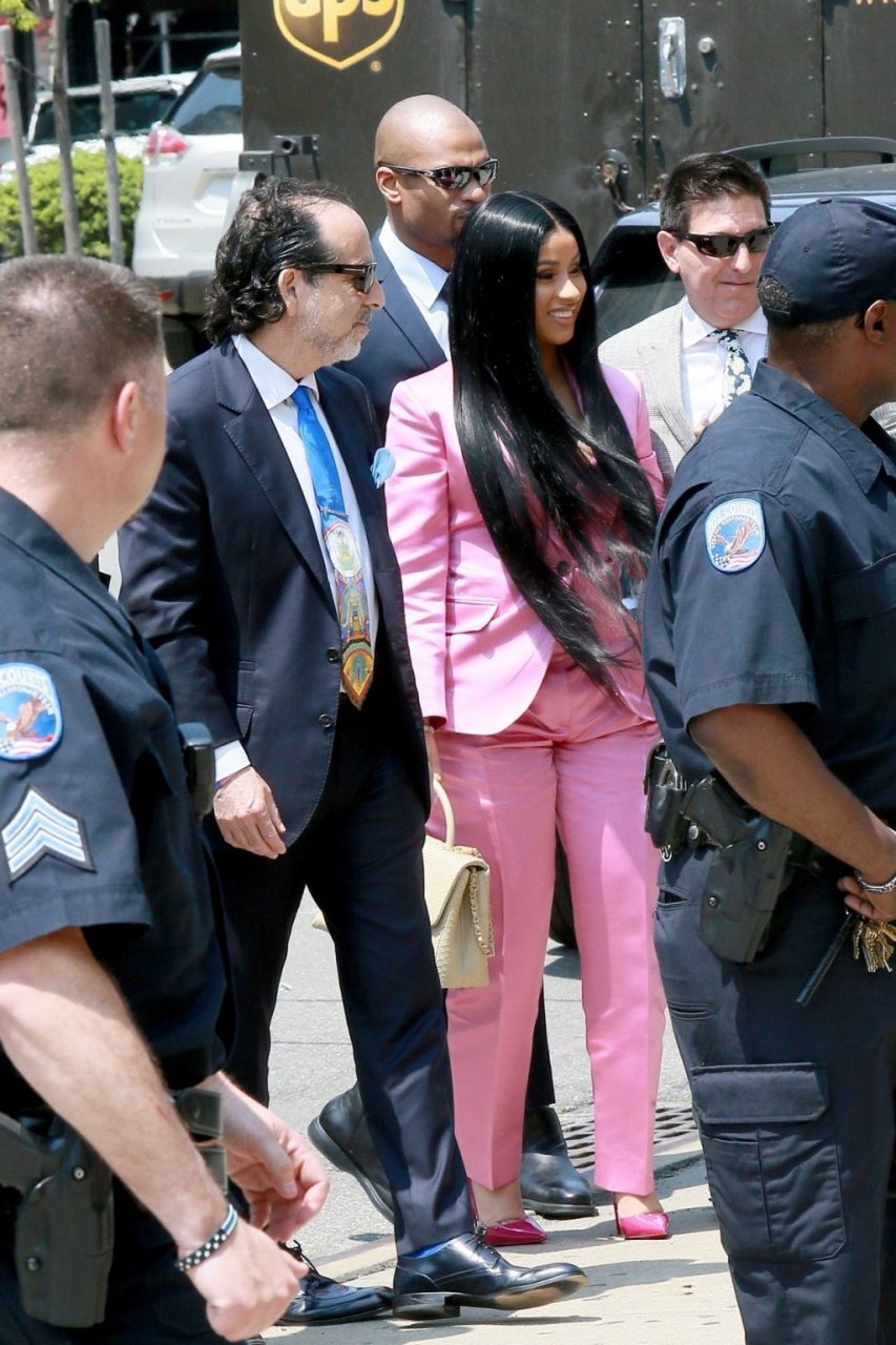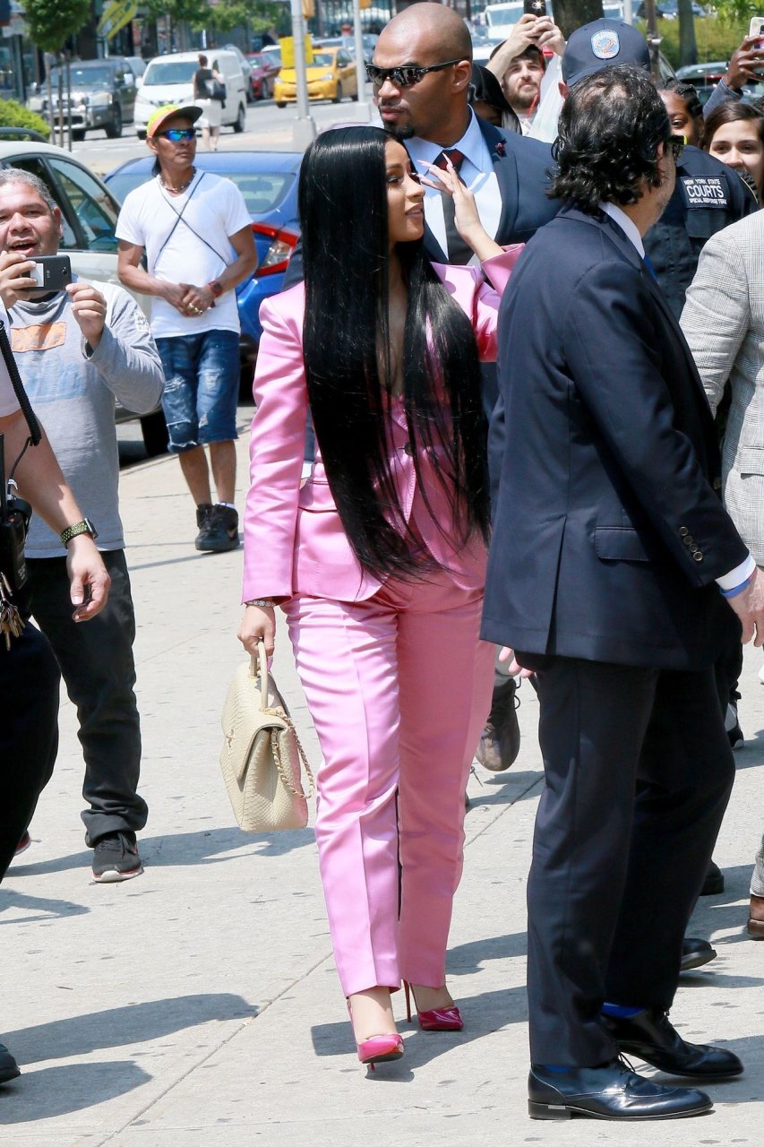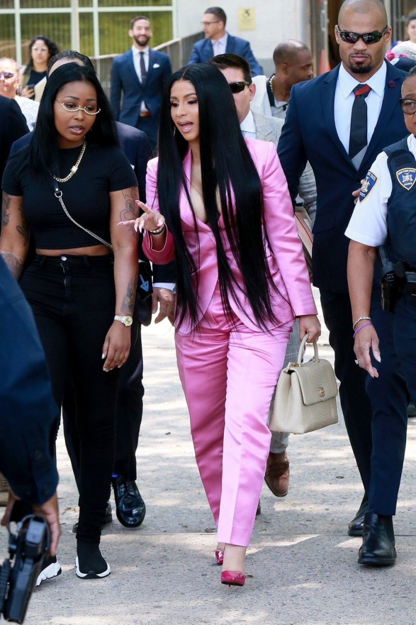 La rapper Cardi B è stata vista oggi al Tribunale Penale di Queens per un’udienza indossando un completo da lavoro rosa con il décolleté che usciva dal top.