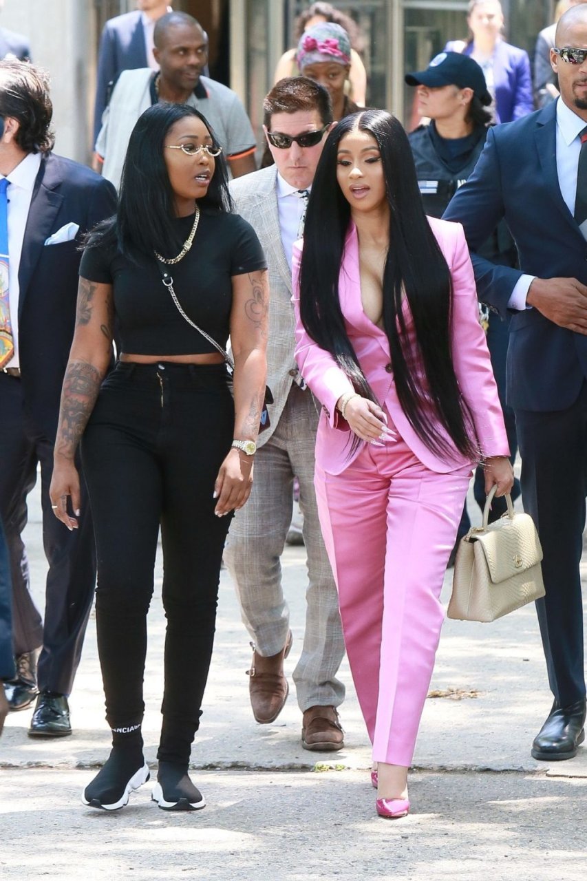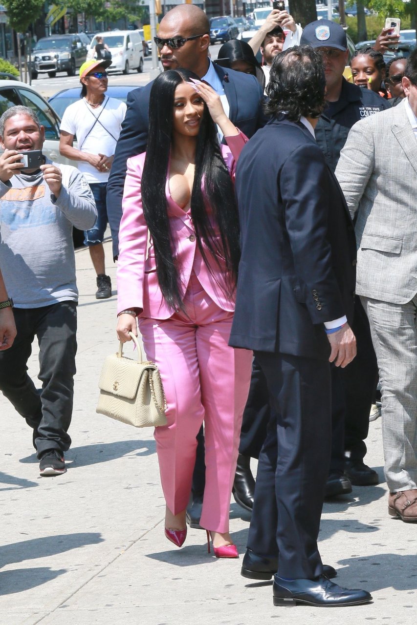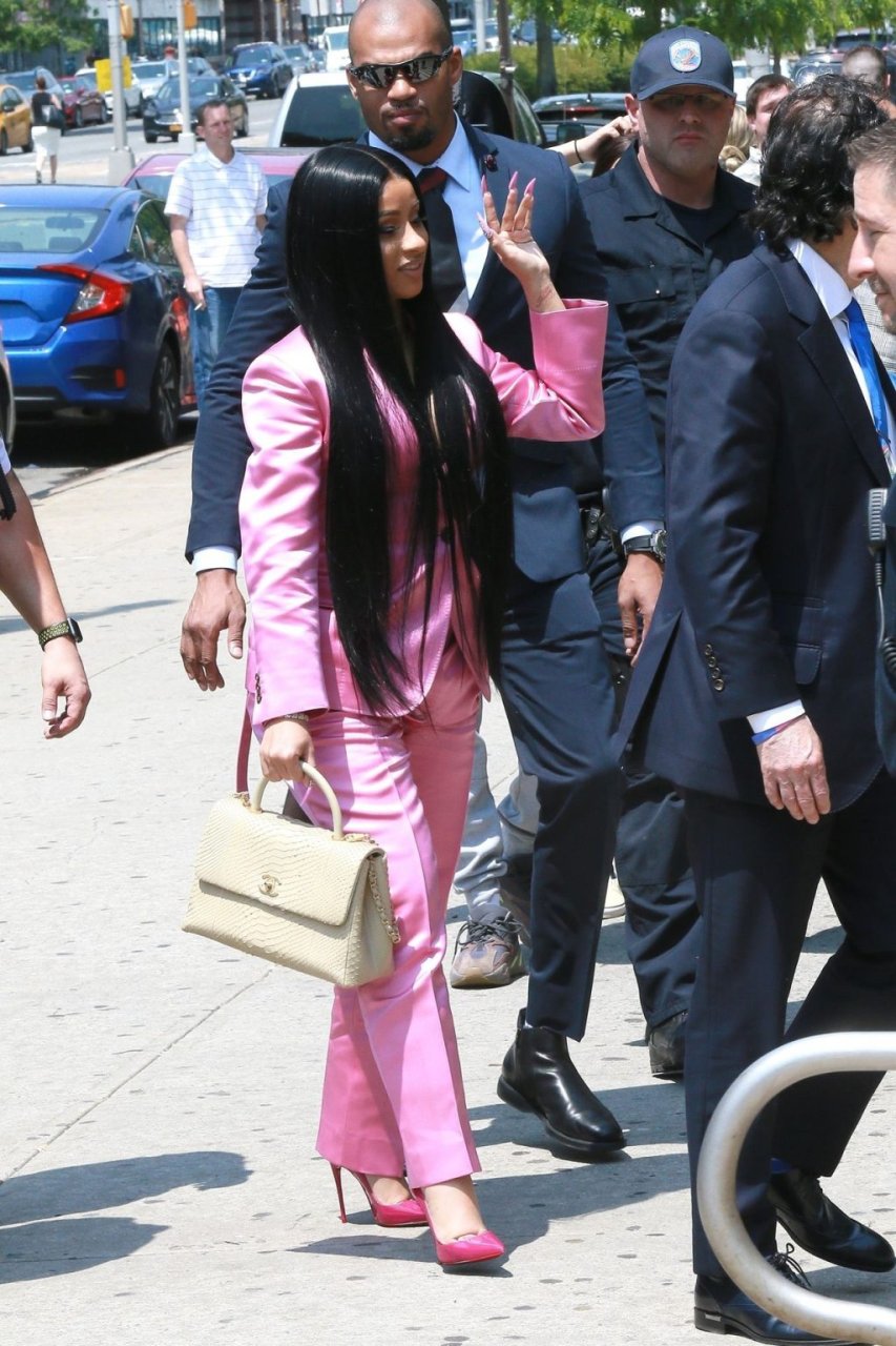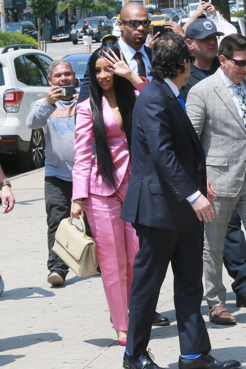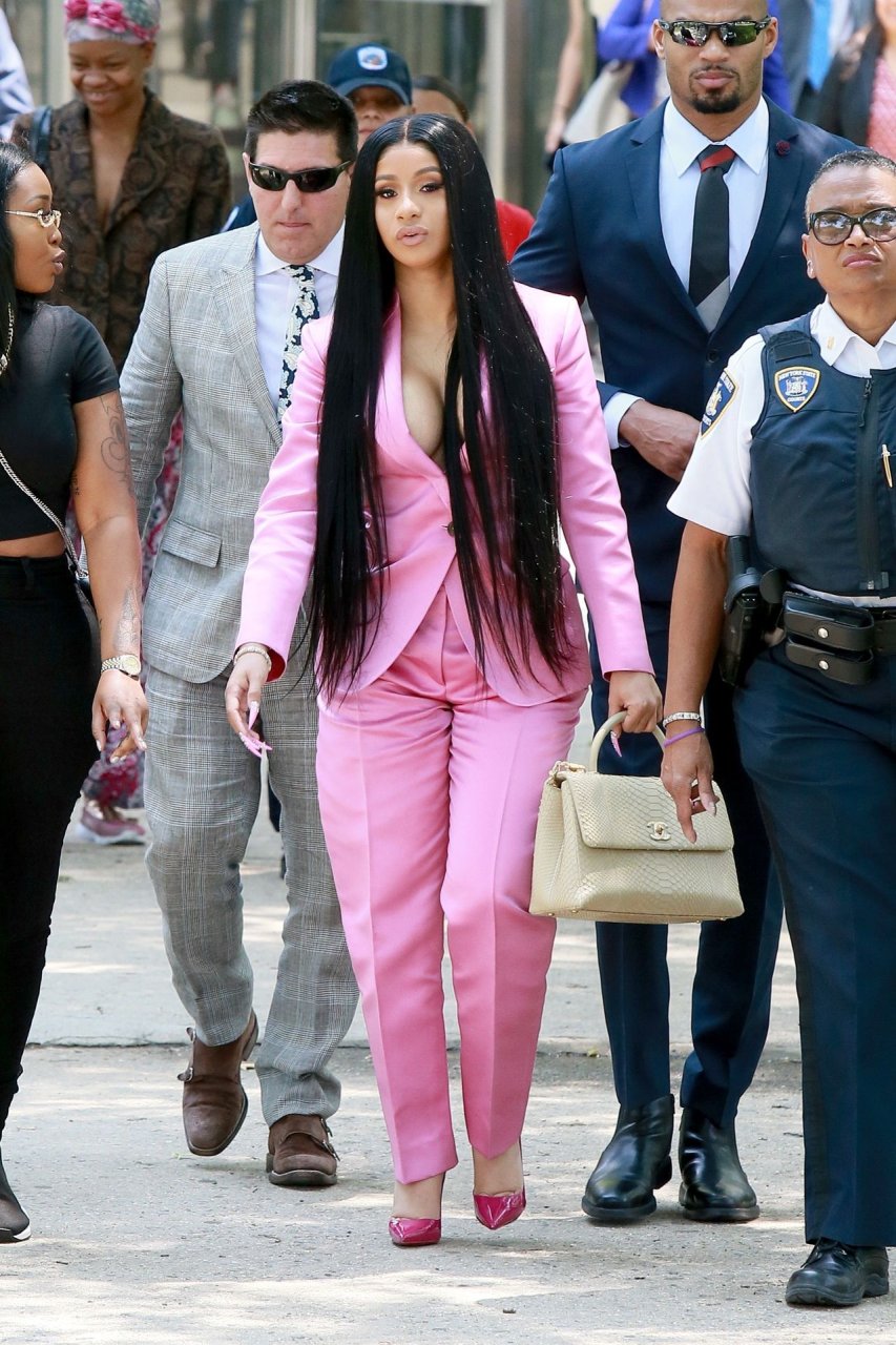 La rapper Cardi B è stata vista oggi al Tribunale Penale di Queens per un’udienza indossando un completo da lavoro rosa con il décolleté che usciva dal top.