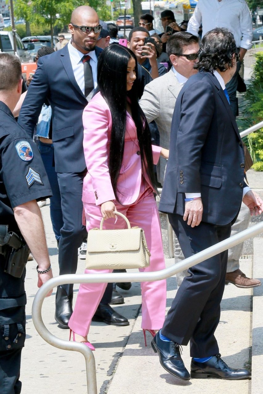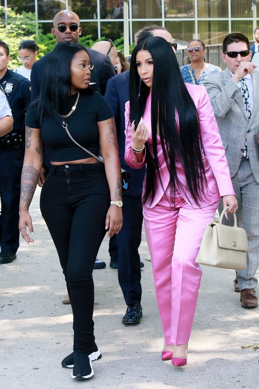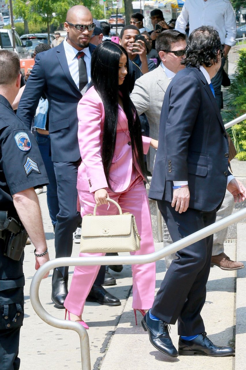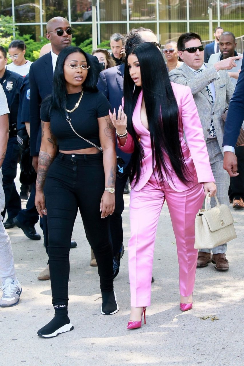 La rapper Cardi B è stata vista oggi al Tribunale Penale di Queens per un’udienza indossando un completo da lavoro rosa con il décolleté che usciva dal top.
