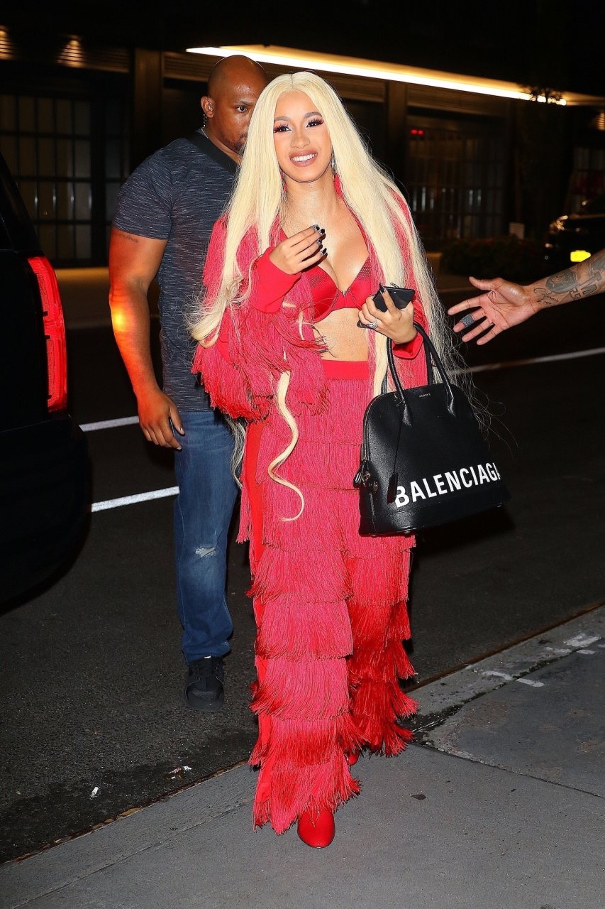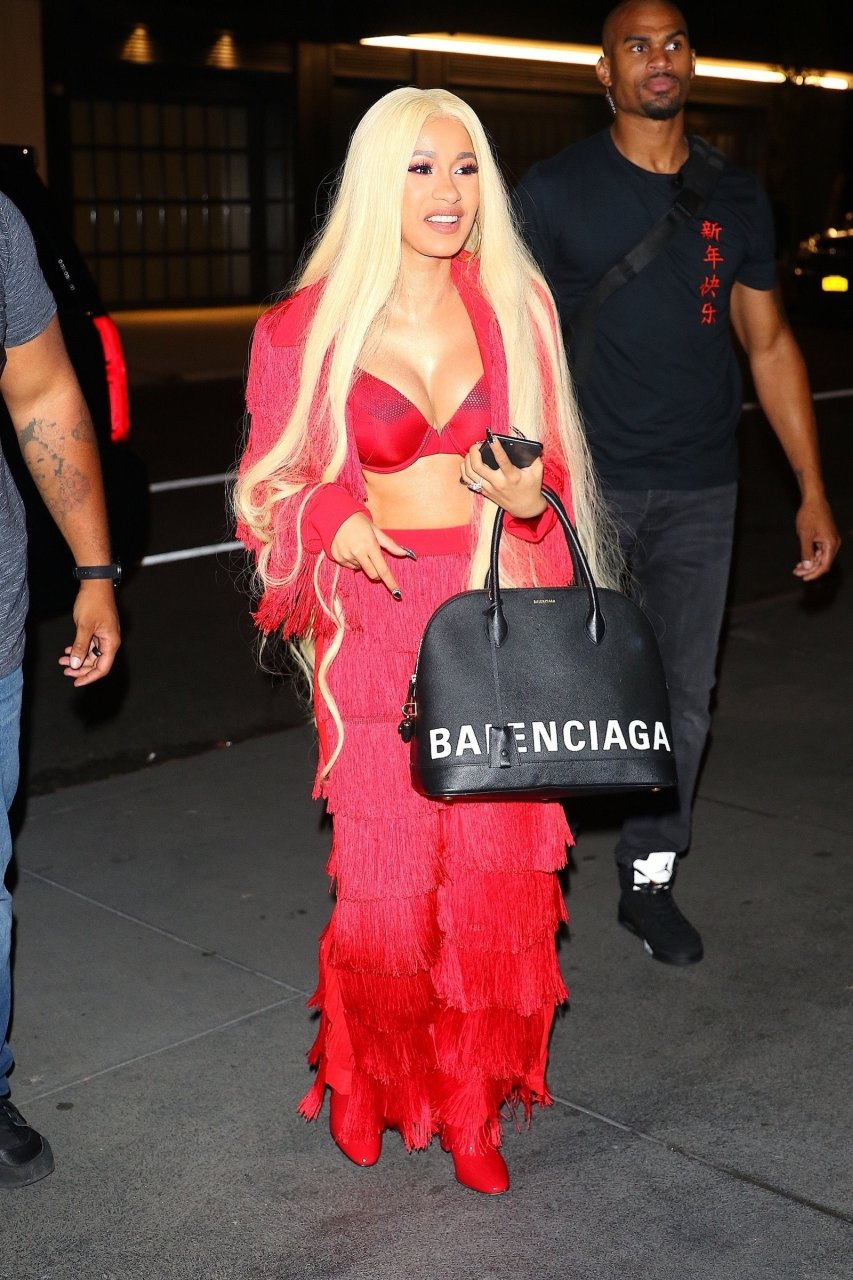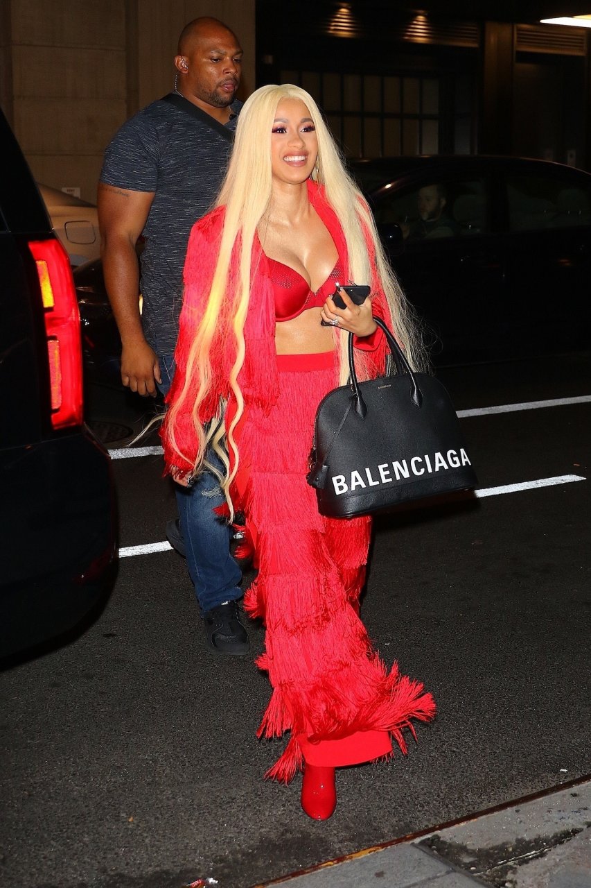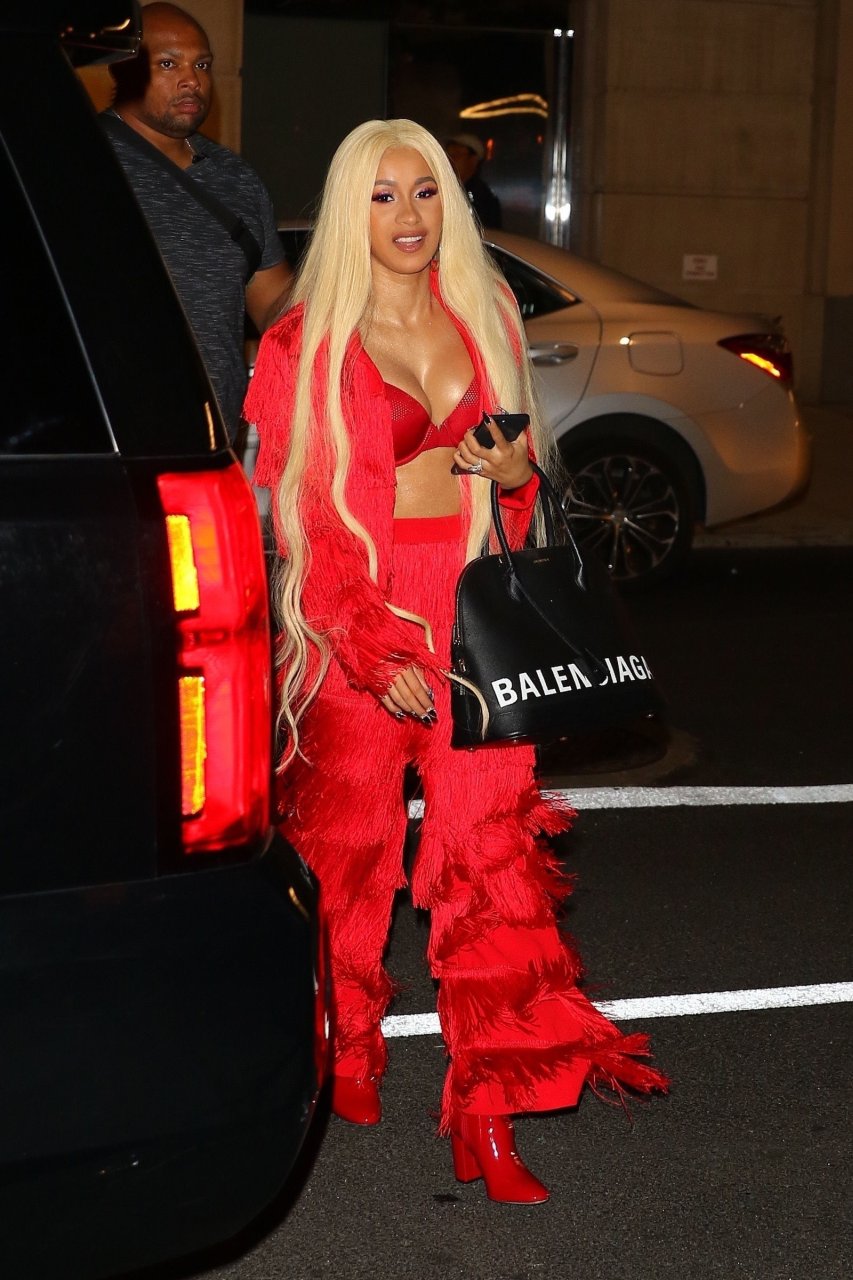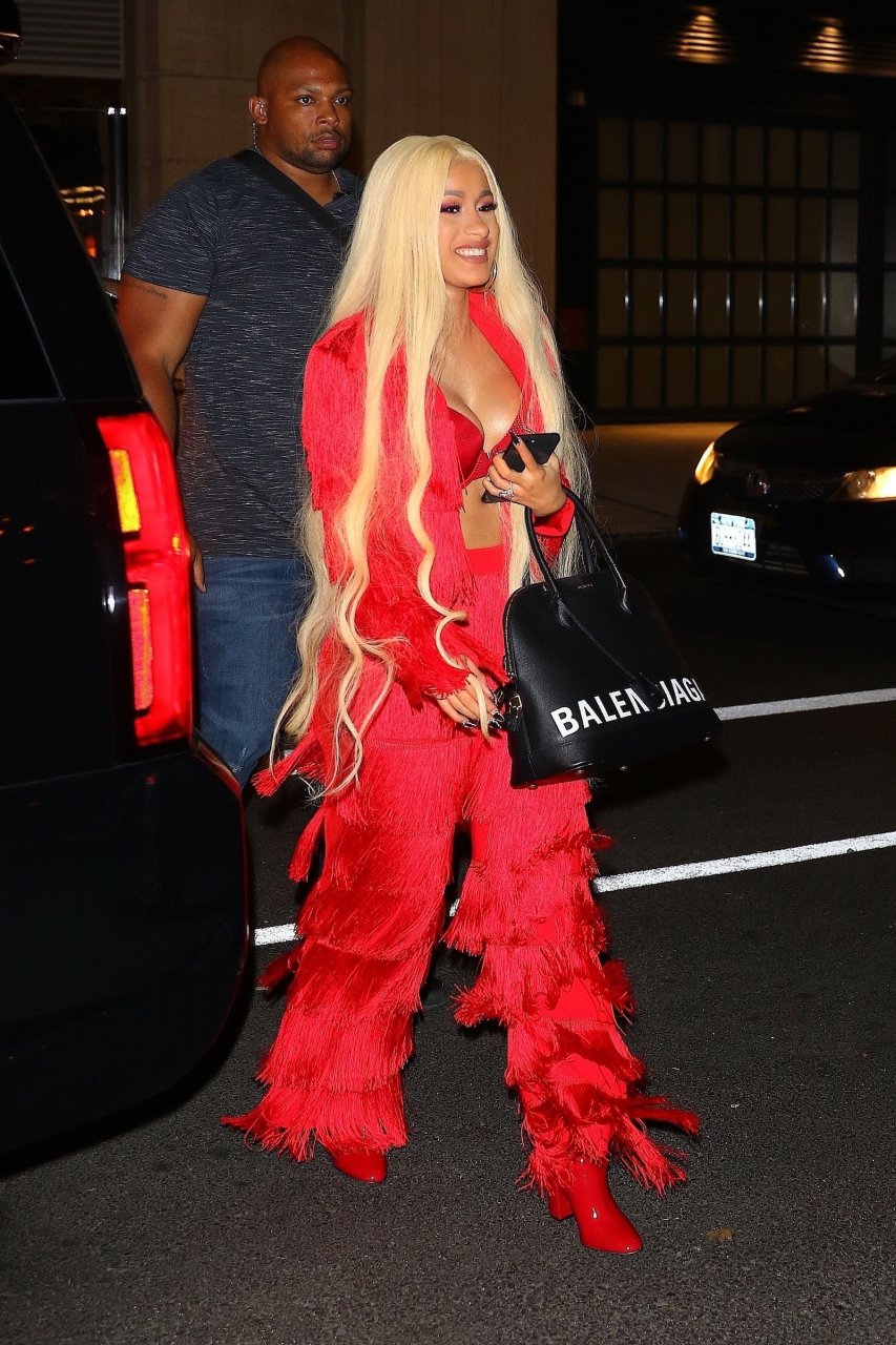 Cardi B (25) è stata vista dopo la sua esibizione al Global Citizens Festival a New York, 29/09/2018. Cardi si distingue con un outfit rosso acceso e lunghi capelli biondi mentre mostra una borsa Balenciaga.