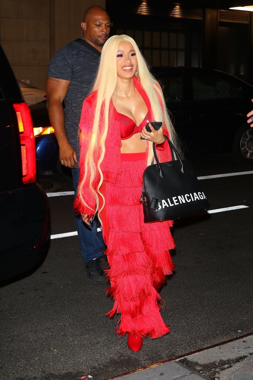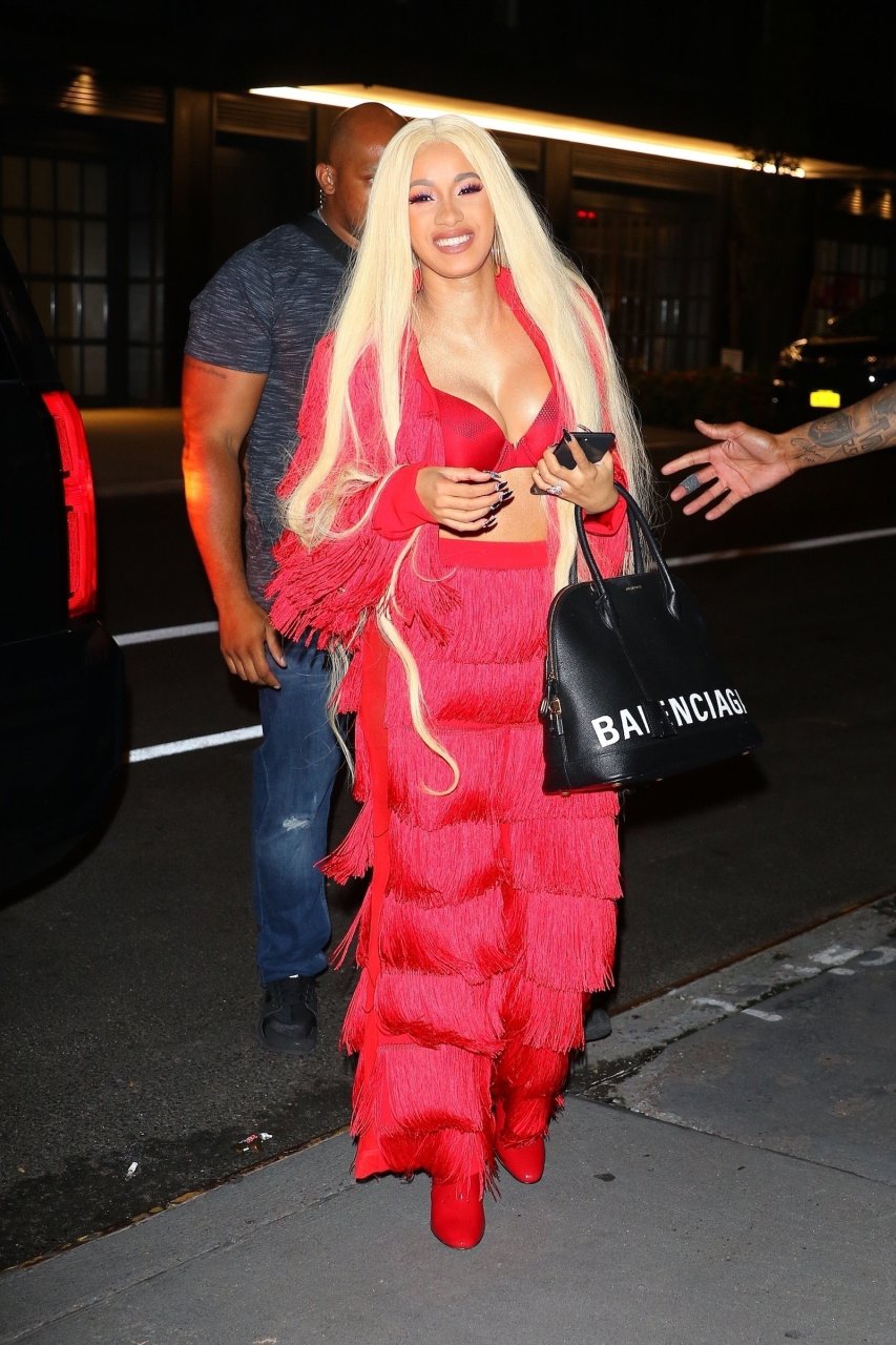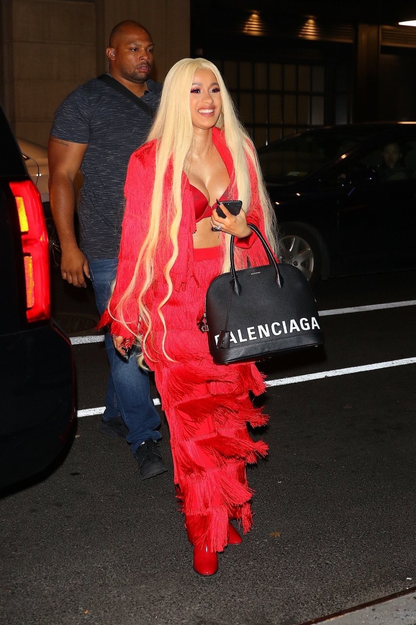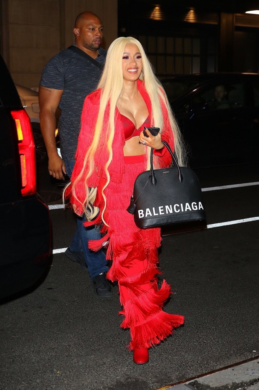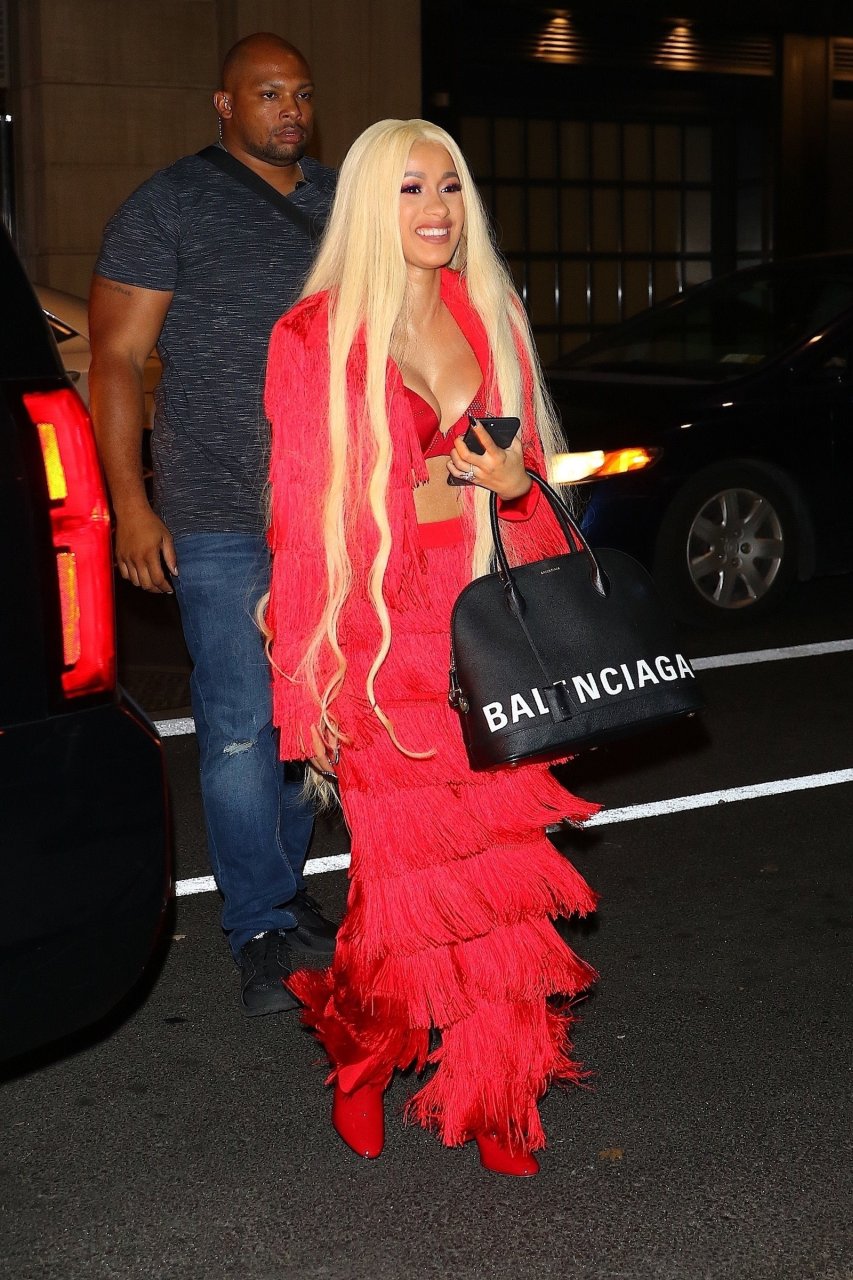 Cardi B (25) è stata vista dopo la sua esibizione al Global Citizens Festival a New York, 29/09/2018. Cardi si distingue con un outfit rosso acceso e lunghi capelli biondi mentre mostra una borsa Balenciaga.