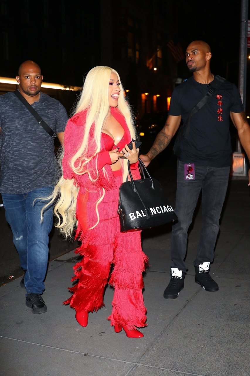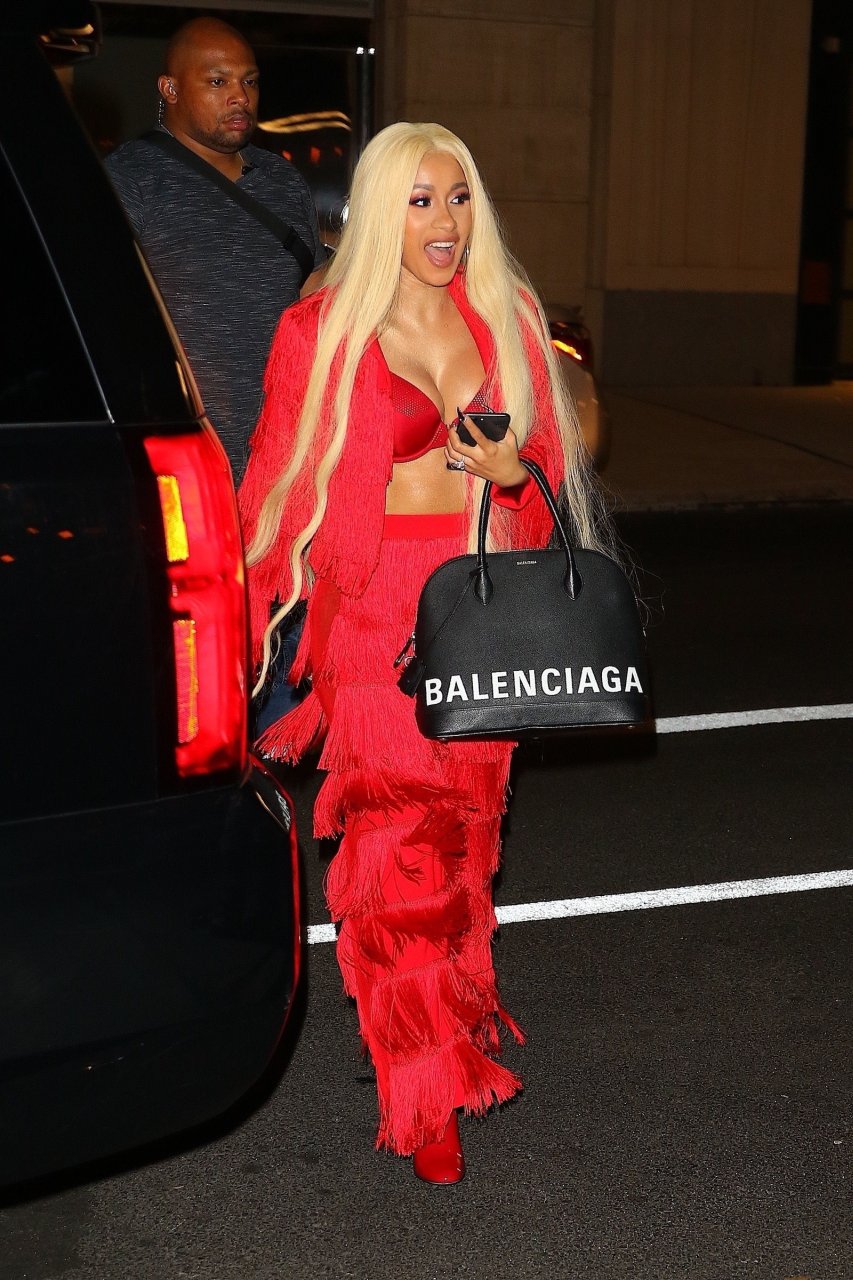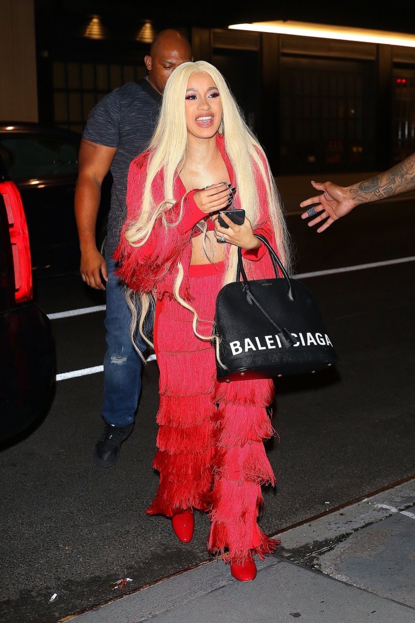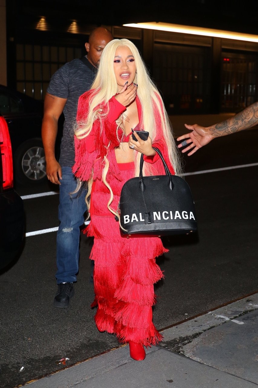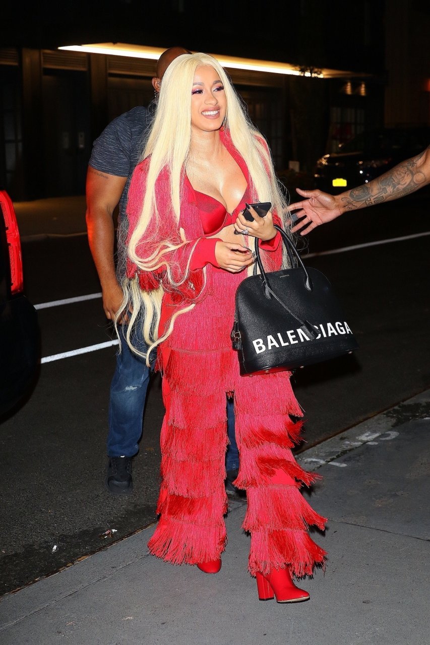 Cardi B (25) è stata vista dopo la sua esibizione al Global Citizens Festival a New York, 29/09/2018. Cardi si distingue con un outfit rosso acceso e lunghi capelli biondi mentre mostra una borsa Balenciaga.