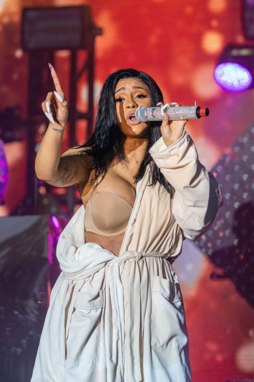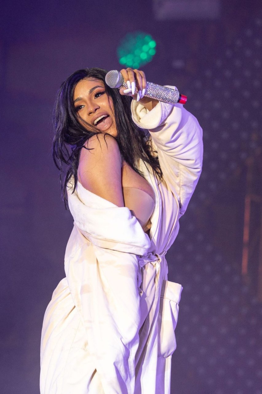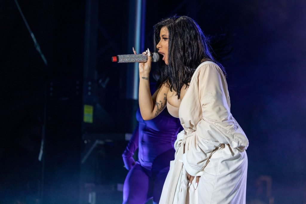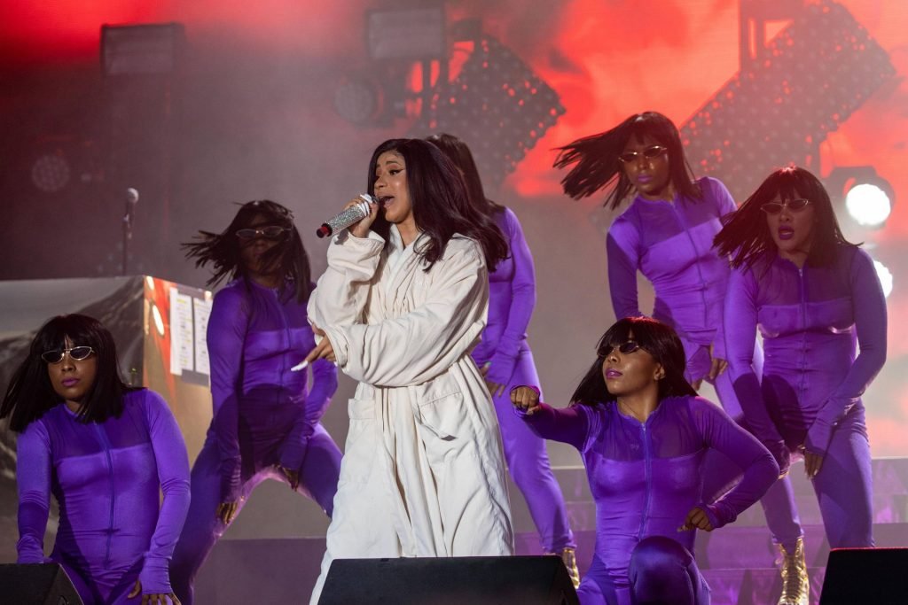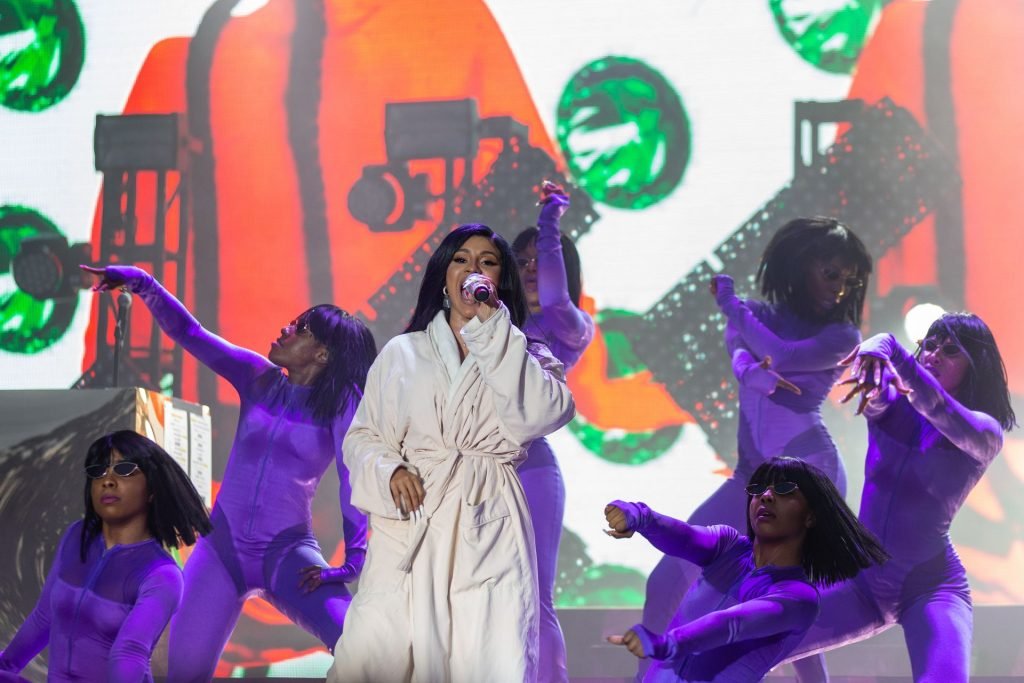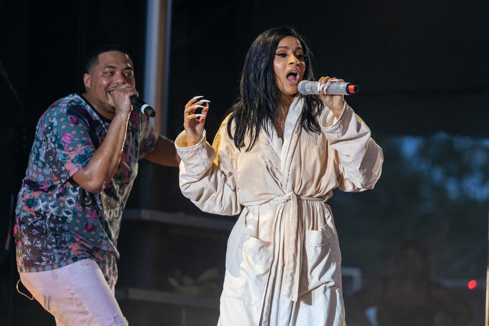 Singer Cardi B (Belcalis Almanzar) si cambia in un accappatoio per completare la sua esibizione durante il Bonnaroo Music + Arts Festival a Manchester, Tennessee, 16/06/2019.
