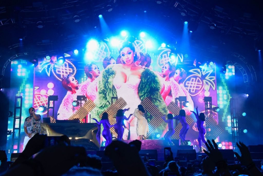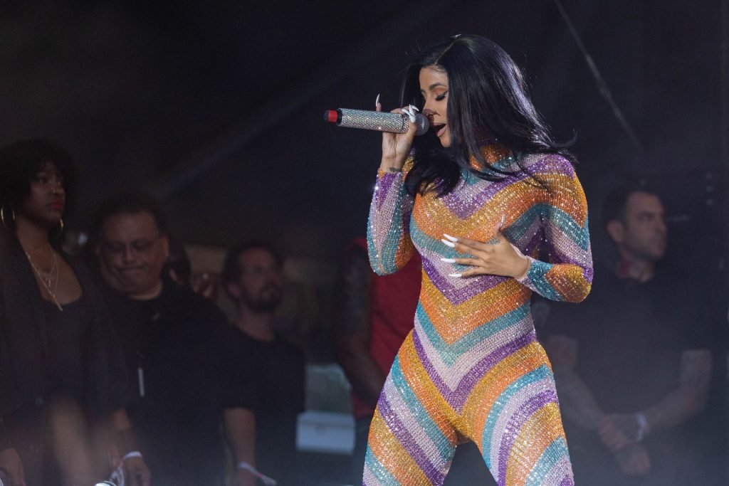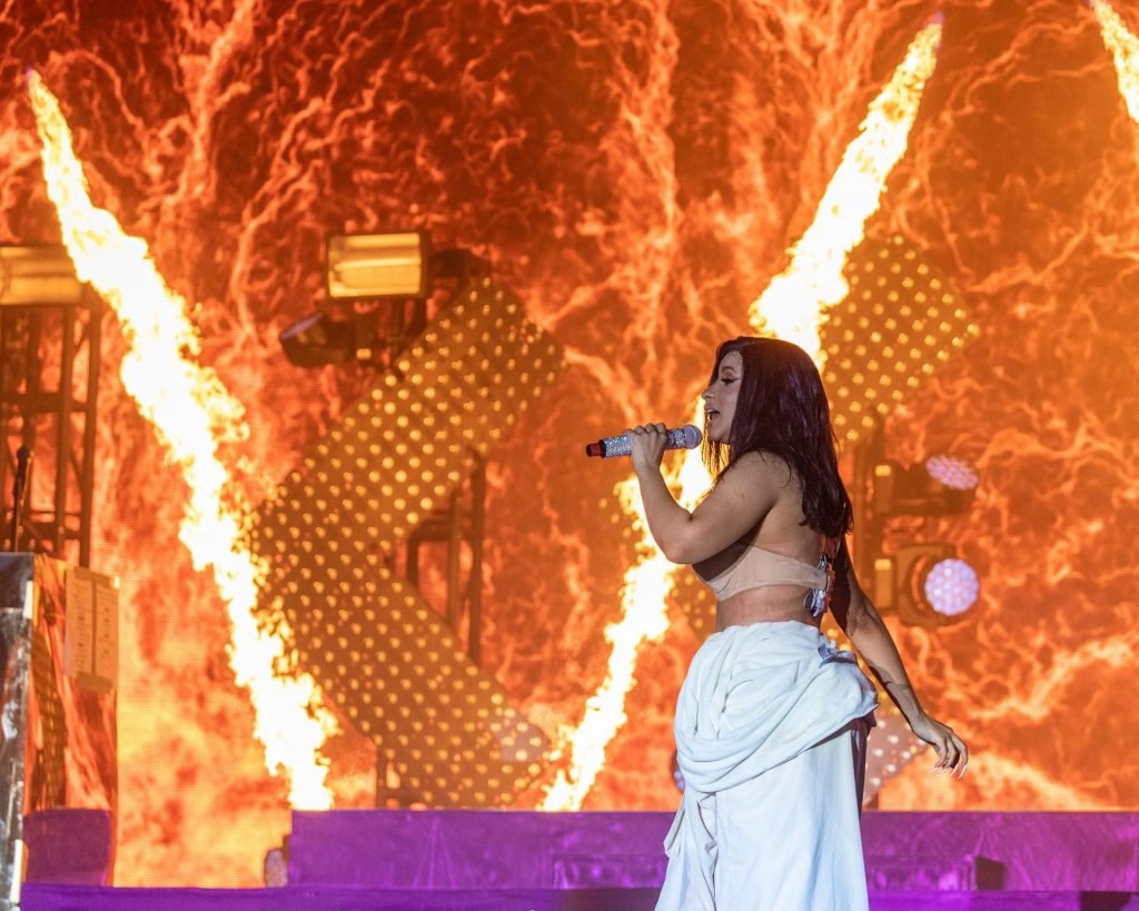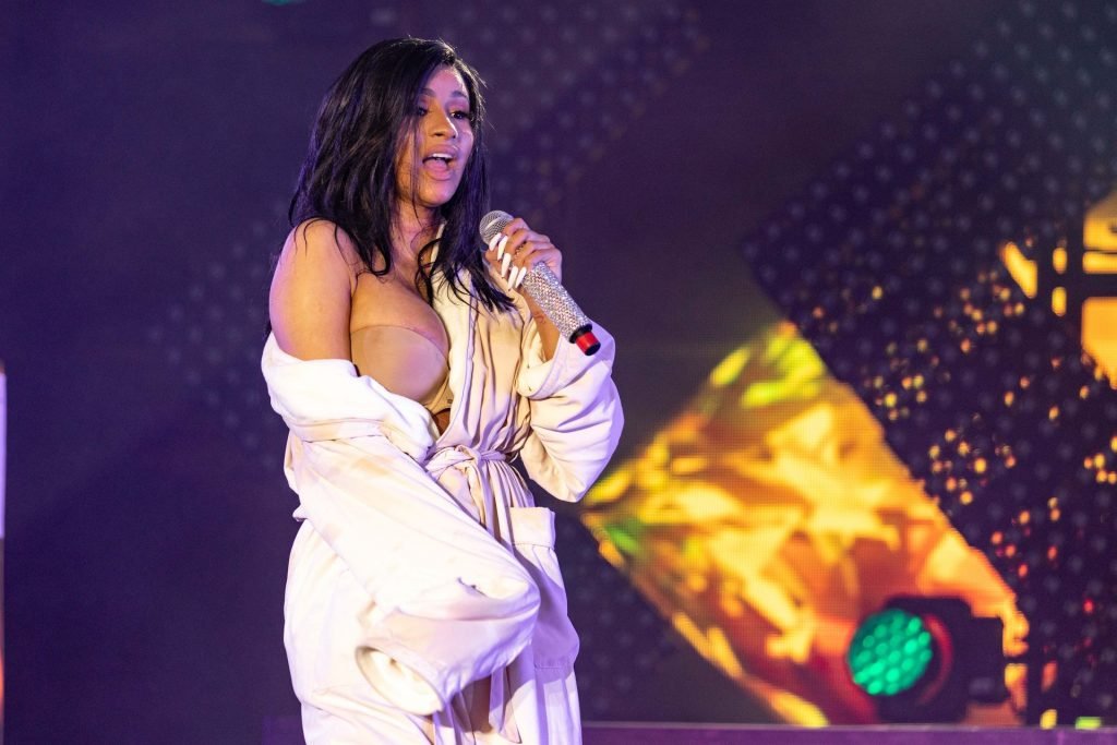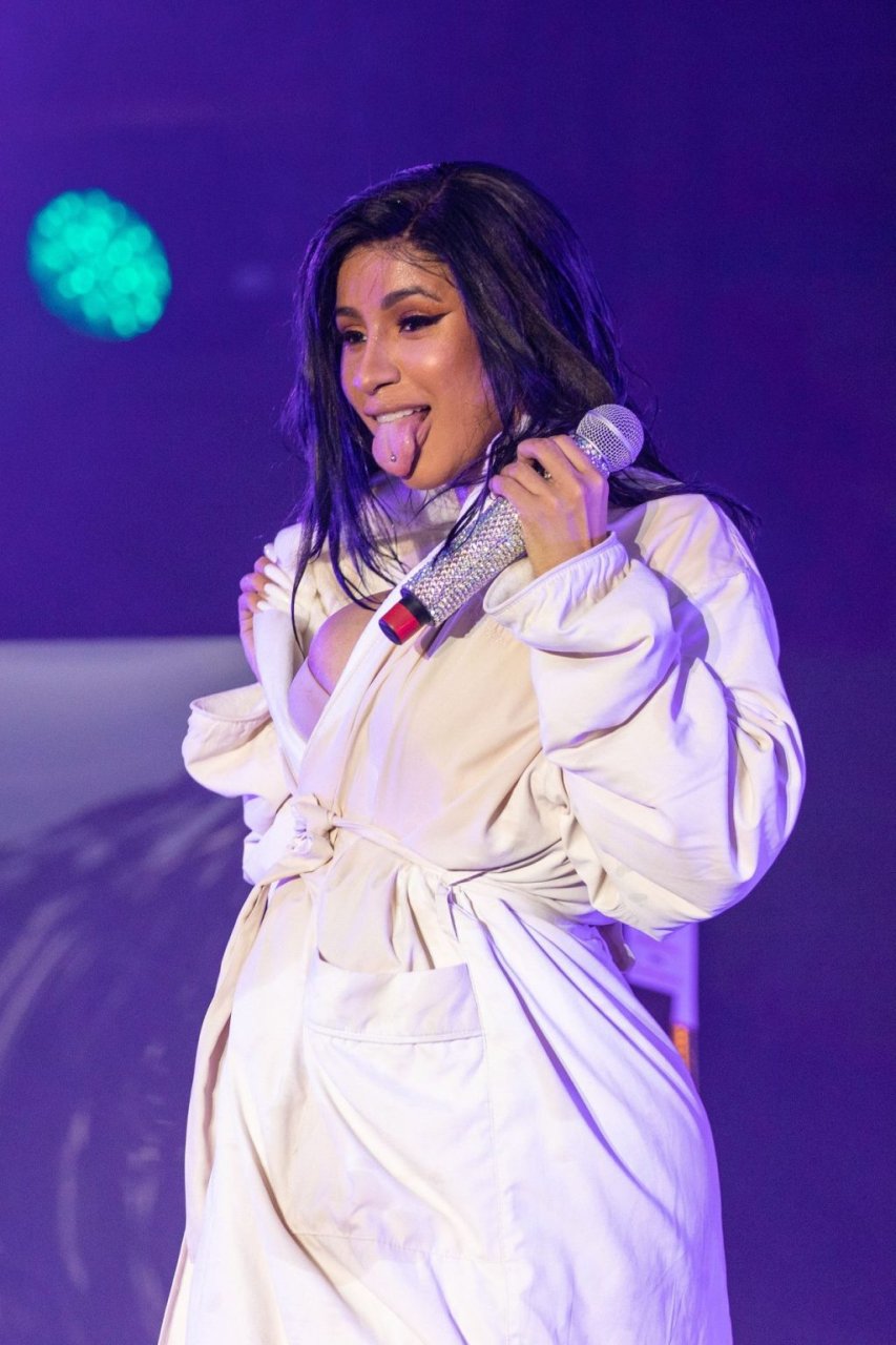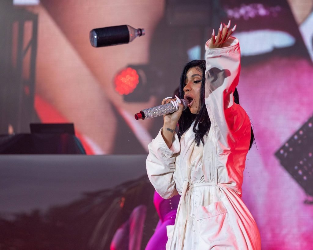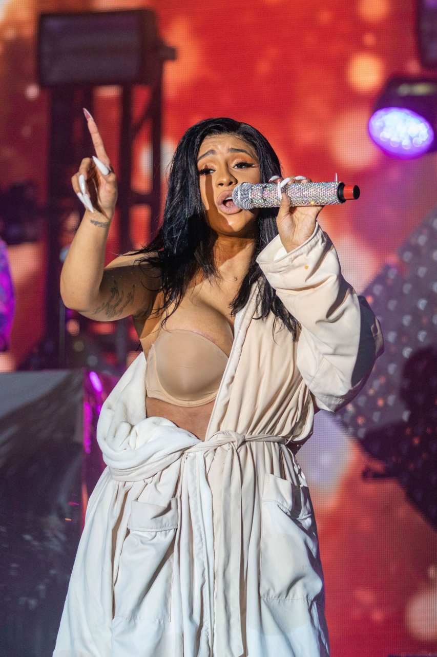 Singer Cardi B (Belcalis Almanzar) si cambia in un accappatoio per completare la sua esibizione durante il Bonnaroo Music + Arts Festival a Manchester, Tennessee, 16/06/2019.