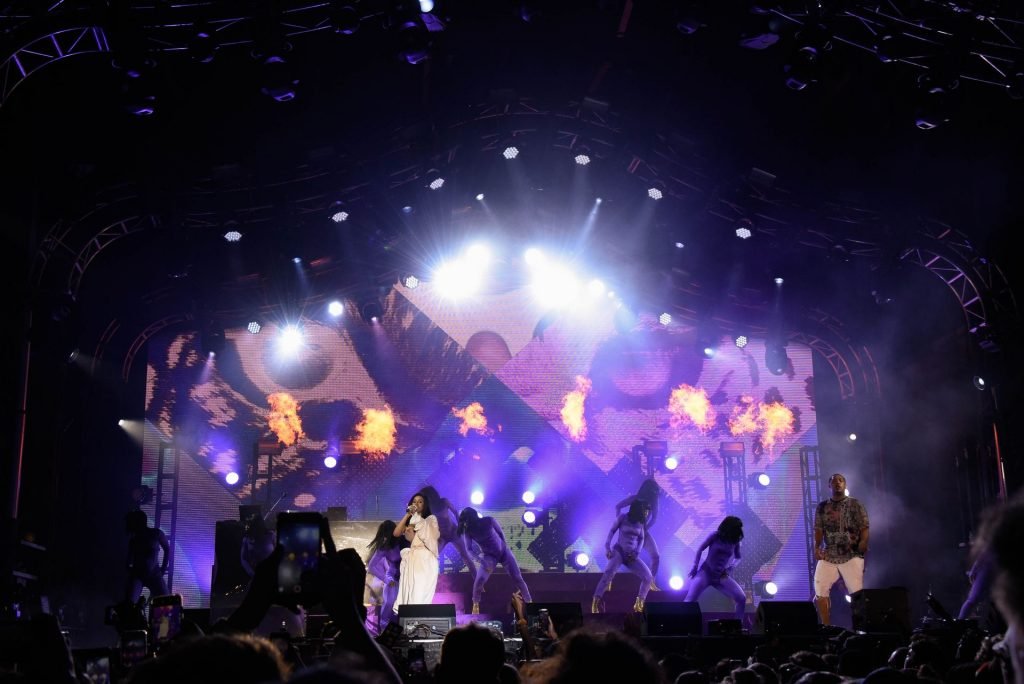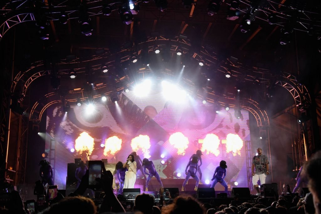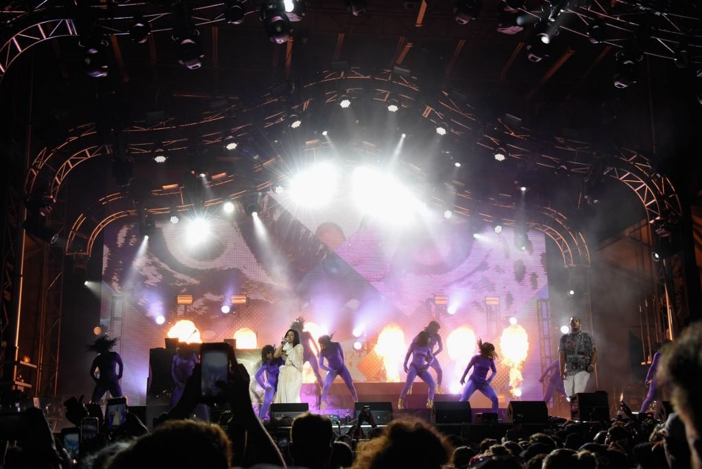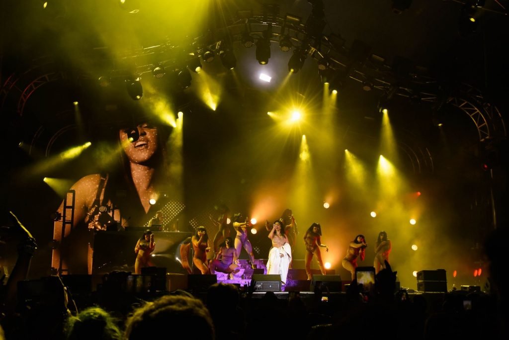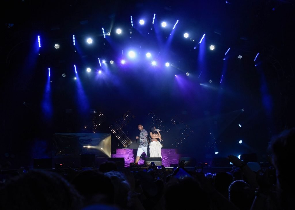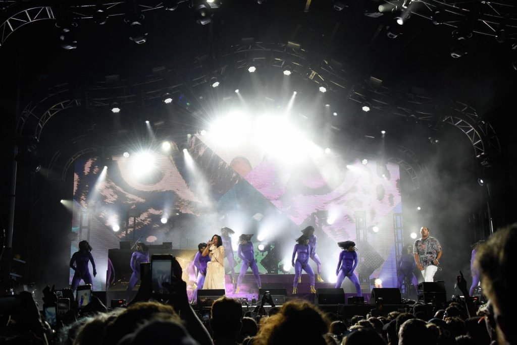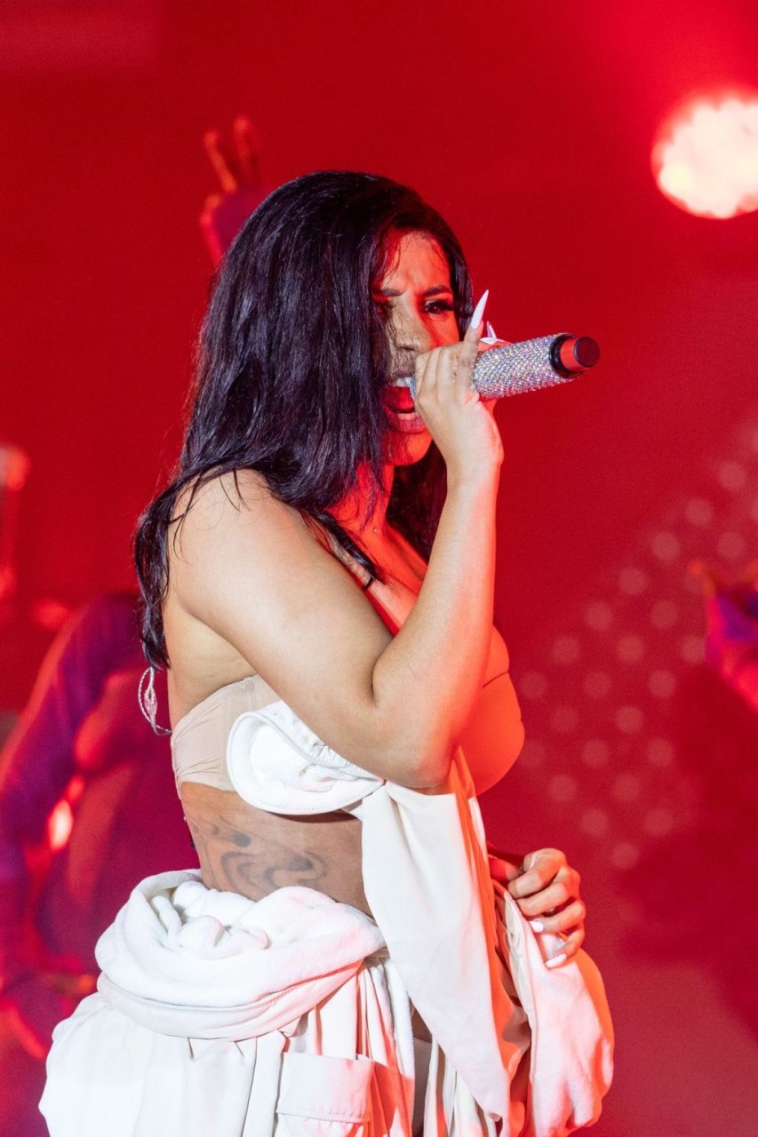 Singer Cardi B (Belcalis Almanzar) si cambia in un accappatoio per completare la sua esibizione durante il Bonnaroo Music + Arts Festival a Manchester, Tennessee, 16/06/2019.