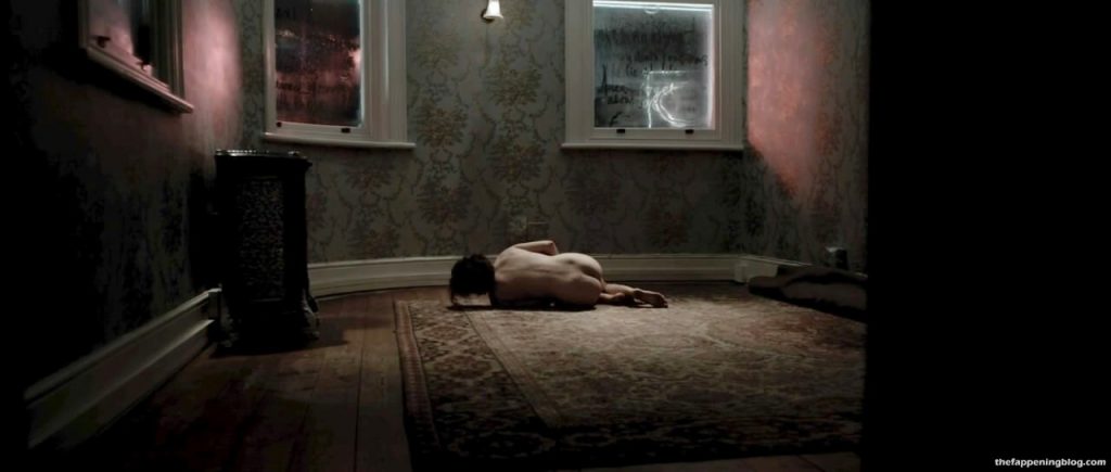 Carice van Houten è sdraiata nuda su un fianco in posizione fetale su un tappeto, mostrando il suo sedere nudo da dietro.