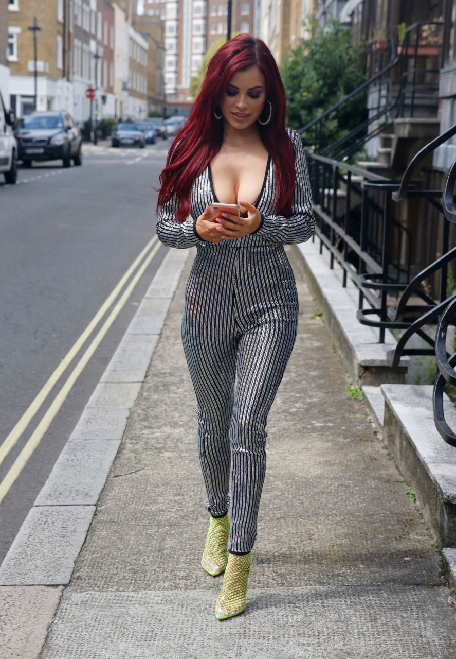 Playboy model Carla Howe è stata vista in giro per Londra indossando una tuta a righe bicolore che mostrava il suo ampio décolleté, 18/07/2019.