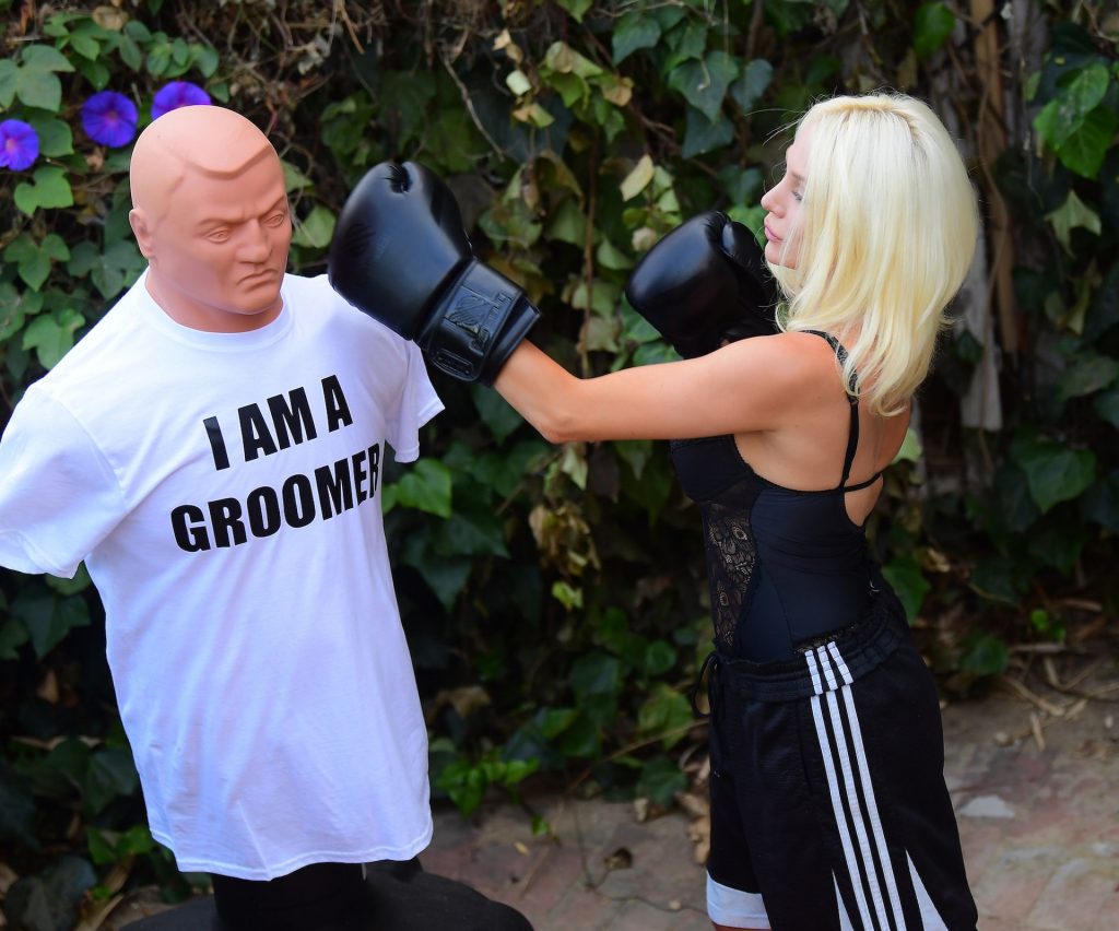 La modella/cantante formosa Courtney Stodden prende a pugni e calci il suo ex Doug Hutchinson su un manichino che indossa una maglietta con la scritta “I AM A GROOMER” a Beverly Hills, 07/07/2020.